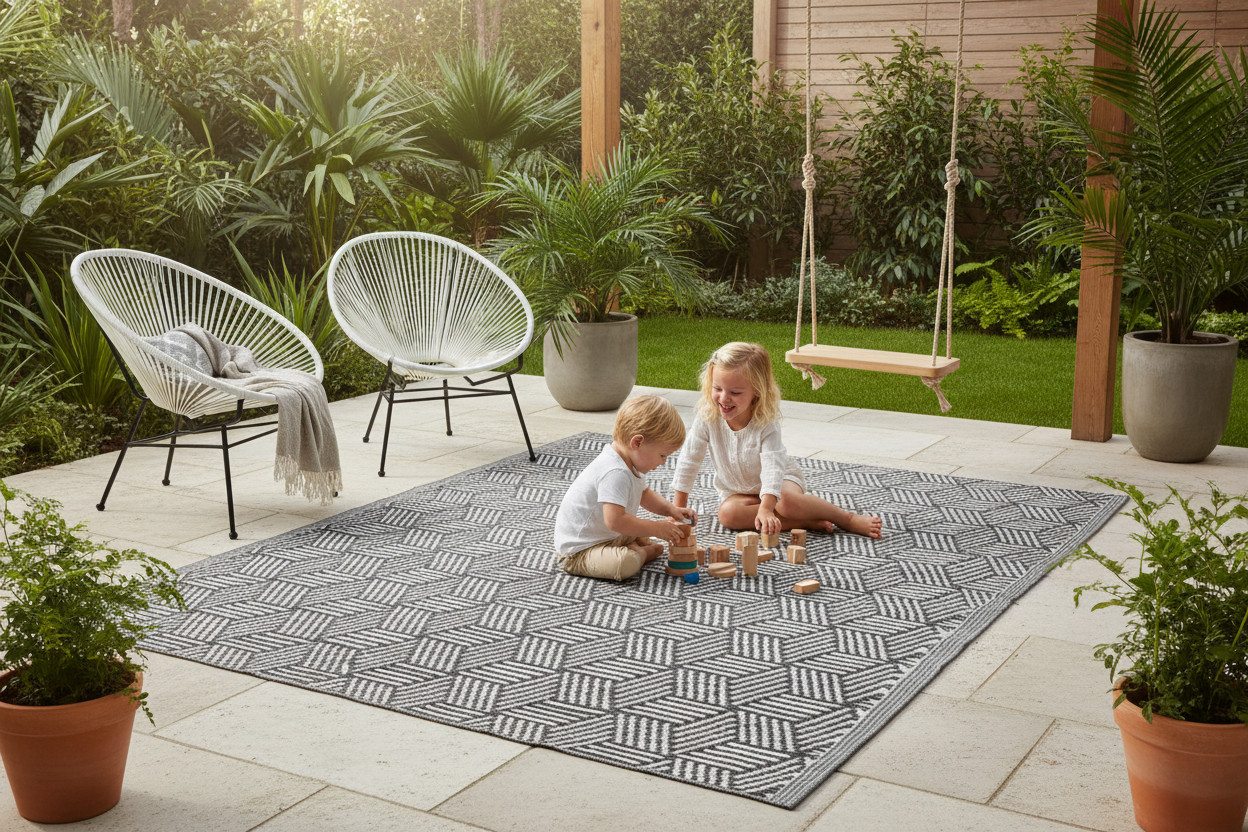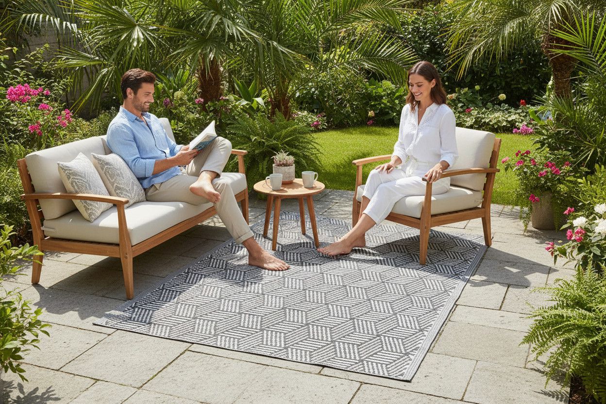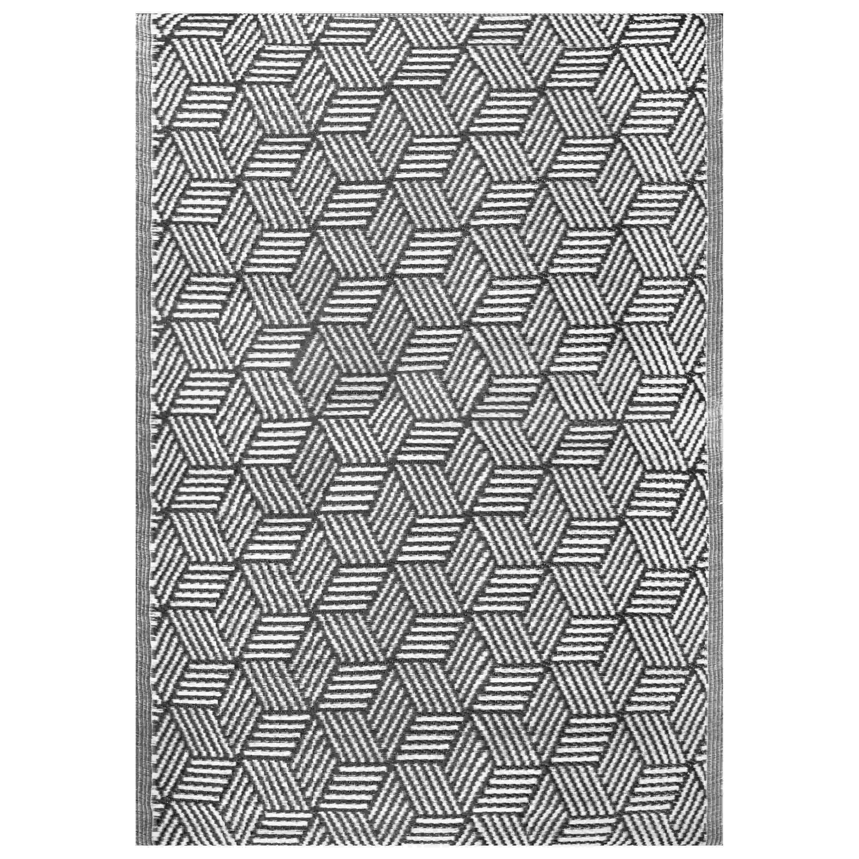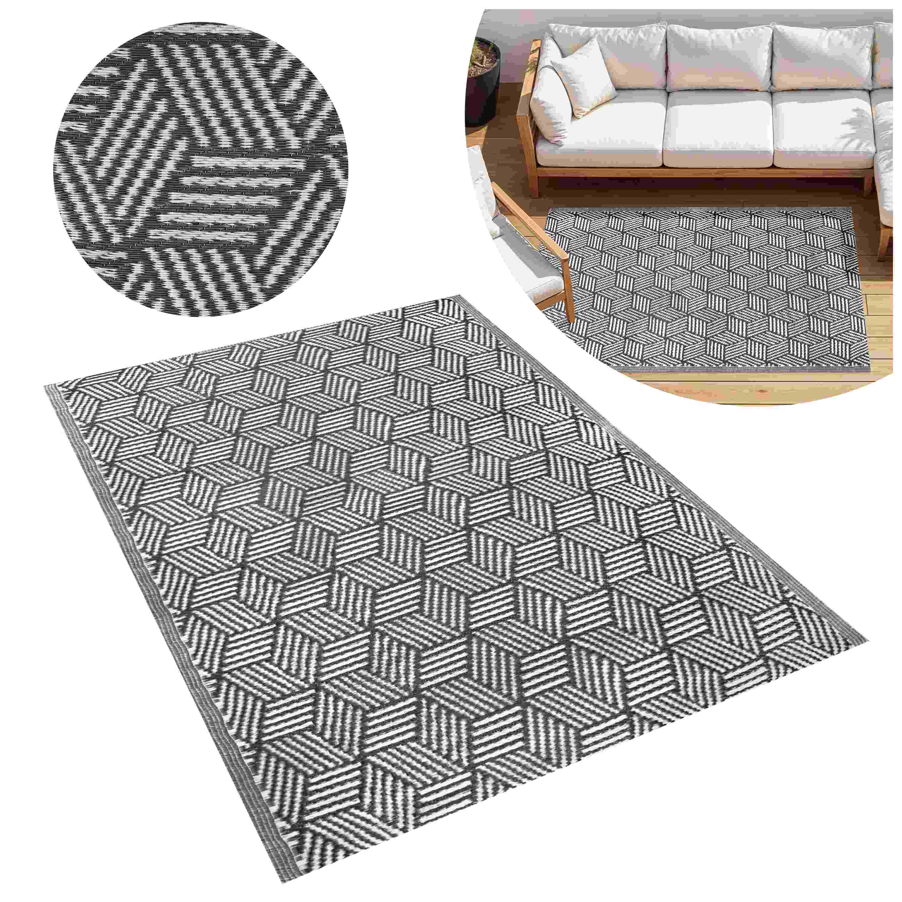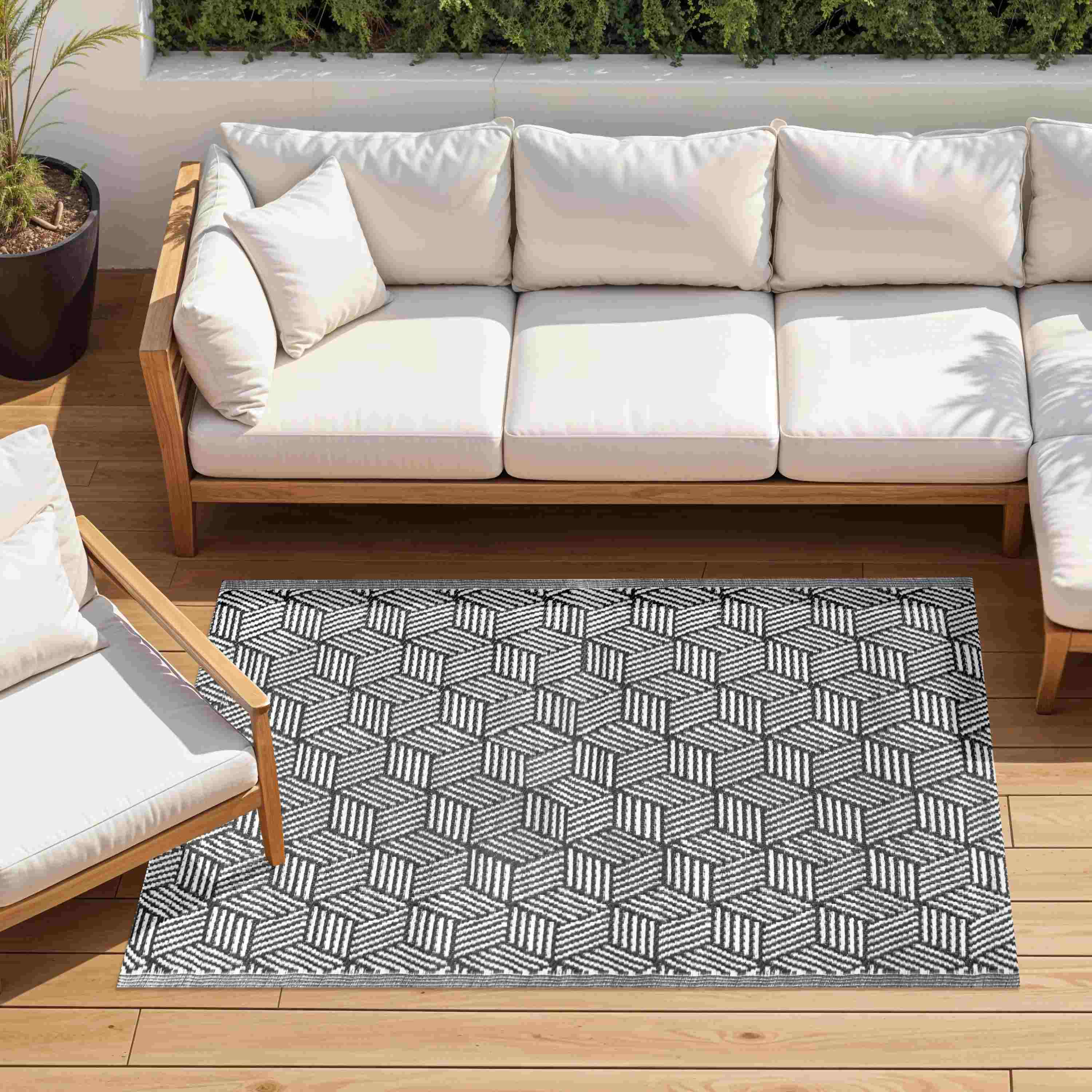 Dywan zewnętrzny AMAZE LINE to model o geometrycznym wzorze tworzącym efekt trójwymiarowej struktury (układ kostki). Kontrastowe zestawienie grafitu i jasnych linii nadaje powierzchni wyrazisty, uporządkowany charakter, który dobrze wpisuje się w nowoczesne aranżacje tarasów i balkonów.