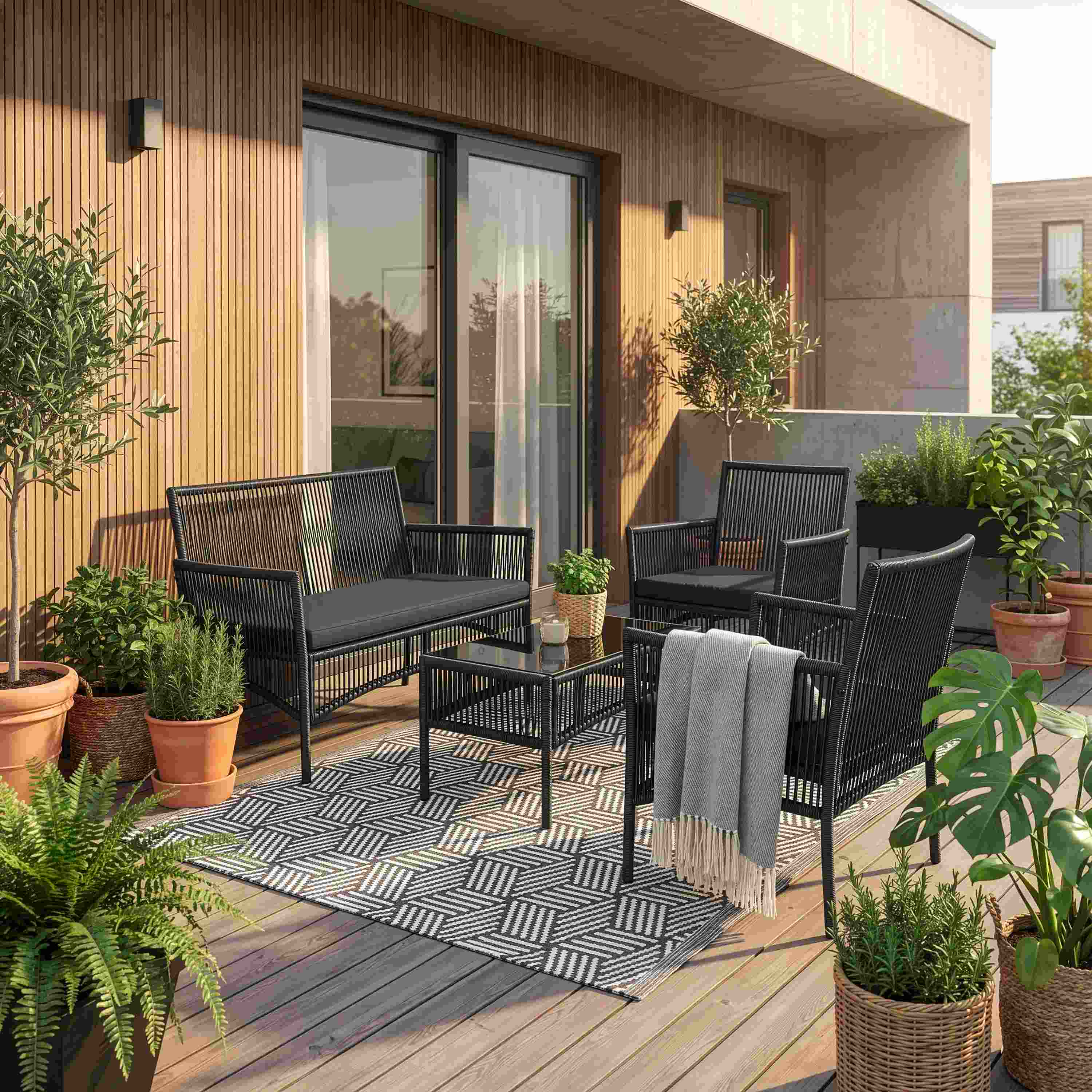 Dywan wykonany jest w technologii płaskotkanej z polipropylenu, co zapewnia odporność na wilgoć, promieniowanie UV oraz zmienne warunki atmosferyczne. Może być użytkowany zarówno na zewnątrz, jak i wewnątrz.