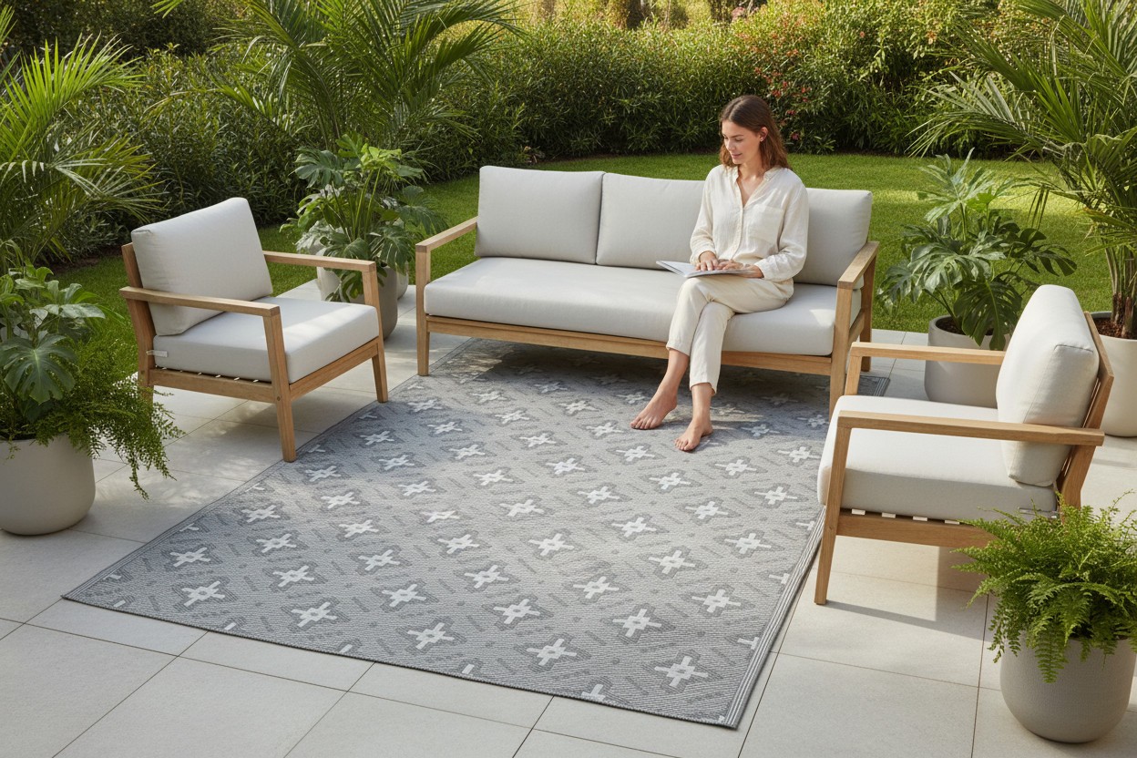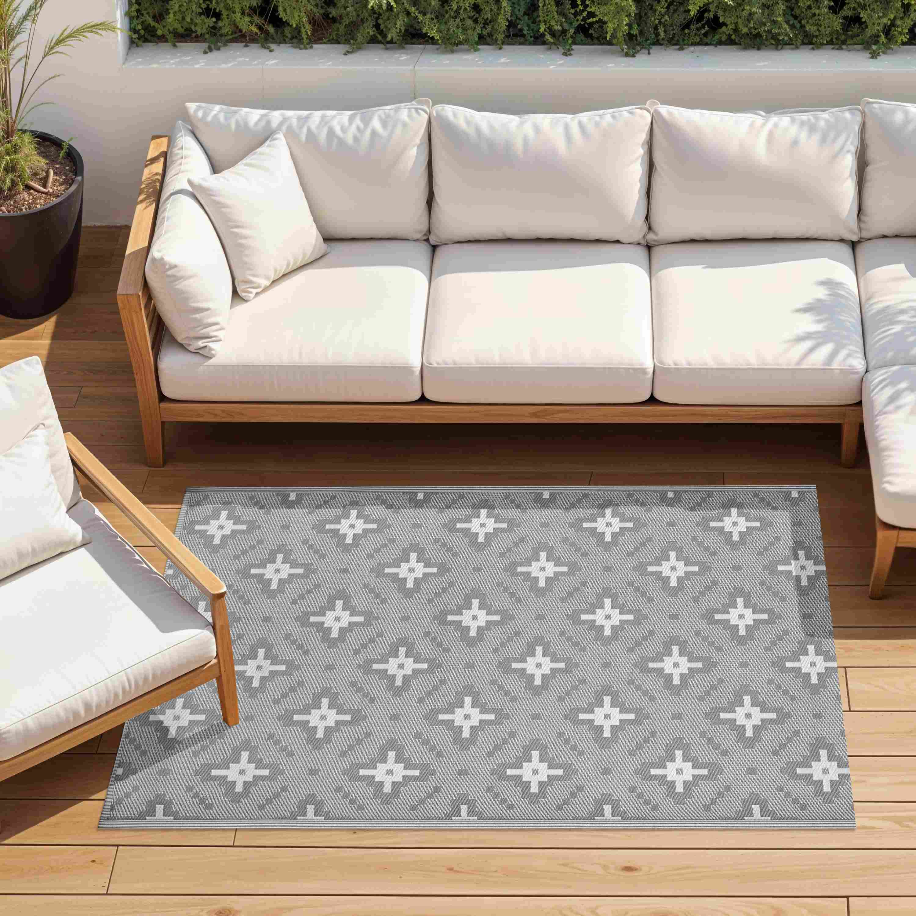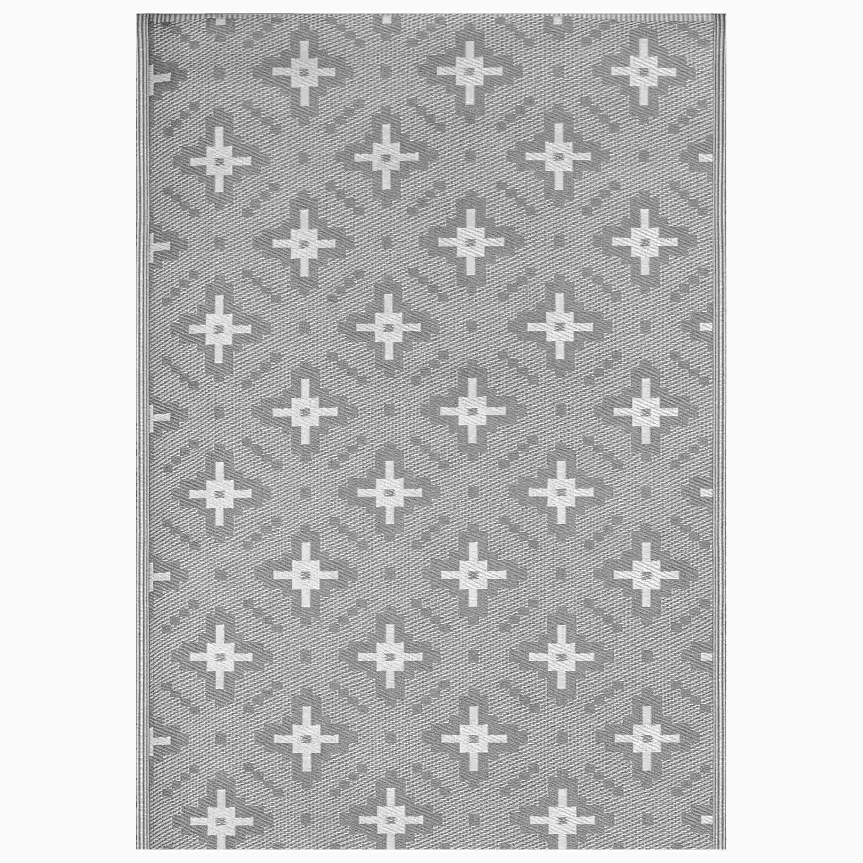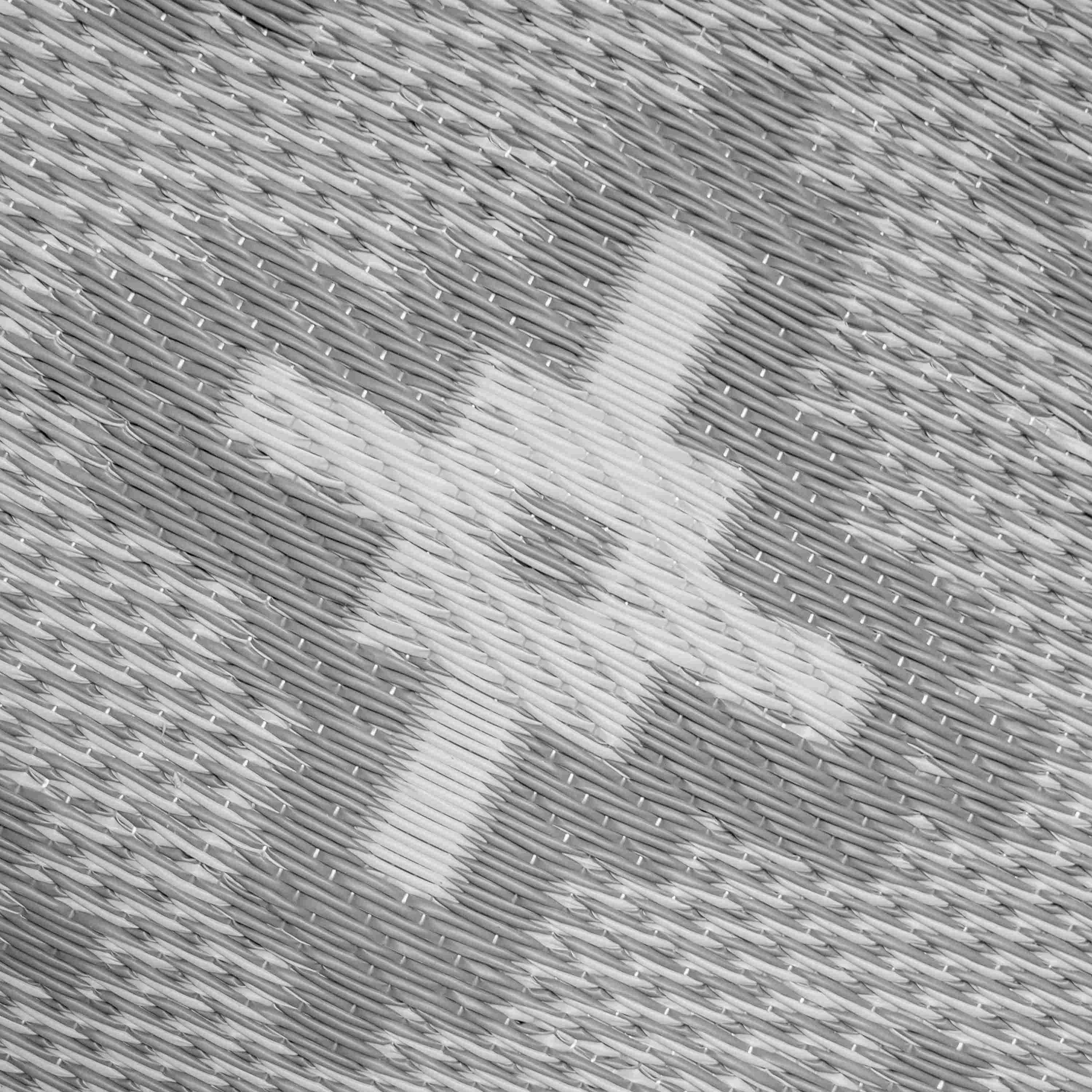 Dywan zewnętrzny BREEZE SHAPES to model oparty na geometrycznym, powtarzalnym wzorze inspirowanym motywami etnicznymi. Układ symetrycznych krzyży i rombów w odcieniach szarości tworzy neutralną bazę aranżacyjną, która dobrze współpracuje zarówno z drewnem, betonem, jak i technorattanem.