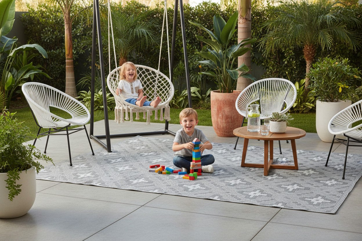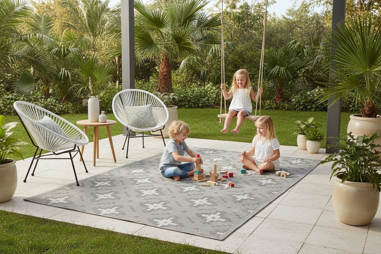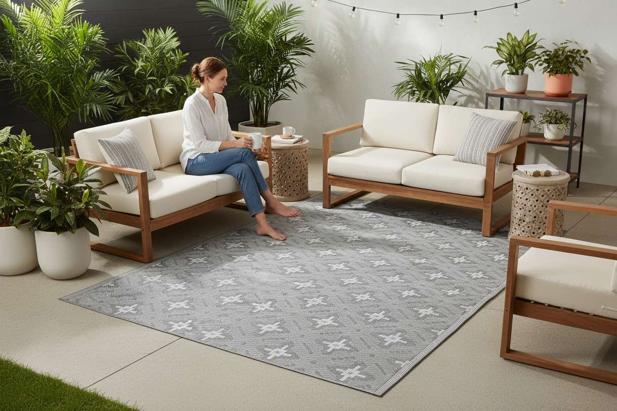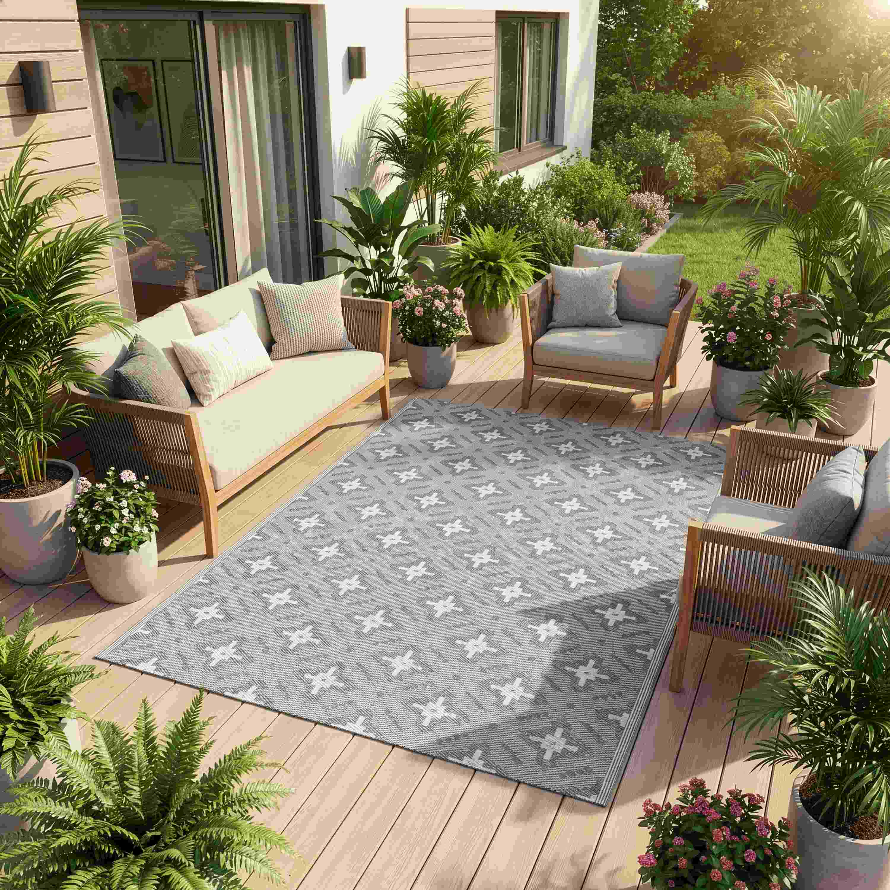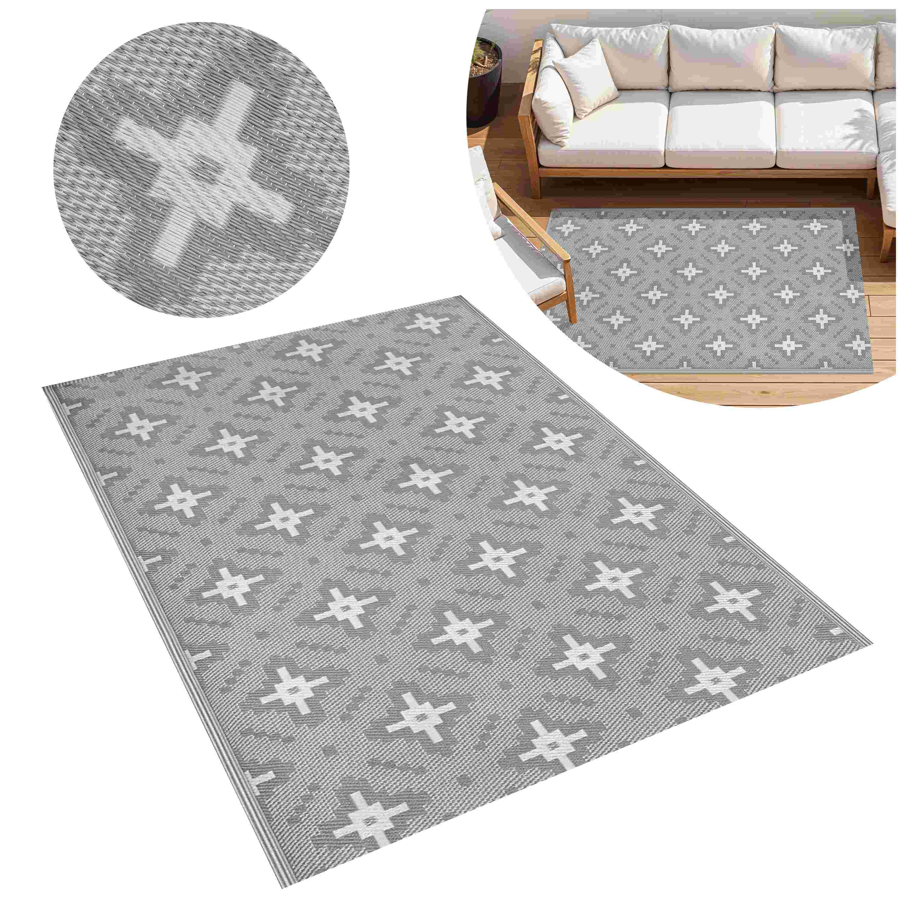 Dywan zewnętrzny BREEZE SHAPES to model oparty na geometrycznym, powtarzalnym wzorze inspirowanym motywami etnicznymi. Układ symetrycznych krzyży i rombów w odcieniach szarości tworzy neutralną bazę aranżacyjną, która dobrze współpracuje zarówno z drewnem, betonem, jak i technorattanem.