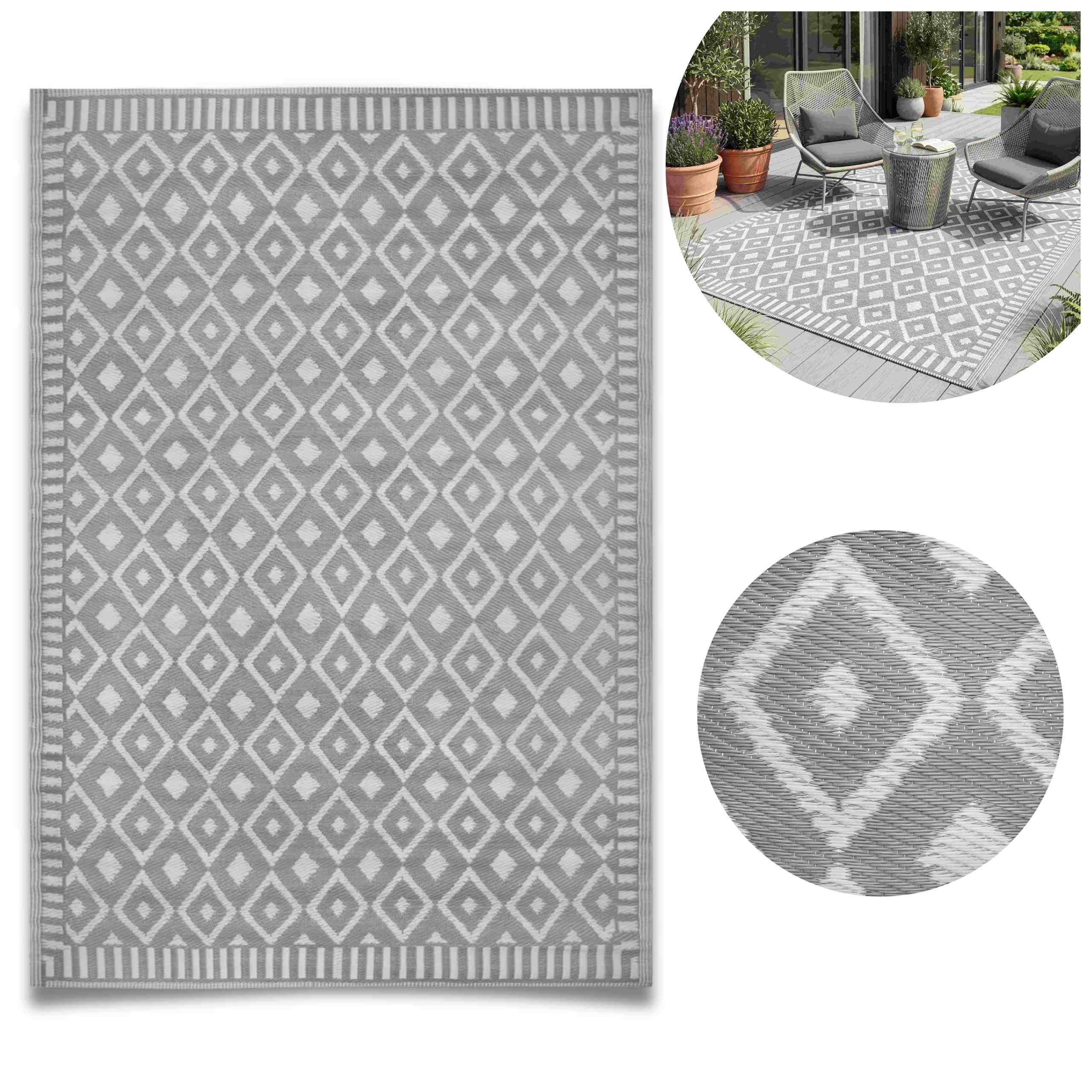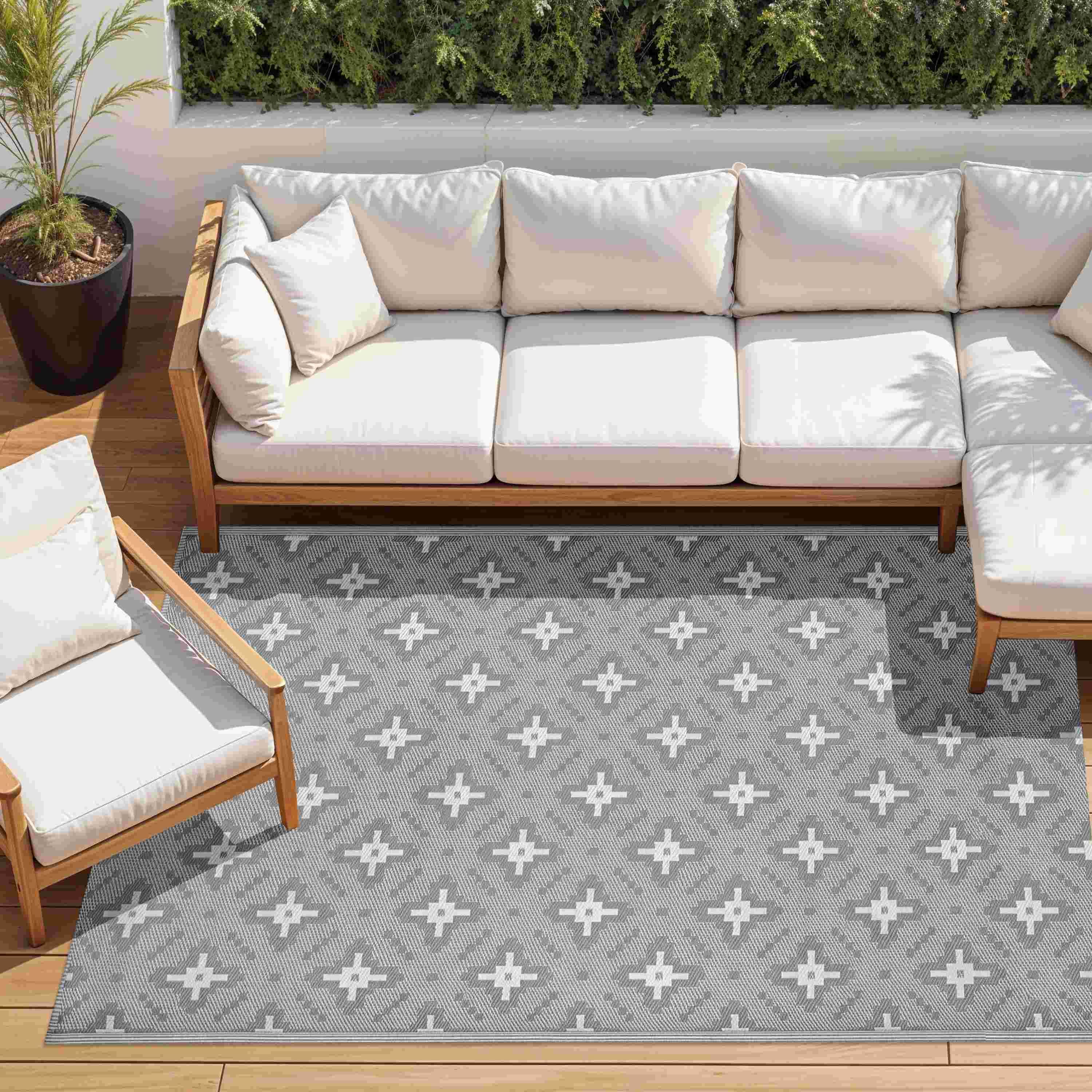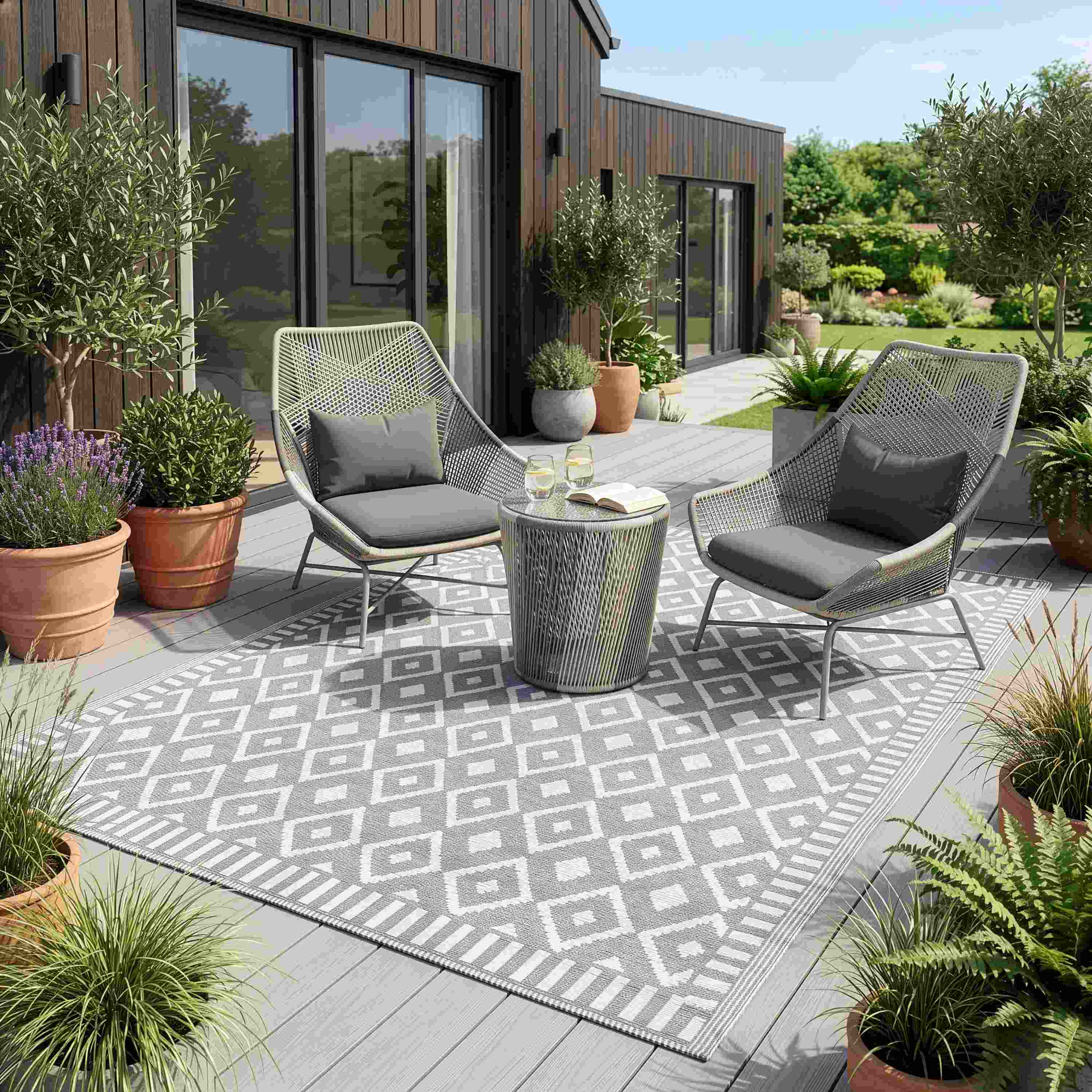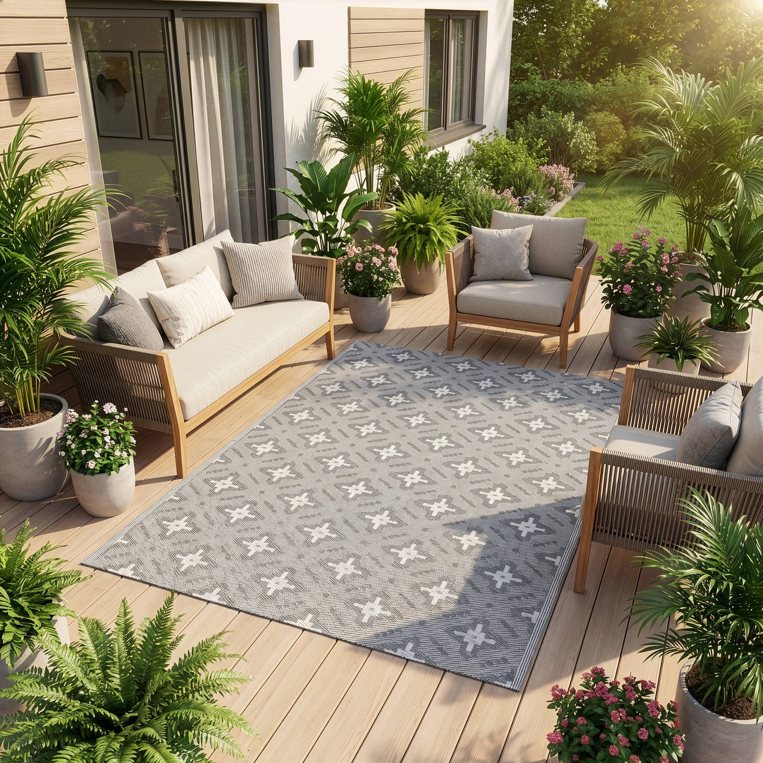 Nowoczesny dywan zewnętrzny w kolorze szarym z regularnym wzorem geometrycznym (romby). Wzór jest powtarzalny i symetryczny, co porządkuje wizualnie przestrzeń i dobrze komponuje się z meblami drewnianymi oraz jasnymi poduchami.