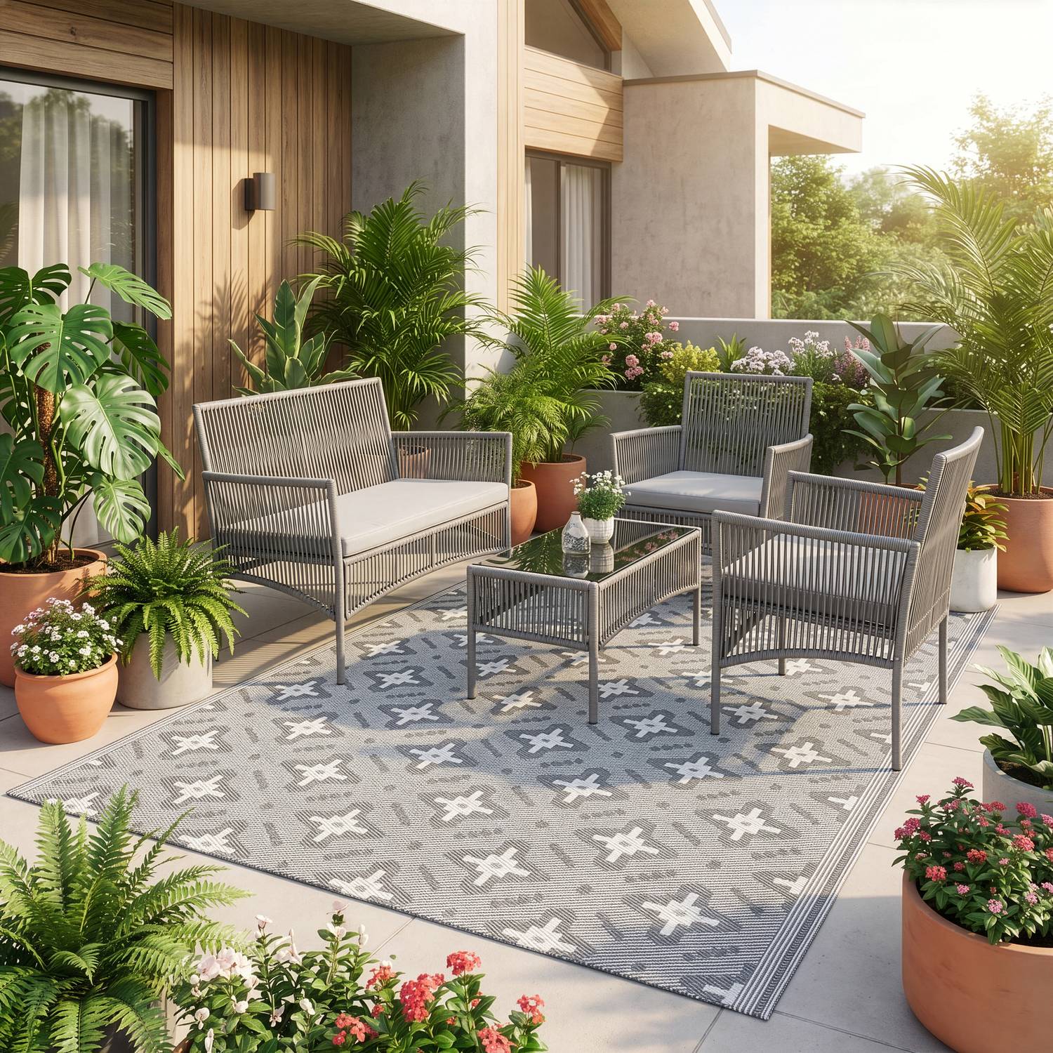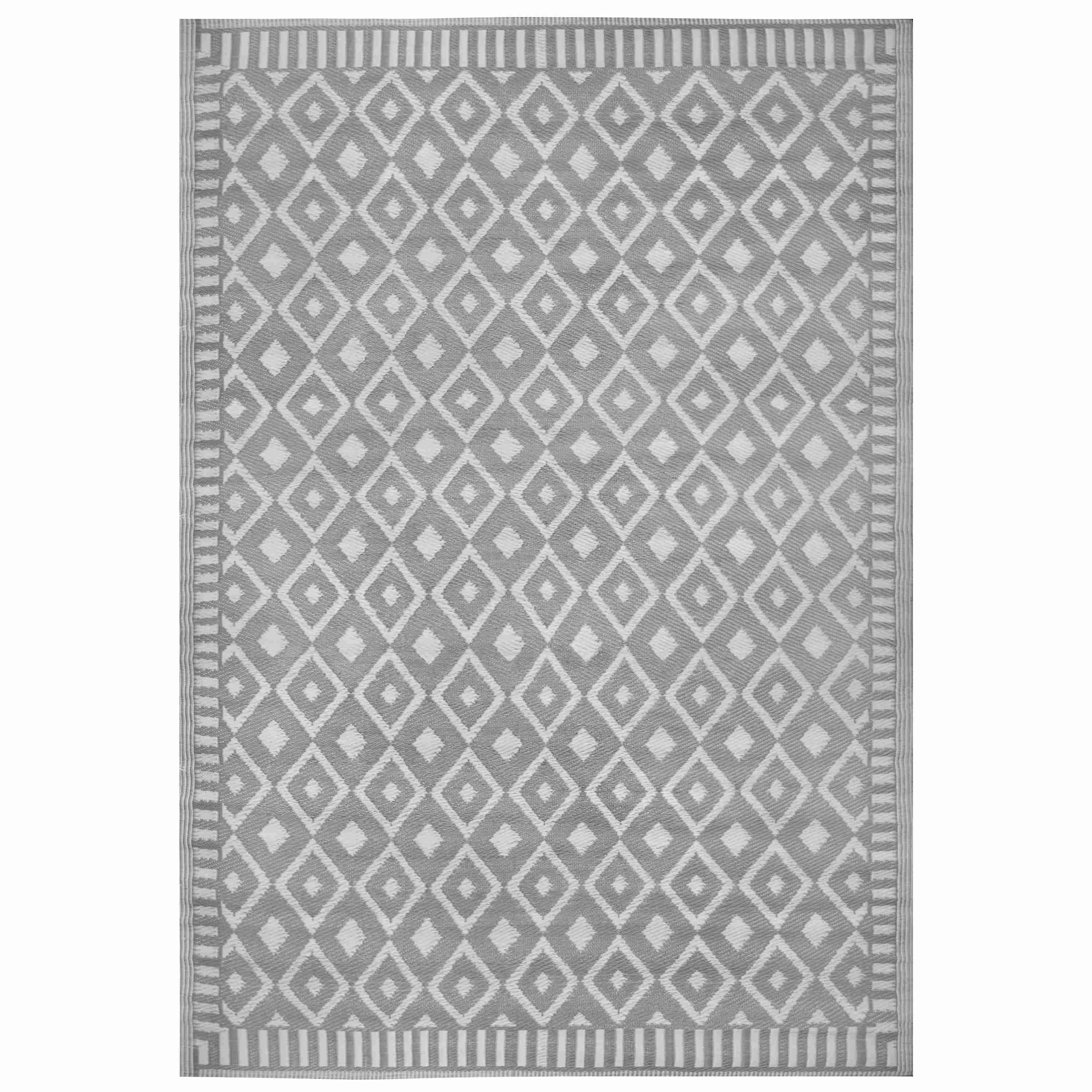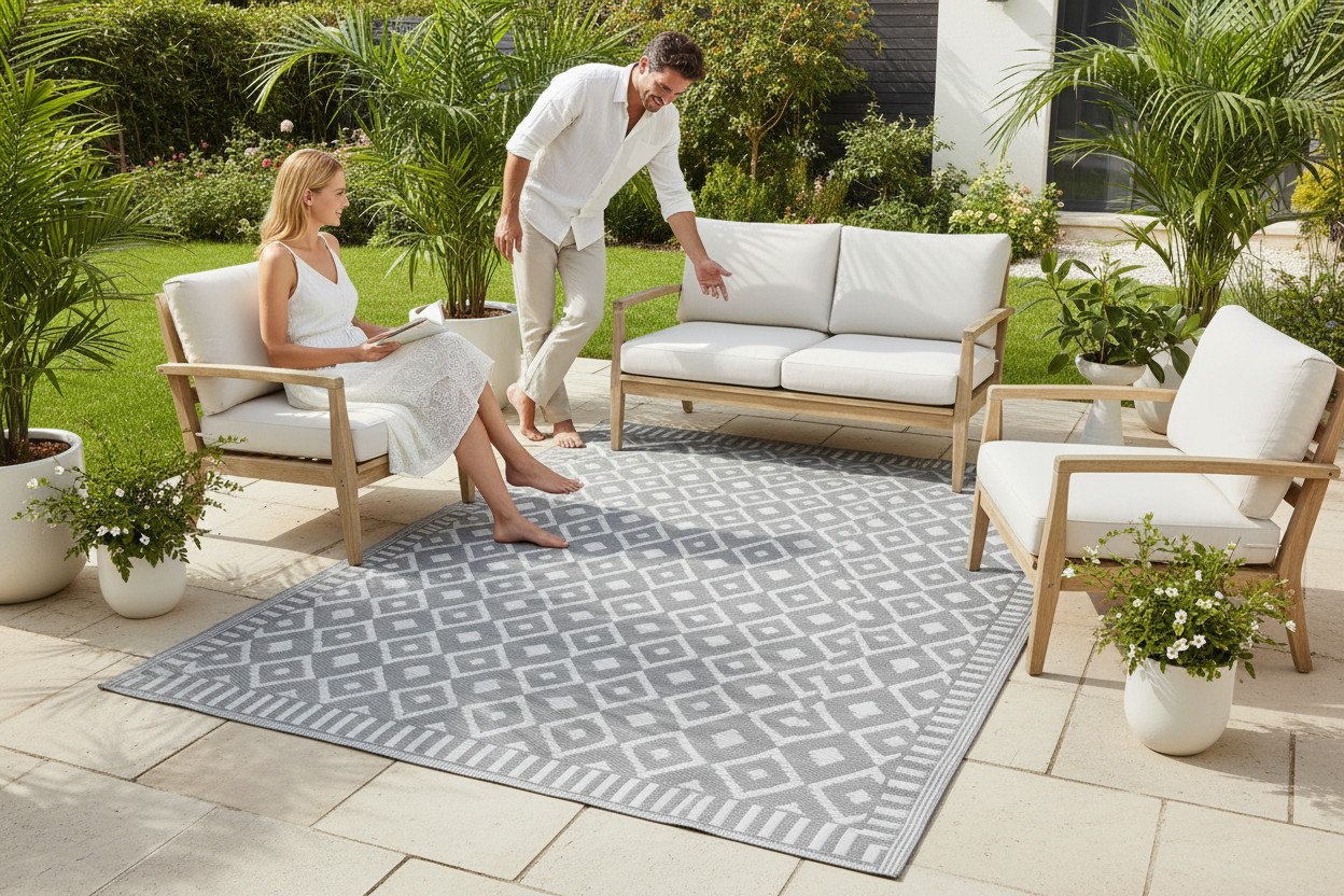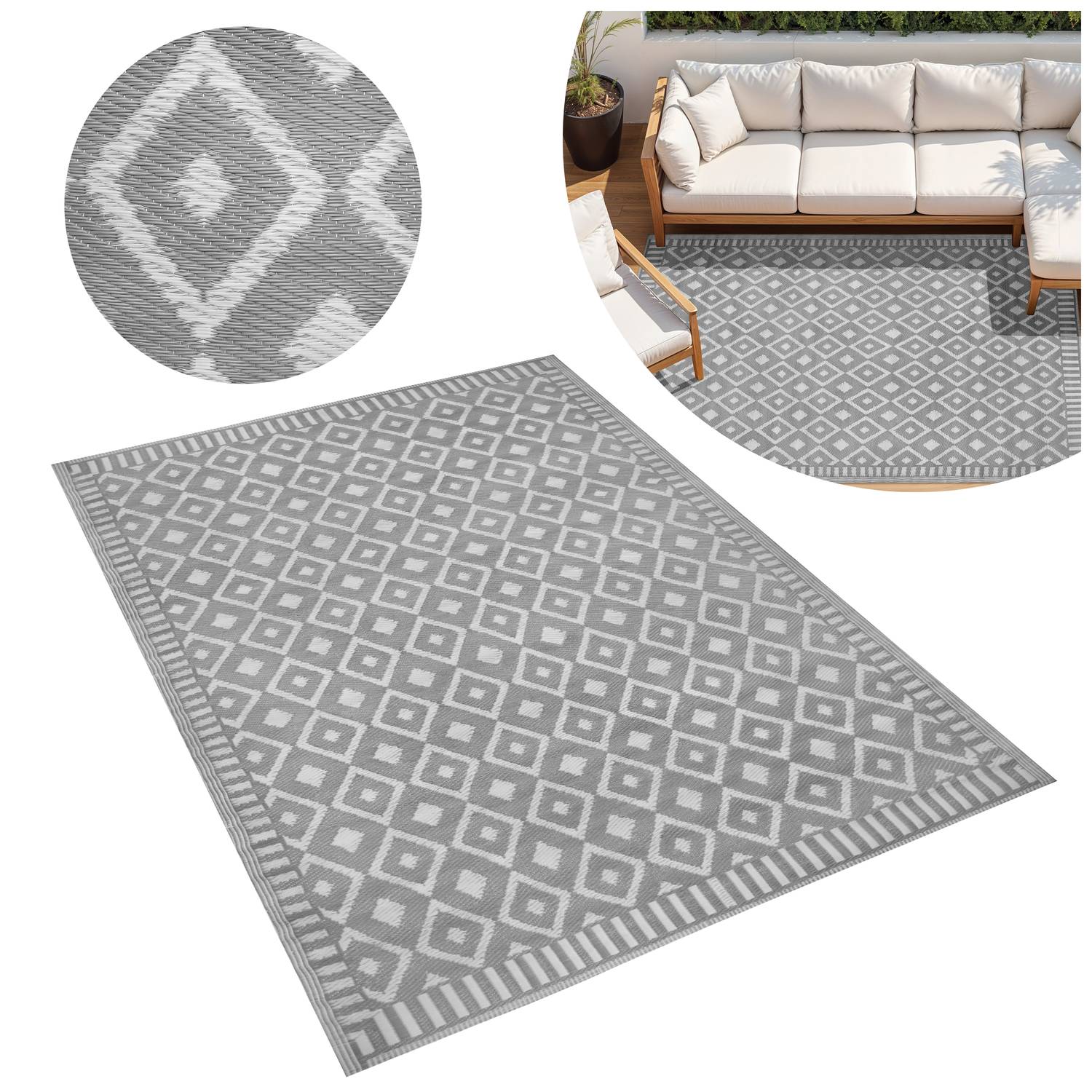 Nowoczesny dywan zewnętrzny w kolorze szarym z regularnym wzorem geometrycznym (romby). Wzór jest powtarzalny i symetryczny, co porządkuje wizualnie przestrzeń i dobrze komponuje się z meblami drewnianymi oraz jasnymi poduchami.