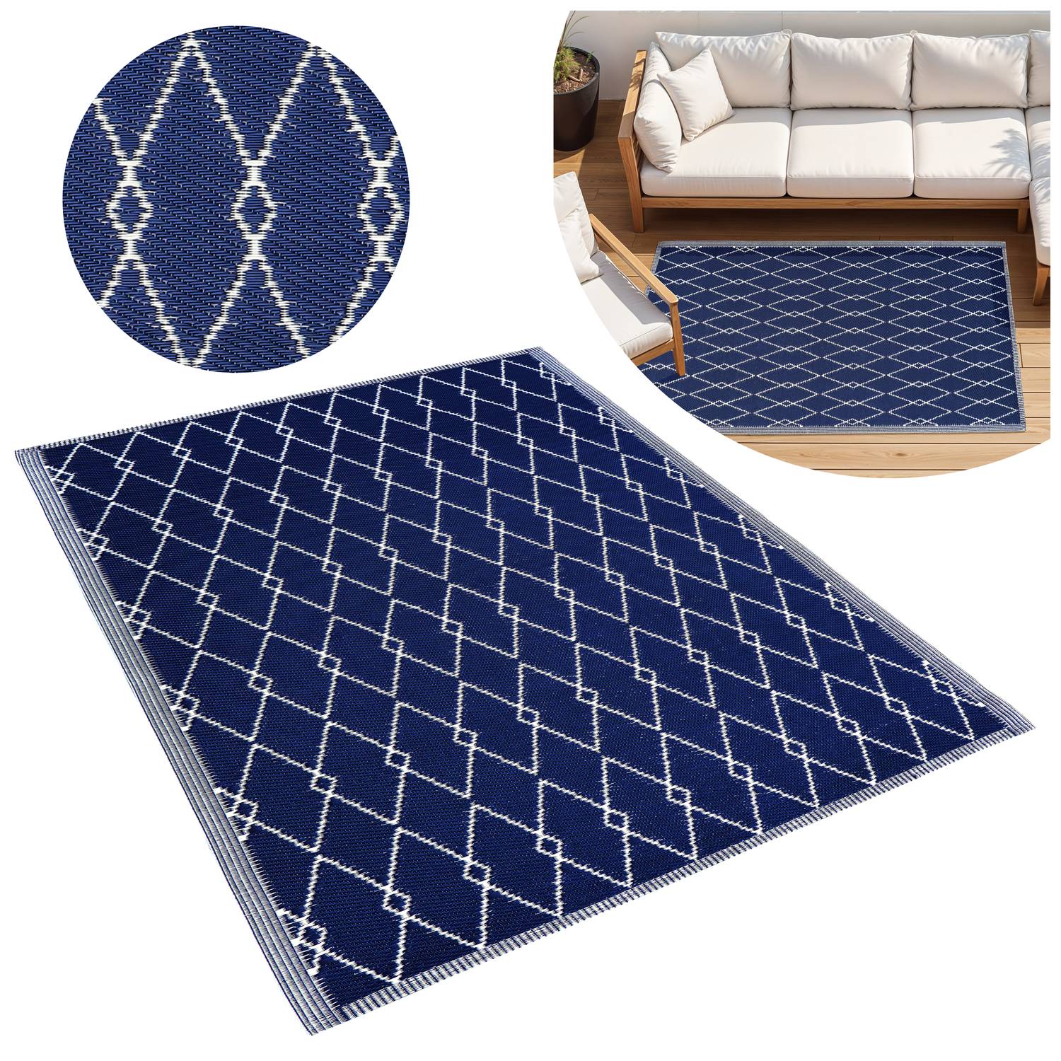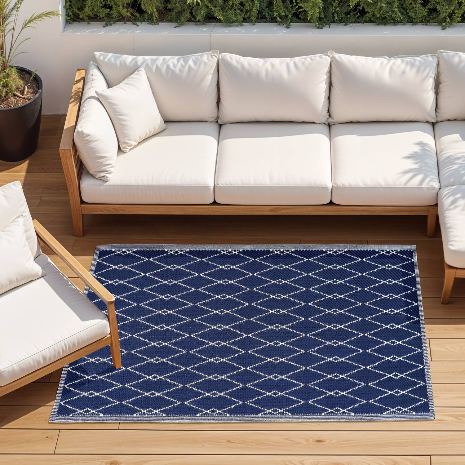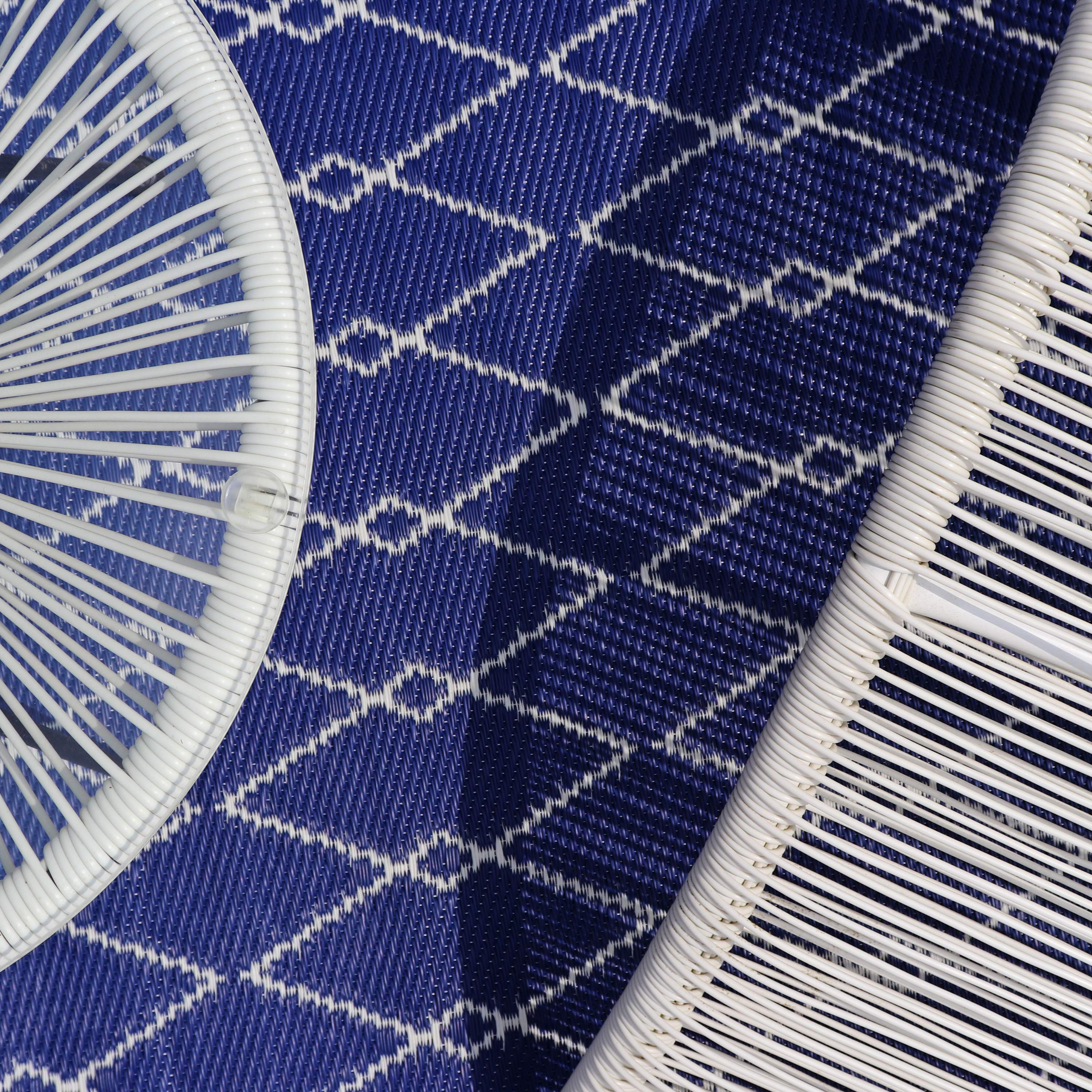 Nowoczesny dywan zewnętrzny w kolorze granatowo-niebieskim z kontrastowym, białym wzorem geometrycznej siatki. Wzór rombów z drobnymi detalami tworzy uporządkowaną strukturę wizualną i dobrze maskuje zabrudzenia w codziennym użytkowaniu.