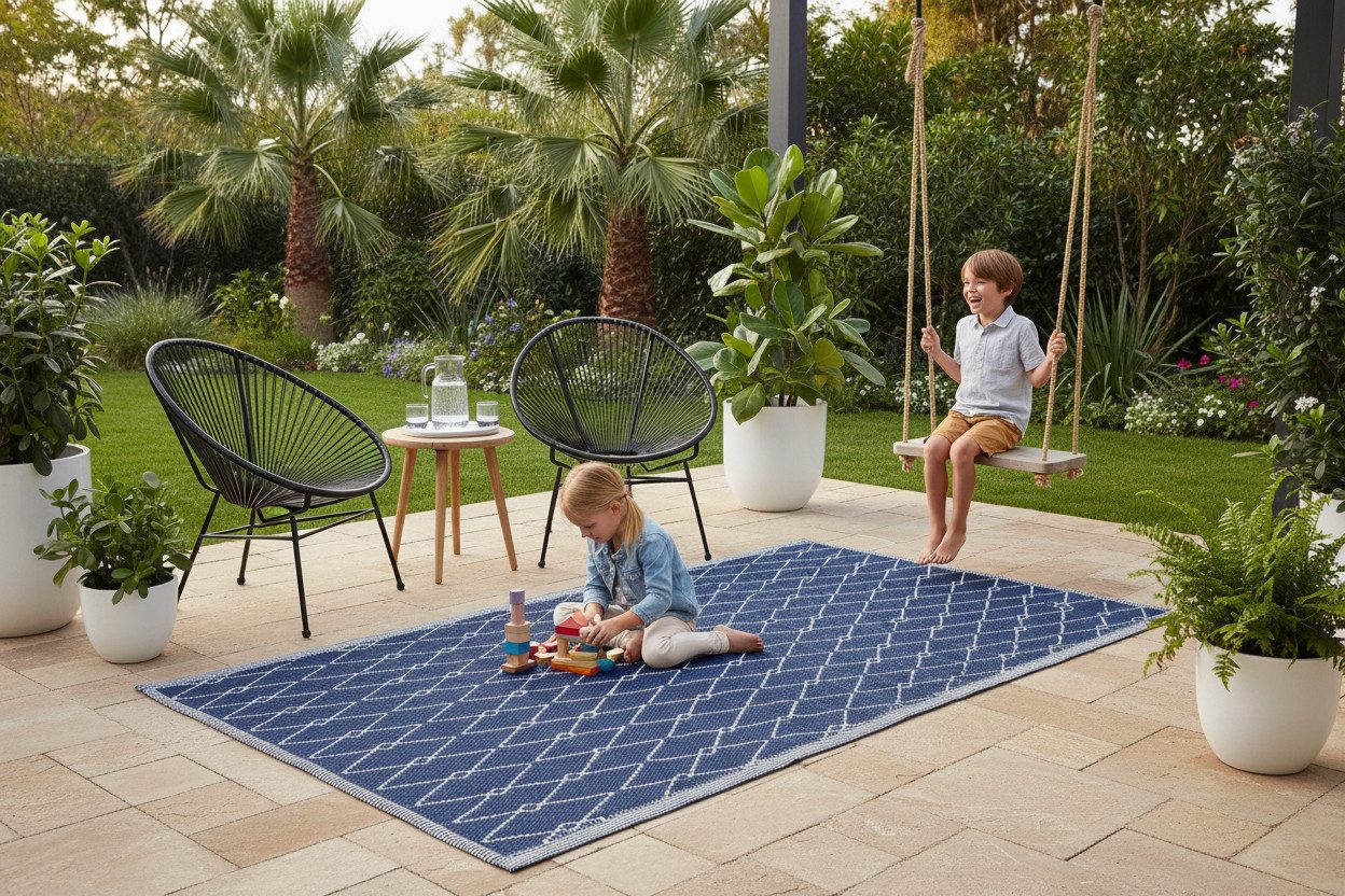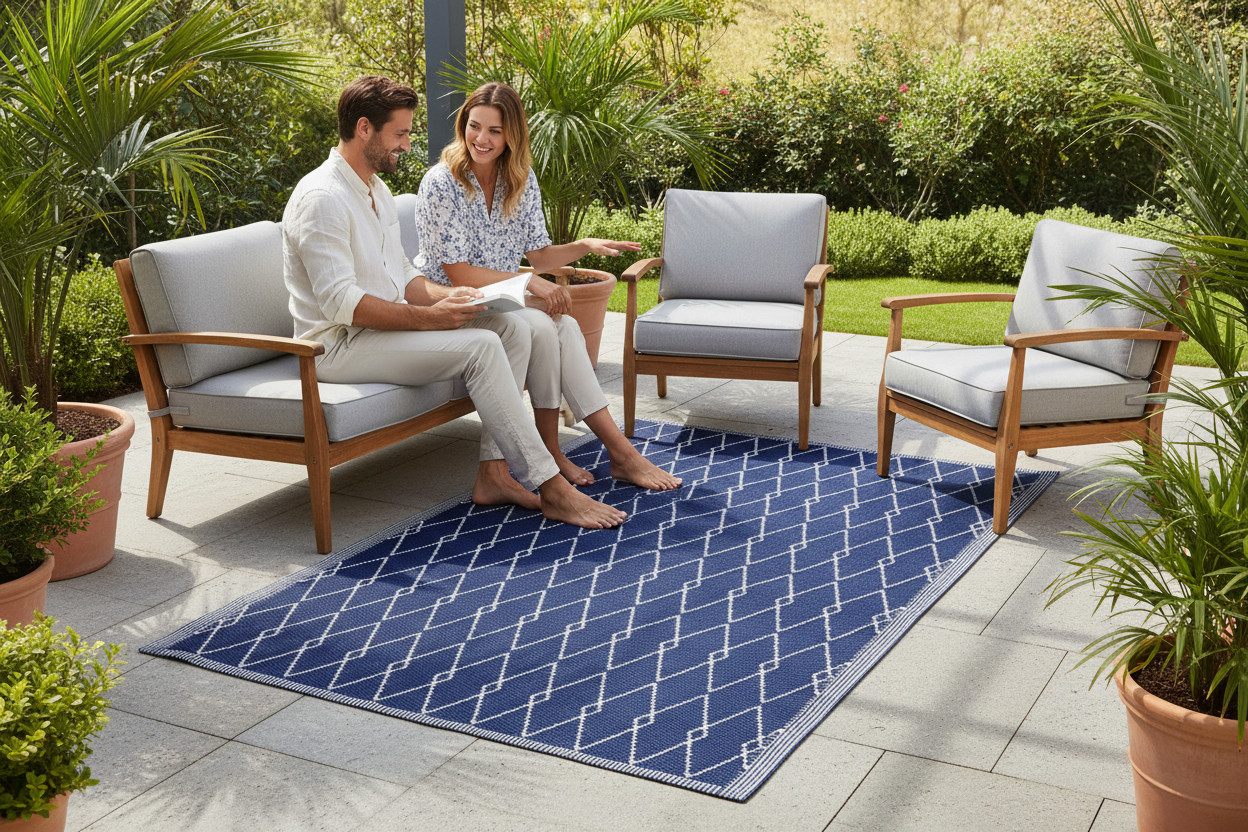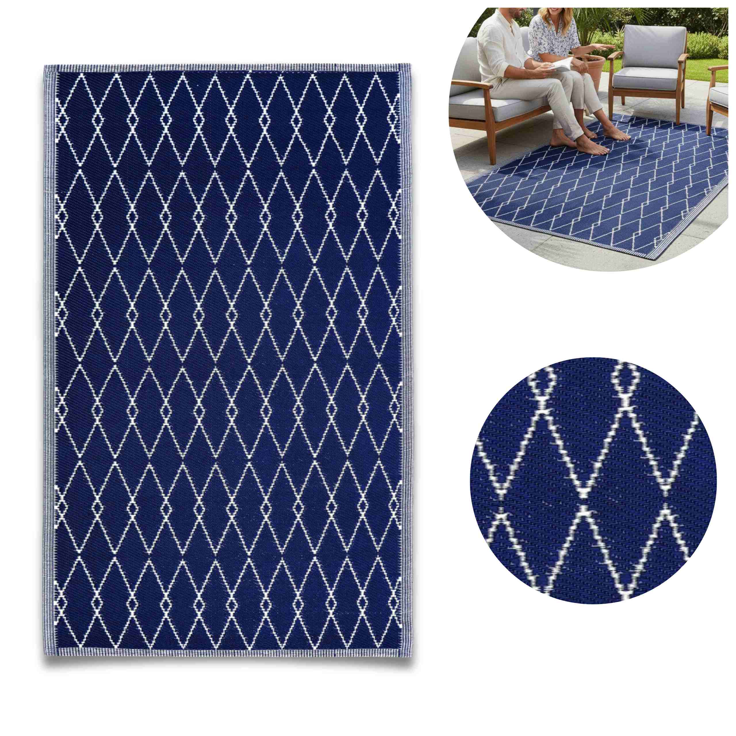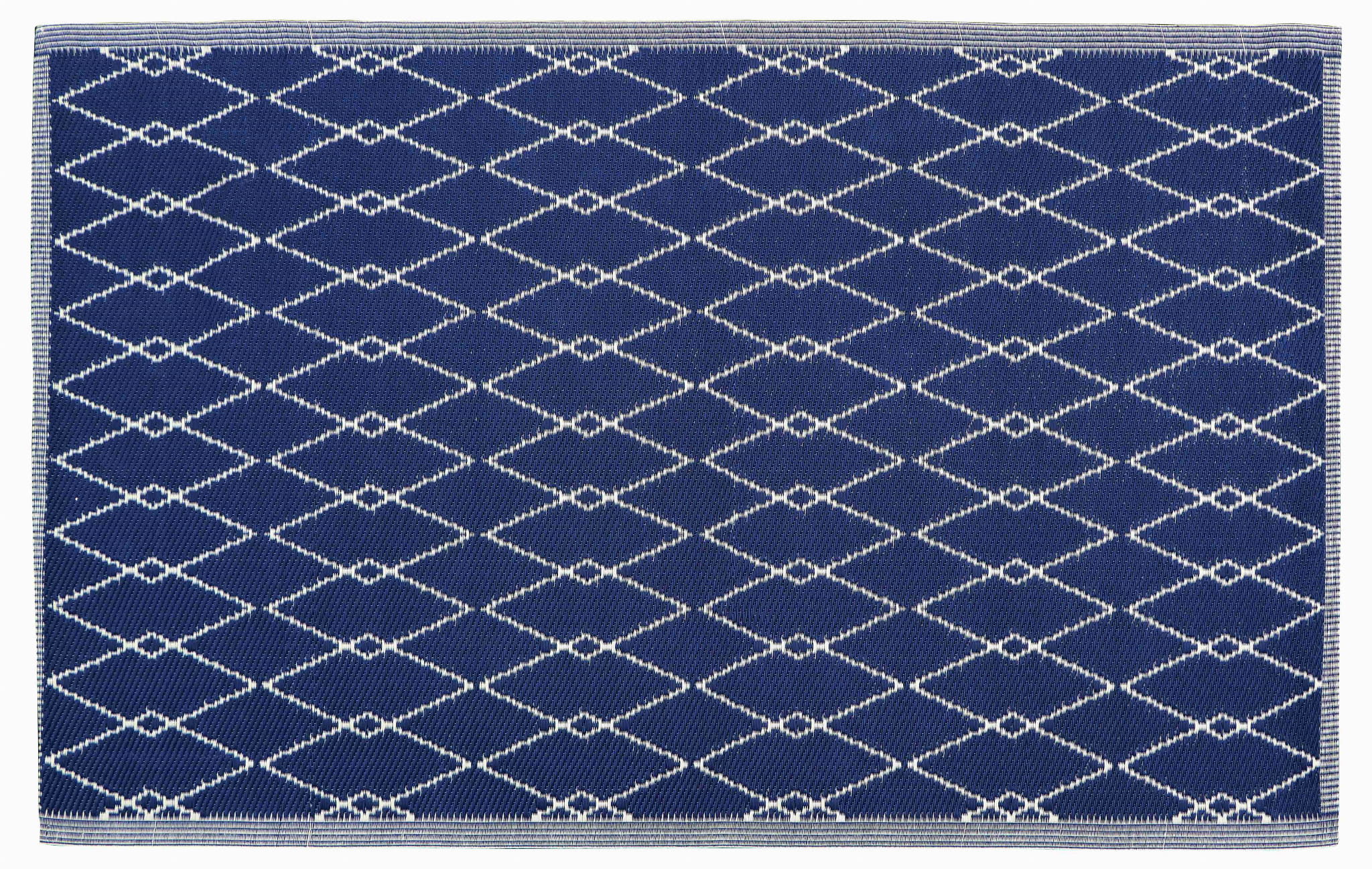 Nowoczesny dywan zewnętrzny w kolorze granatowo-niebieskim z kontrastowym, białym wzorem geometrycznej siatki. Wzór rombów z drobnymi detalami tworzy uporządkowaną strukturę wizualną i dobrze maskuje zabrudzenia w codziennym użytkowaniu.