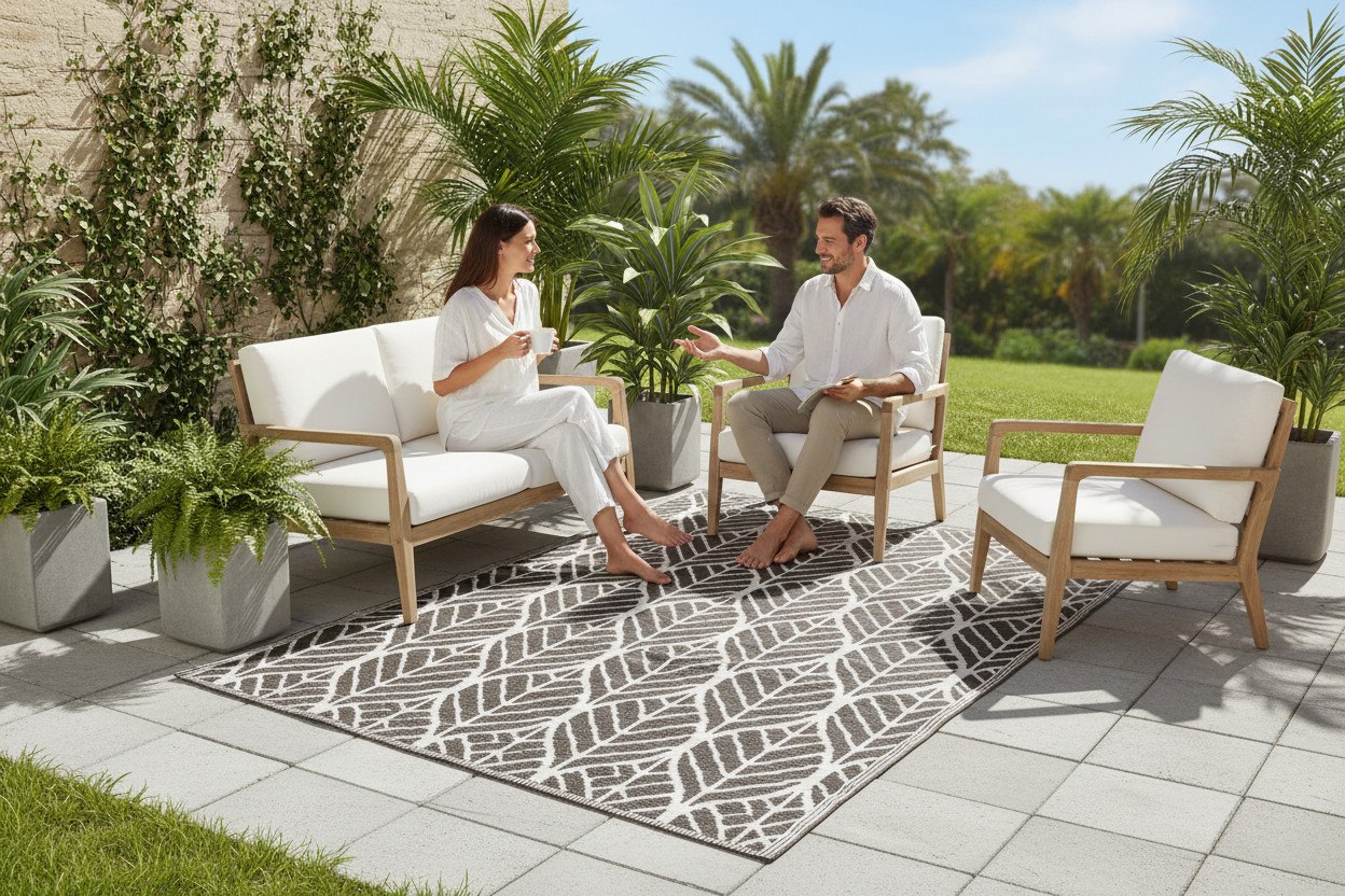 Dywan zewnętrzny z geometryczno-roślinnym wzorem inspirowanym układem liści. Kolorystyka brązowo-biała dobrze komponuje się z drewnem, technorattanem oraz neutralnymi aranżacjami tarasów i balkonów.