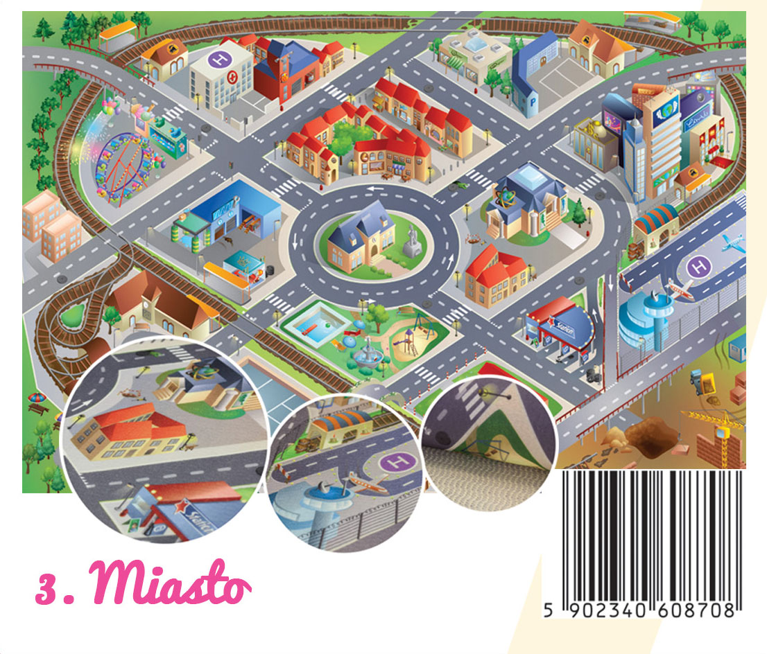 Produkt dostępny jest w rozmiarze 75x112cm. Wierzchnia warstwa została wykonana z wysokiej jakości poliestrowego materiału, na spodzie umieszczona jest antypoślizgowa guma, która zapobiega ewentualnemu przesuwaniu się. Specjalna technologia druku pozwala na niezwykle szczegółowe i wyjątkowe odwzorowanie szczegółów takich jak ulice, budynki, lampy a także zwierzęta. Nadruk na dywanie sprawia wrażenie 3D.