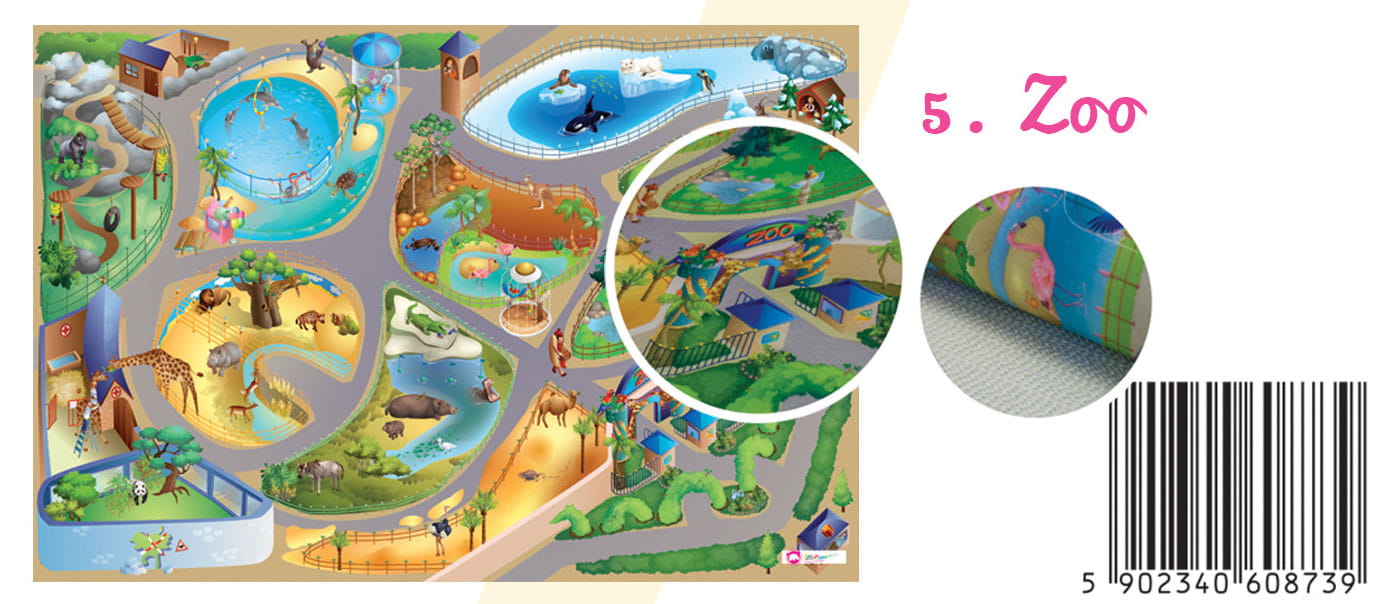 Produkt dostępny jest w rozmiarze 75x112cm. Wierzchnia warstwa została wykonana z wysokiej jakości poliestrowego materiału, na spodzie umieszczona jest antypoślizgowa guma, która zapobiega ewentualnemu przesuwaniu się. Specjalna technologia druku pozwala na niezwykle szczegółowe i wyjątkowe odwzorowanie szczegółów takich jak ulice, budynki, lampy a także zwierzęta. Nadruk na dywanie sprawia wrażenie 3D.