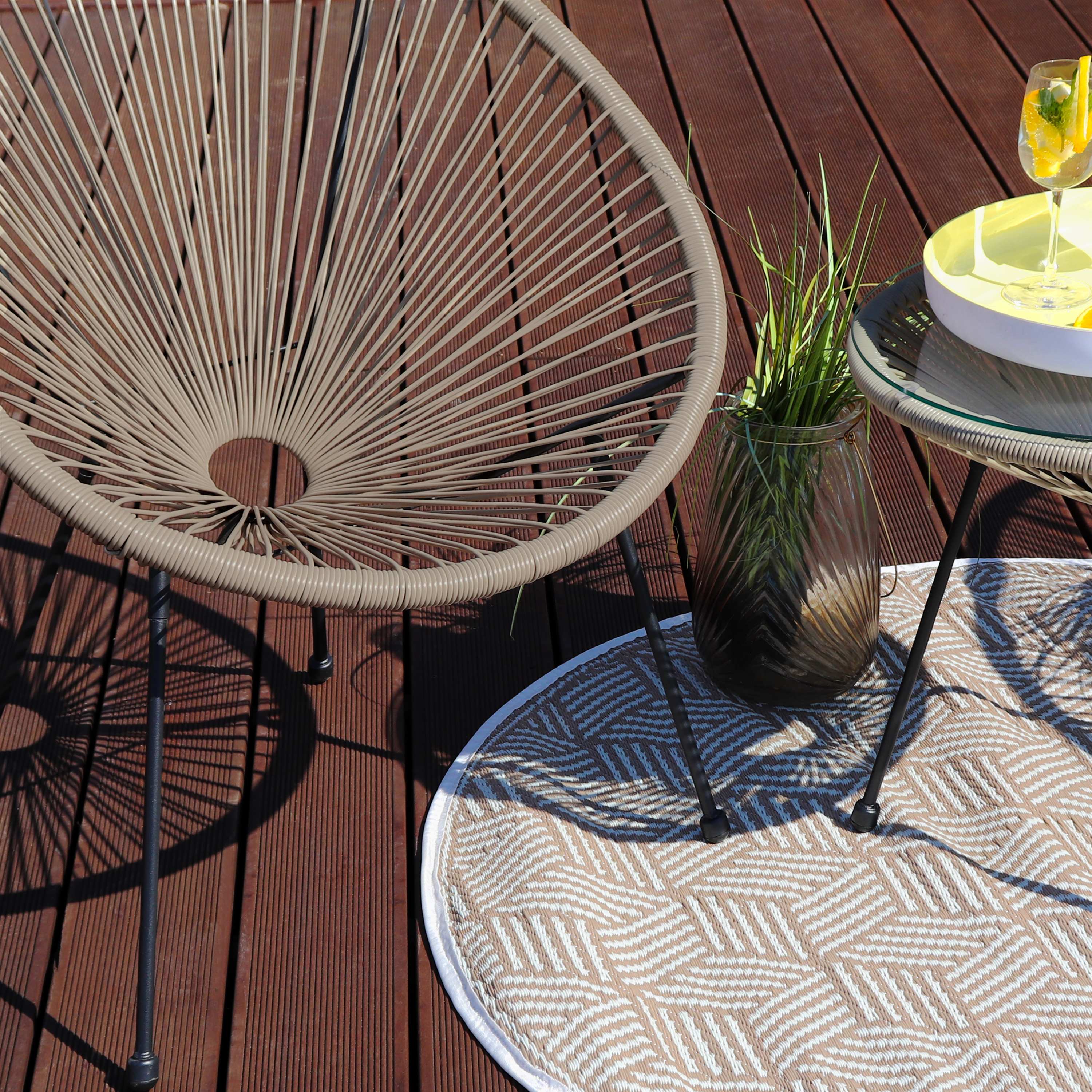 Siedzisko fotela zostało wykonane z syntetycznych rattanowych żyłek, które nie tylko zapewniają komfort użytkowania ale również świetnie prezentują się na tle ogrodu i nowoczesnym wyglądem ozdobią każdą przestrzeń. Kształt siedziska zapewnia komfort, a obręcz koła jest jednocześnie oparciem i podłokietnikami. Atutem krzesła jest również sposób pielęgnacji. Wystarczy przetrzeć krzesło wilgotną ściereczką.