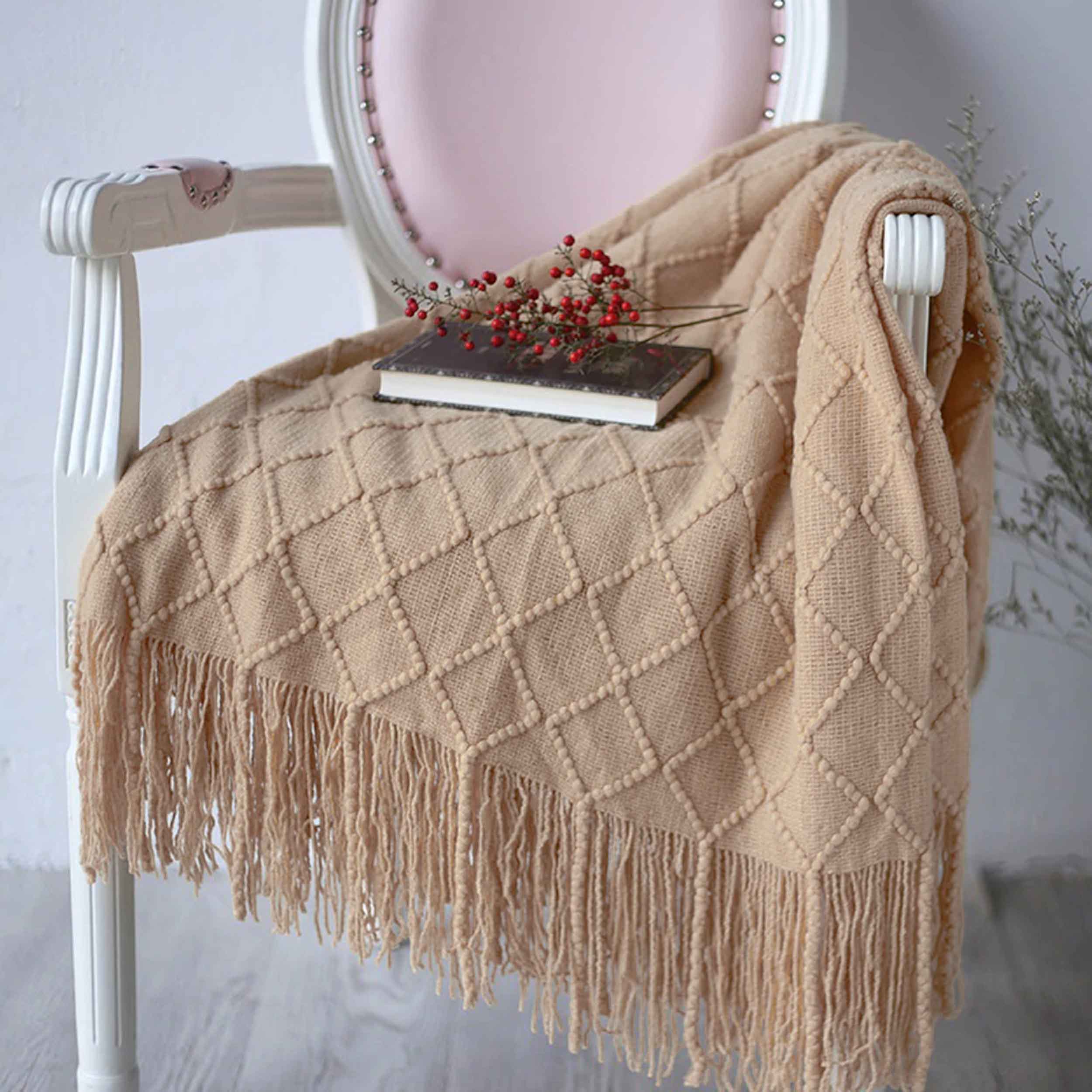 koc akrylowy, pled dzianinowy, koc 130x170, koc z frędzlami, koc skandynawski, narzuta, koc knit, koc do salonu, koc do sypialni, Domarex, OEKO-TEX Standard 100