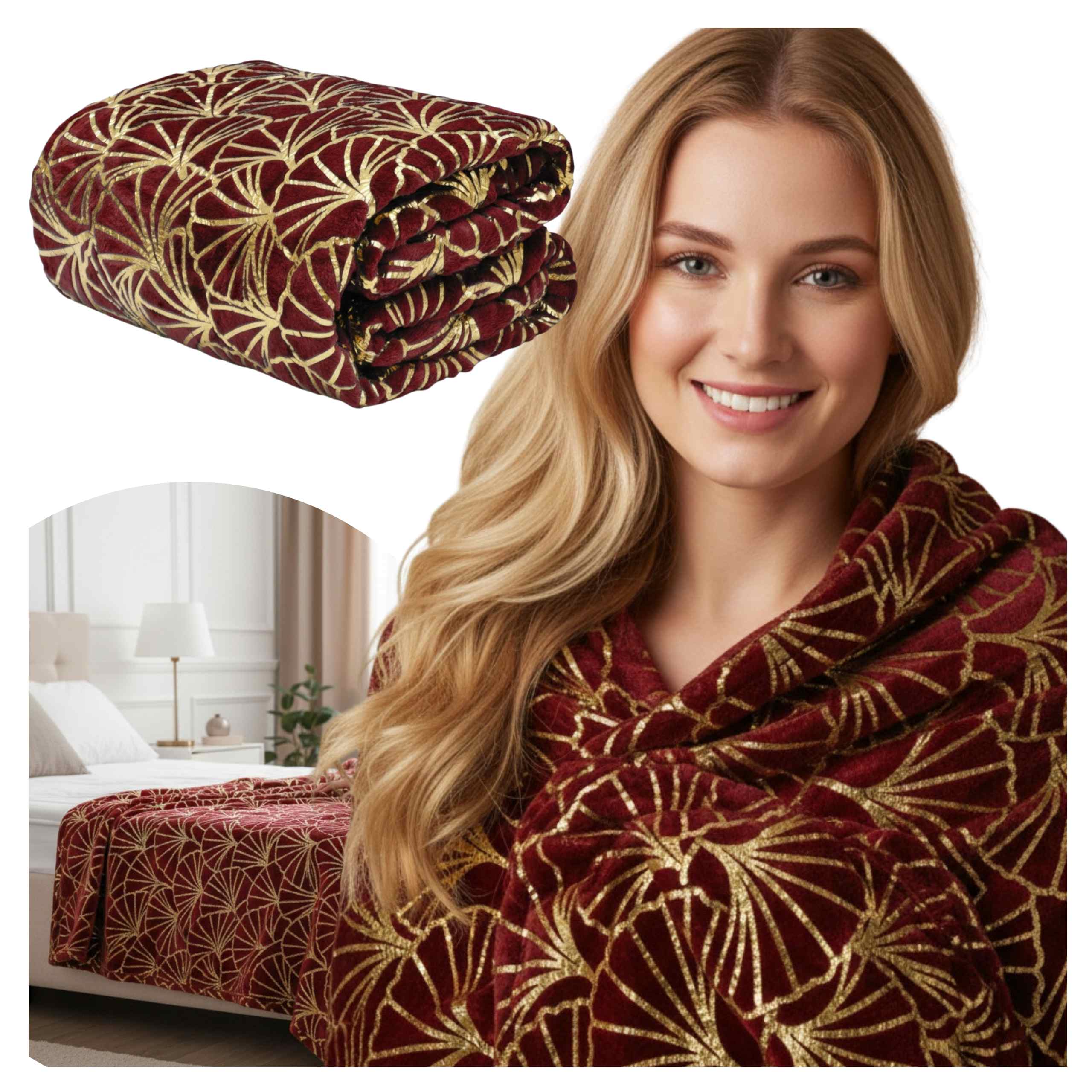 Koc GINKGO GOLD Bordo + Złoto 150x200 cm – Luksusowa Kolekcja Gold Deco