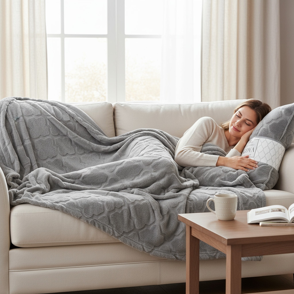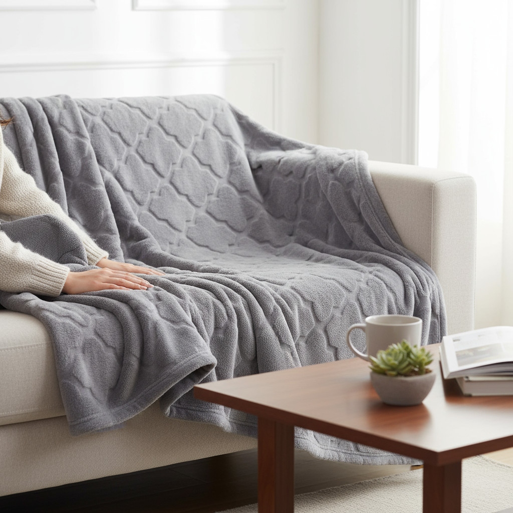 GOYA to luksusowy koc wykonany z miękkiej, aksamitnej mikroflaneli o wysokiej gramaturze 260 g/m². Elegancki tłoczony wzór koniczyny, inspirowany marokańską ornamentyką, nadaje wnętrzu wyjątkowego charakteru i ponadczasowej klasy. Idealny jako ciepły koc do salonu i sypialni oraz stylowa narzuta dekoracyjna na łóżko lub sofę.