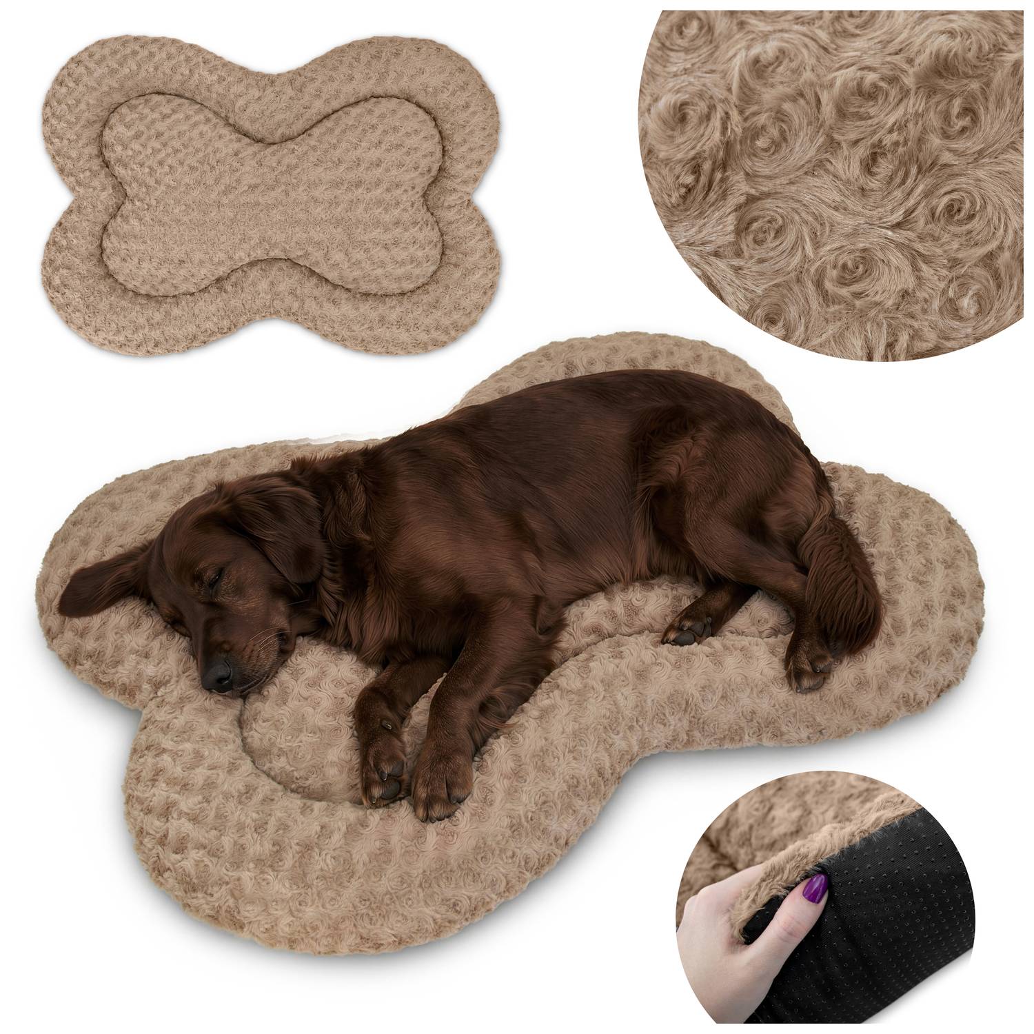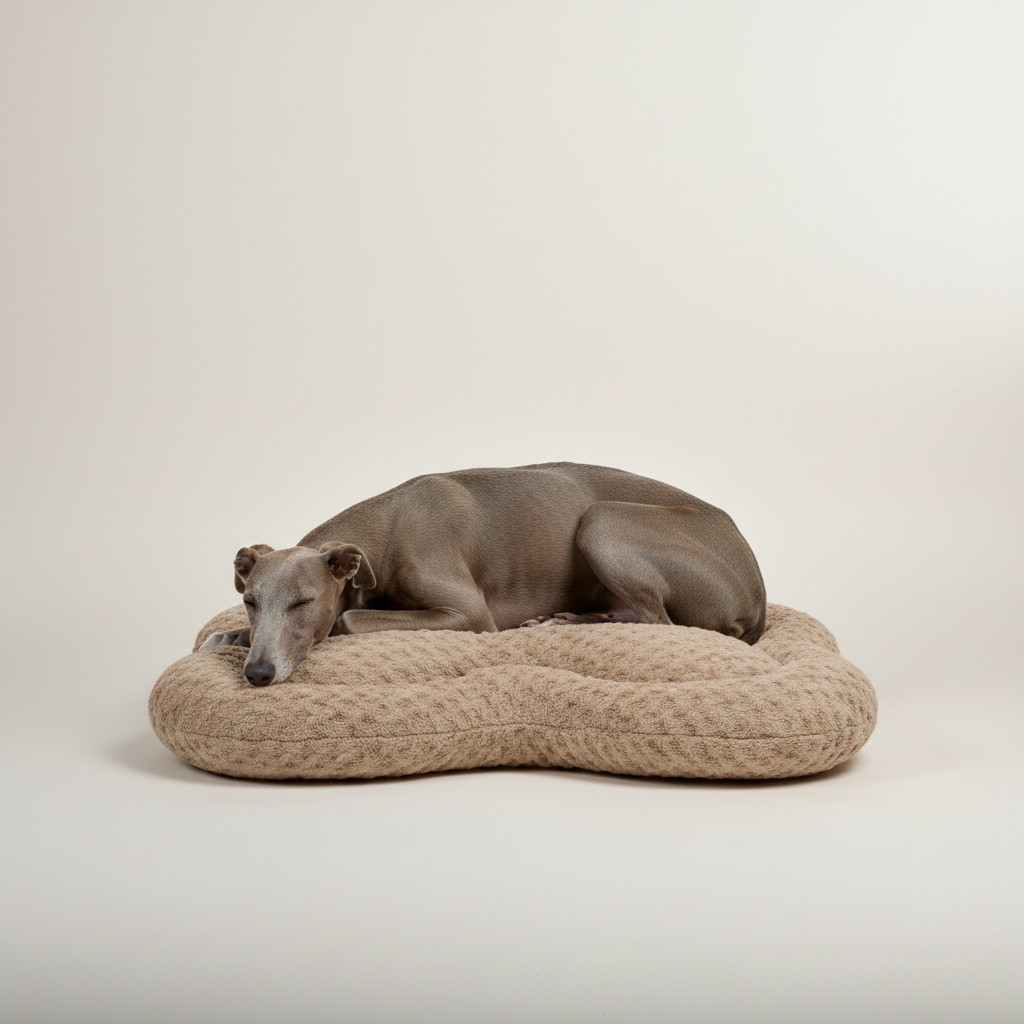 Legowisko dla psa z miękkim, przyjemnym w dotyku materiałem typu faux fur (brushed velvet), zapewniające komfort odpoczynku i izolację od podłoża. Konstrukcja dopasowuje się do ciała zwierzęcia, dzięki zastosowaniu sprężystego wypełnienia.