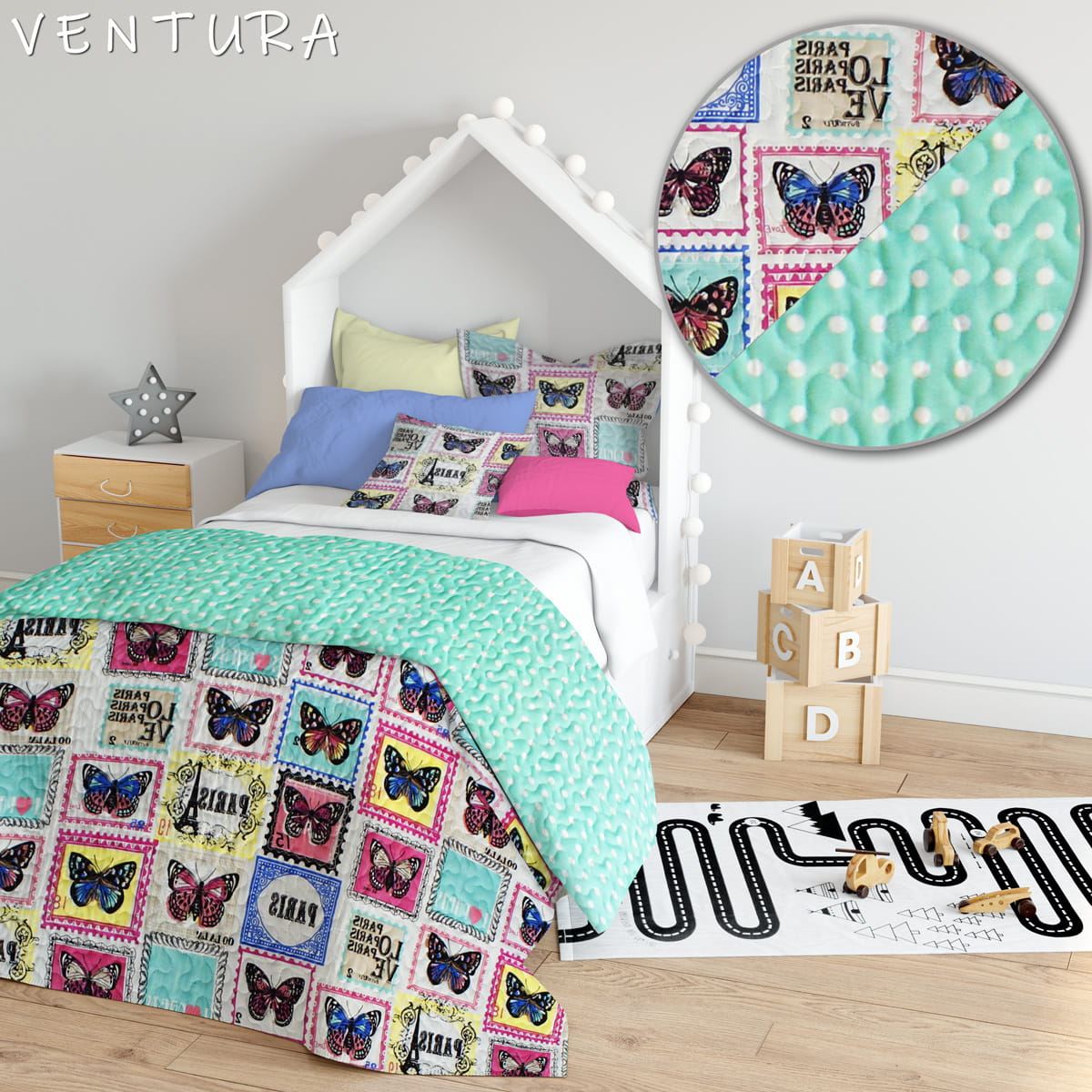Narzuta MAGIC to designerski dodatek do wnętrza pokoju dziecięcego, idealnie komponująca się z innymi dodatkami dostępnymi w naszej ofercie. Produkt wykonany jest z najwyższą starannością.