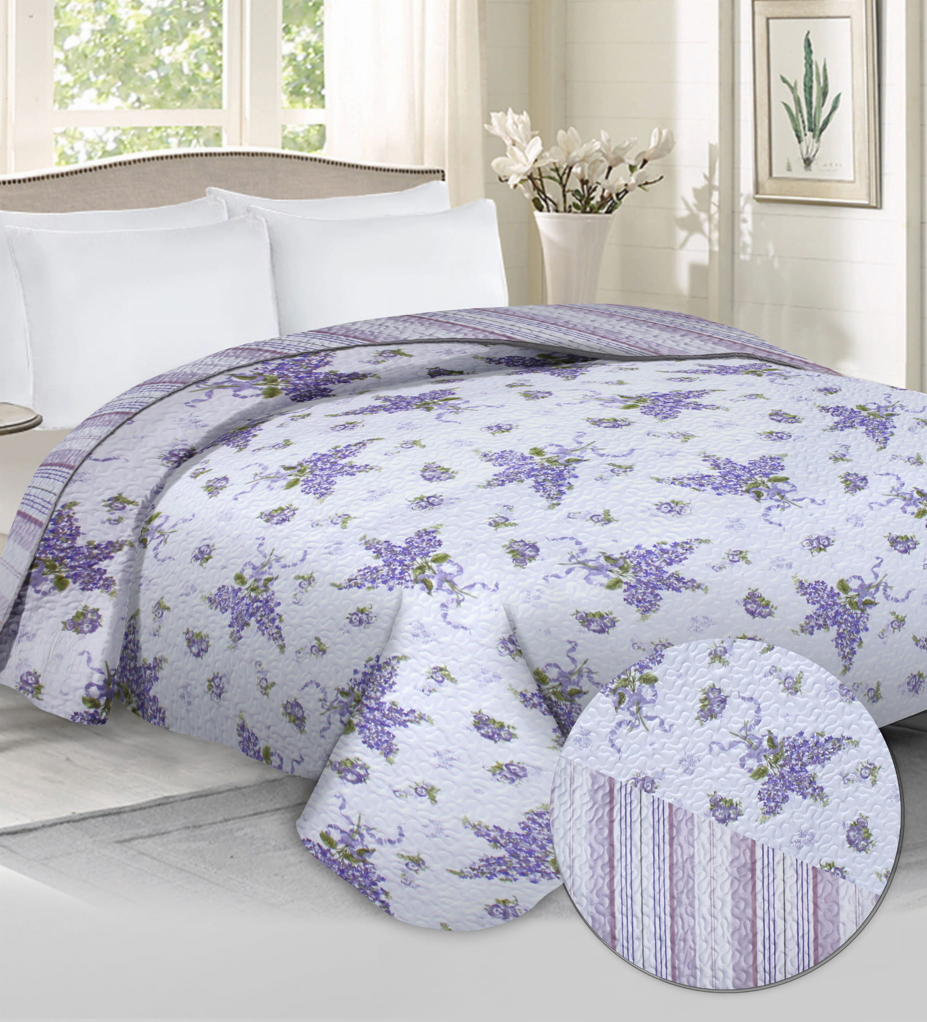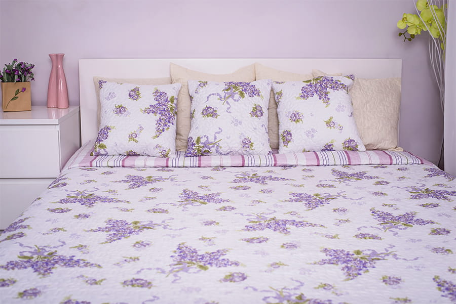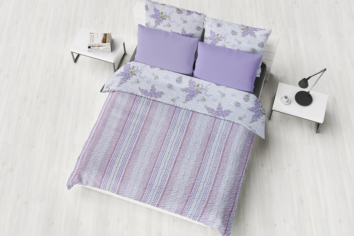 Pikowana,trójwarstwowa, miękka w dotyku, dostępna w pastelowych kolorach narzuta na łóżo lub sofę. Wzór na wierzchniej stronie uzupełniony jest pasującym do nadruku tyłem w modnym, subtelnym wydaniu. Lawenda, delikatne fiolety i kwiaty wprowadzą spokój i harmonię do wnętrza.