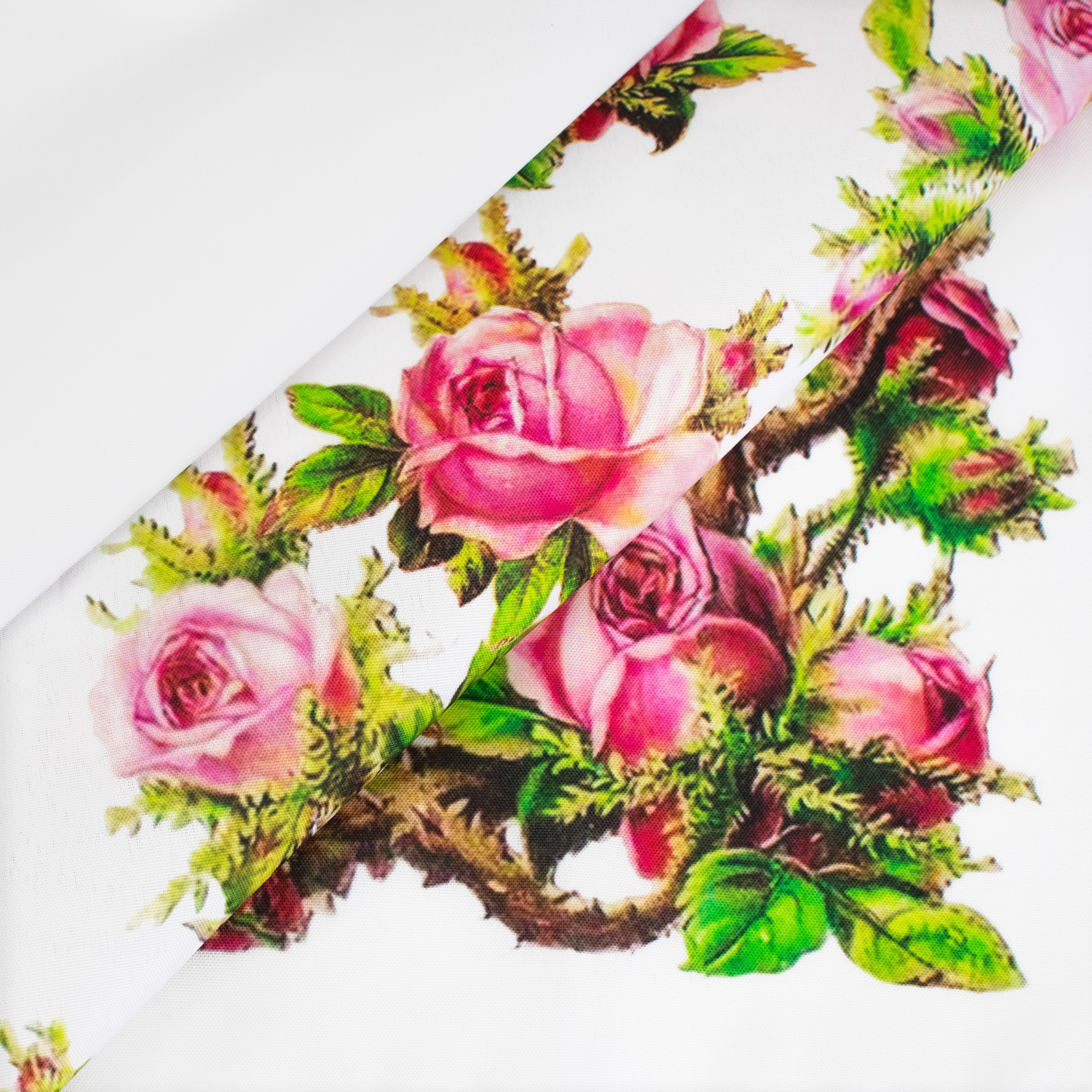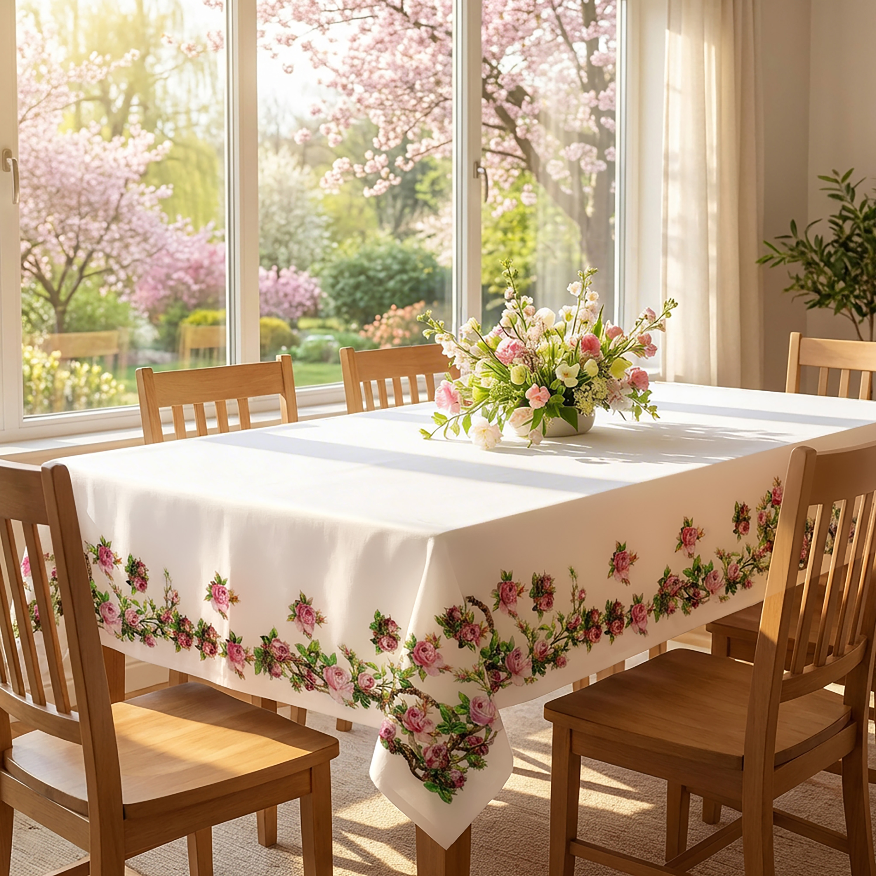 Elegancki obrus Domarex z dekoracyjnym motywem róż to idealna propozycja dla osób, które chcą w prosty sposób odmienić wygląd stołu w jadalni lub salonie. Klasyczne białe tło oraz piękny kwiatowy wzór nadają wnętrzu świeżości i ponadczasowej elegancji.