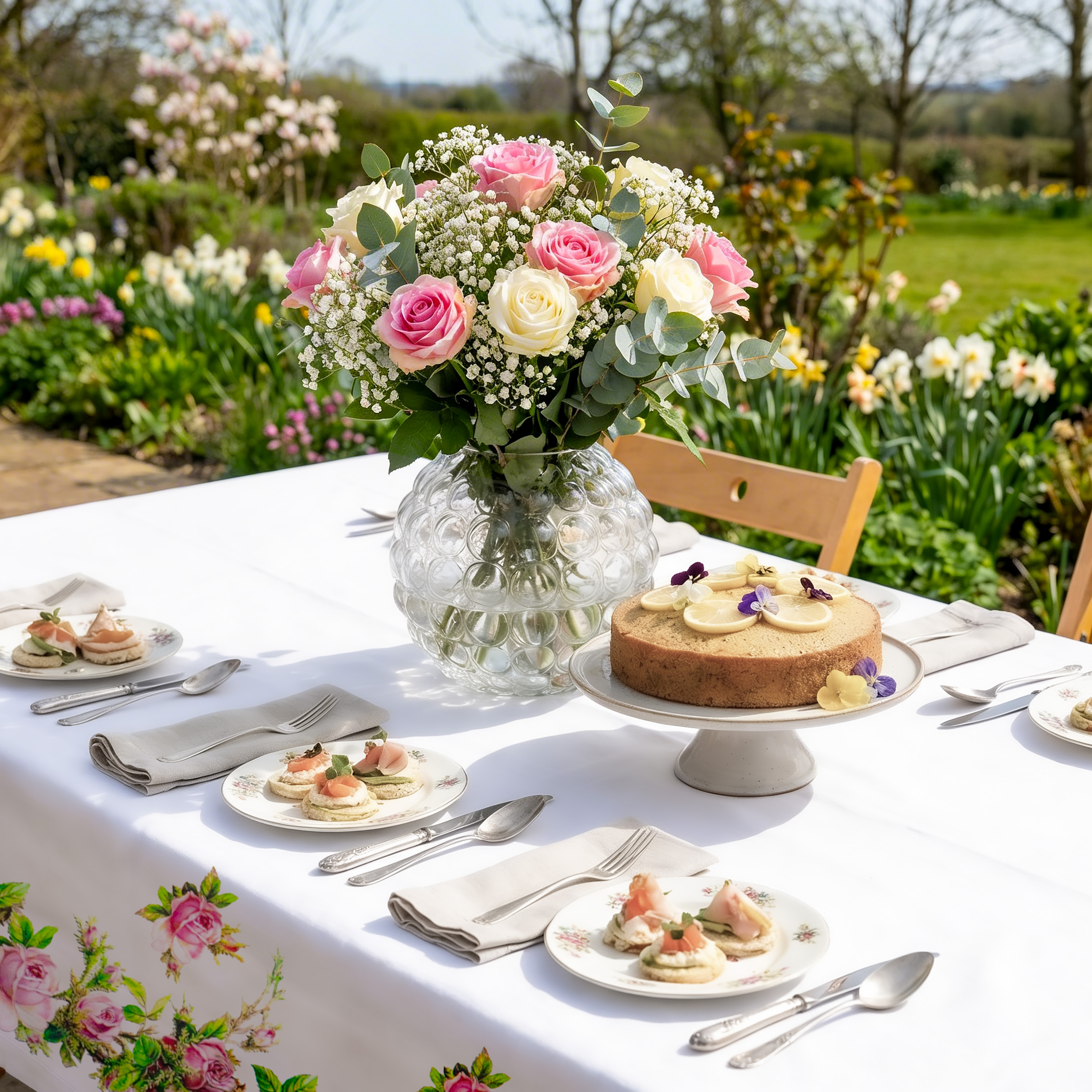Motyw róż rozmieszczony na obrzeżach obrusa tworzy wyjątkową dekorację stołu, która przyciąga uwagę i doskonale komponuje się z jasnymi oraz drewnianymi meblami. Obrus świetnie sprawdzi się zarówno w nowoczesnych, jak i klasycznych aranżacjach wnętrz.