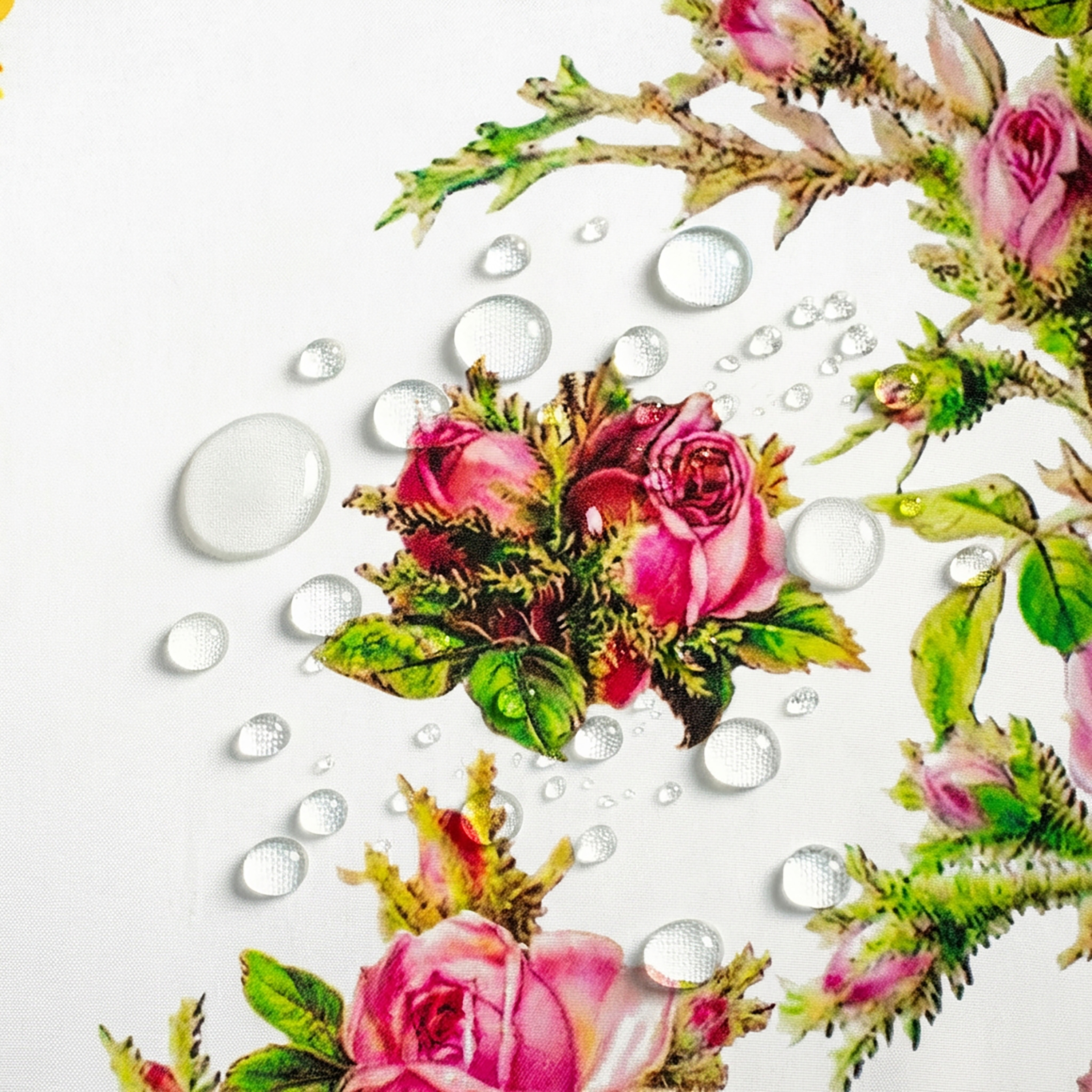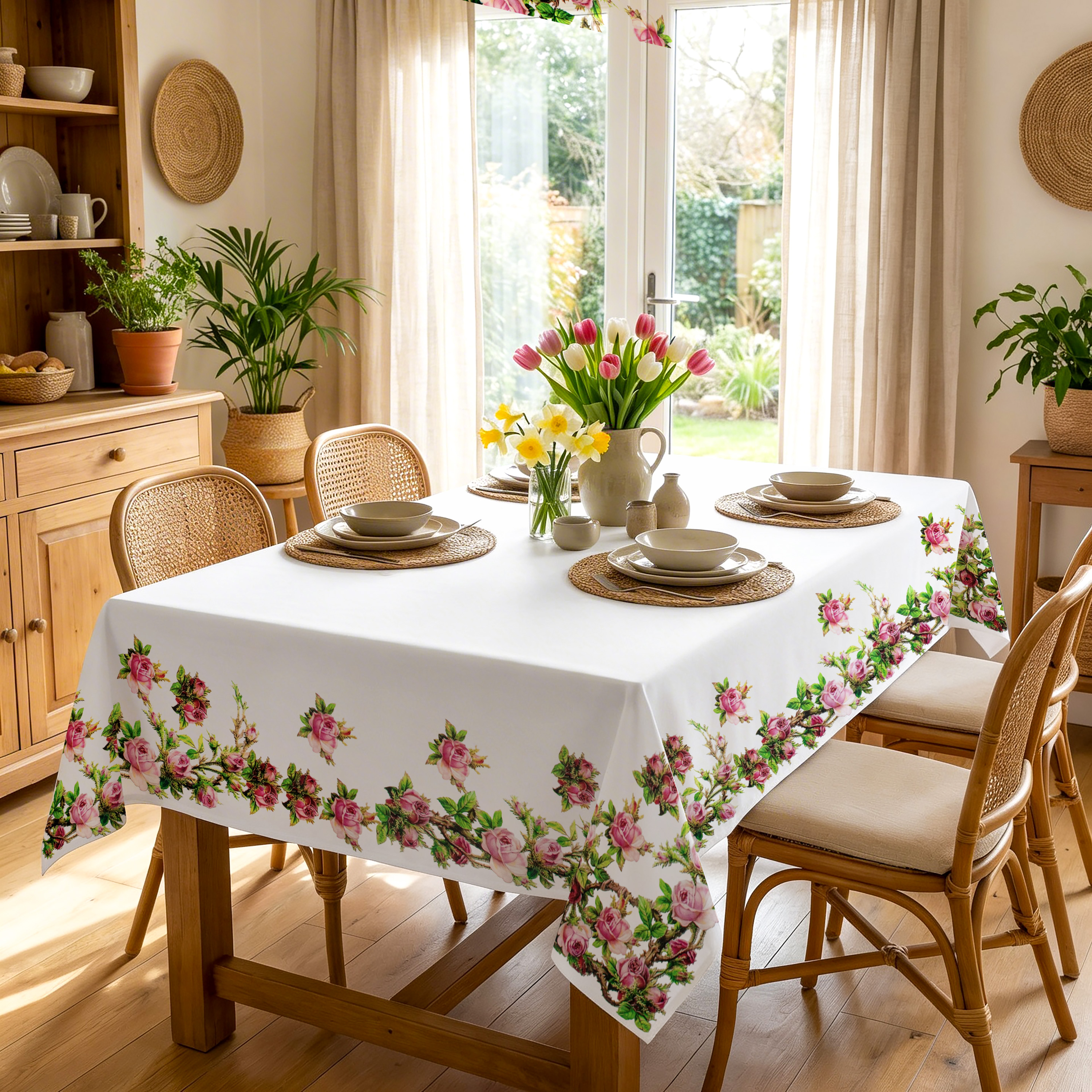 Delikatny wzór róż umieszczony na krawędziach obrusa nadaje mu subtelnej elegancji i sprawia, że stół prezentuje się niezwykle stylowo. Jasna kolorystyka doskonale pasuje do nowoczesnych oraz klasycznych wnętrz, wprowadzając do przestrzeni lekkość i świeżość.