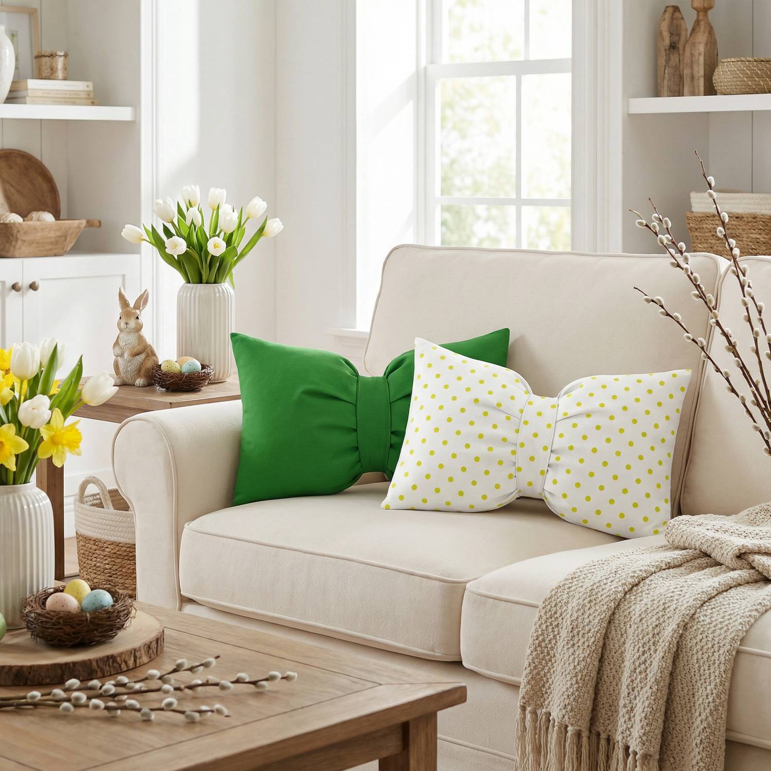 Dzięki unikatowemu kształtowi kokardy poduszka od razu przyciąga wzrok i wprowadza do wnętrza ciepły, przytulny klimat – bez dużych zmian aranżacyjnych.
