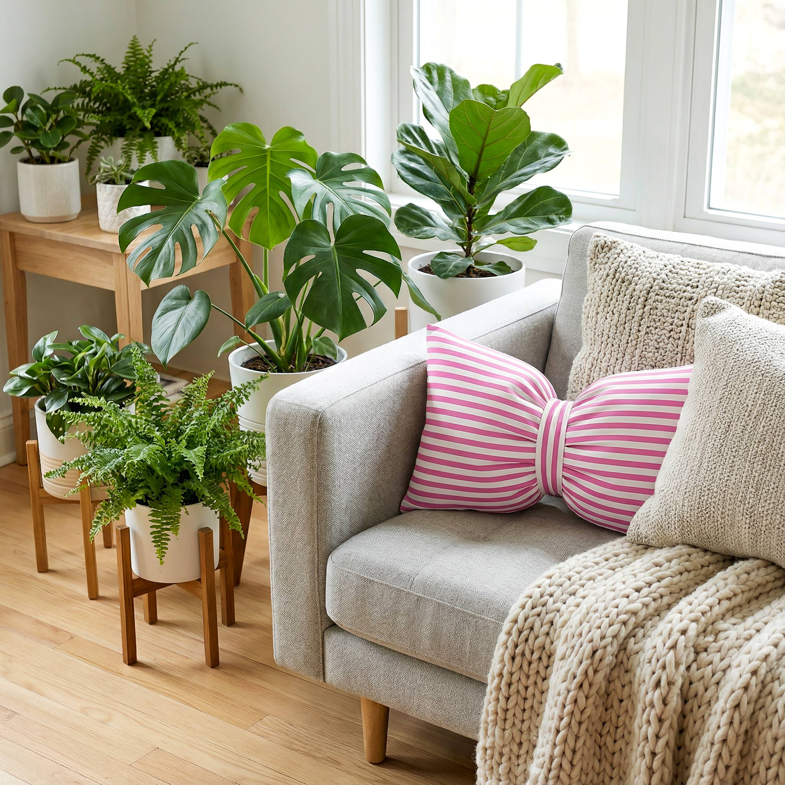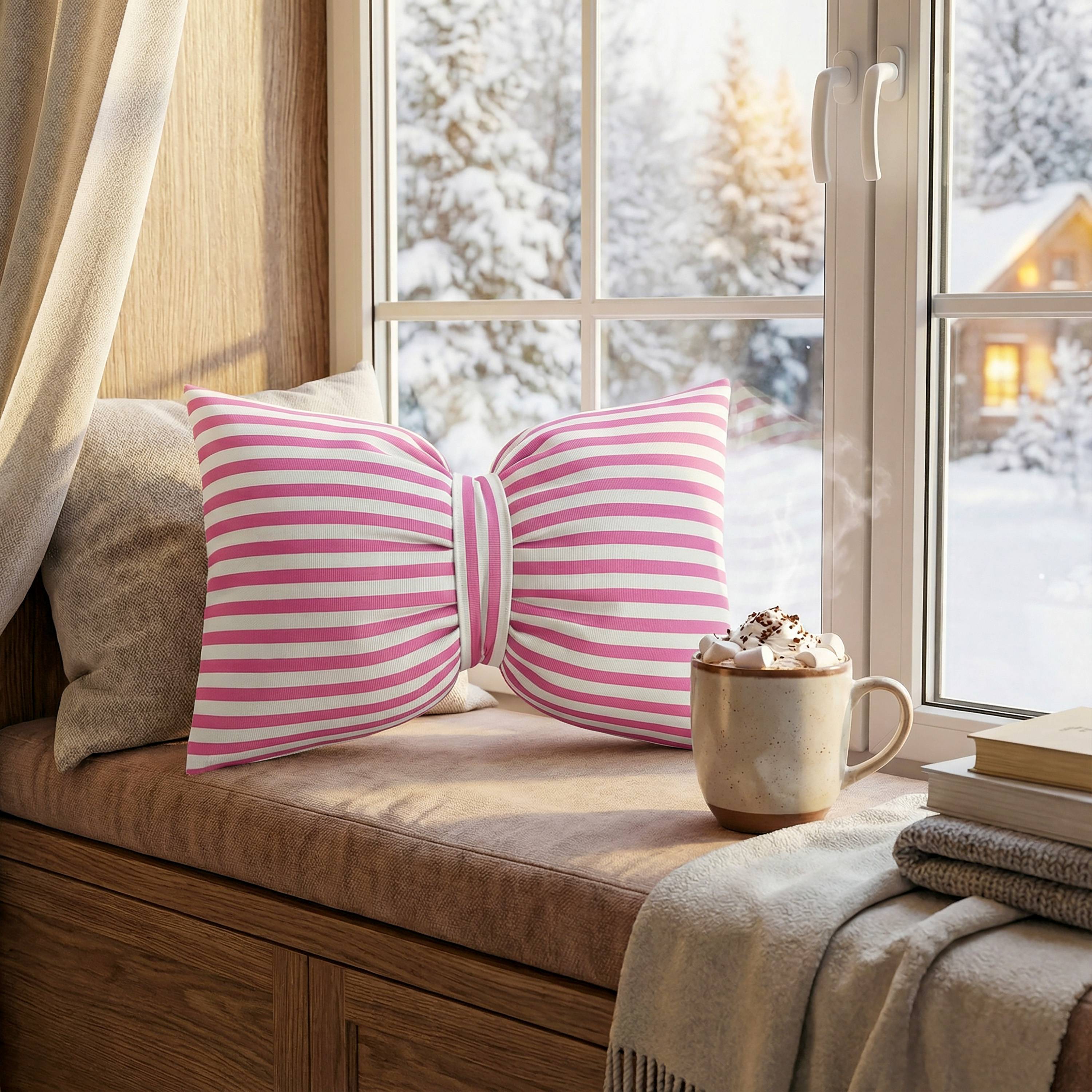 Dzięki unikatowemu kształtowi kokardy poduszka od razu przyciąga wzrok i wprowadza do wnętrza ciepły, przytulny klimat – bez dużych zmian aranżacyjnych.