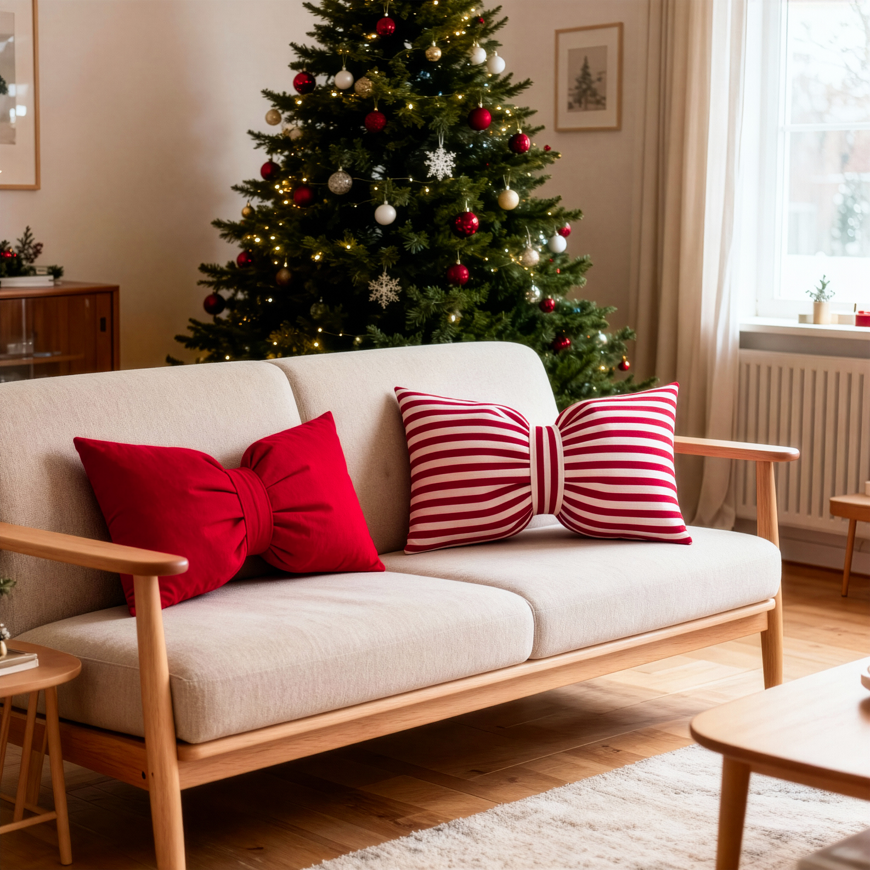 Wyrazista forma kokardy sprawia, że poduszka pełni rolę dekoracji sama w sobie. Natychmiast ożywia wnętrze i podkreśla styl Natural Glam, boho, klasyczny oraz świąteczny.