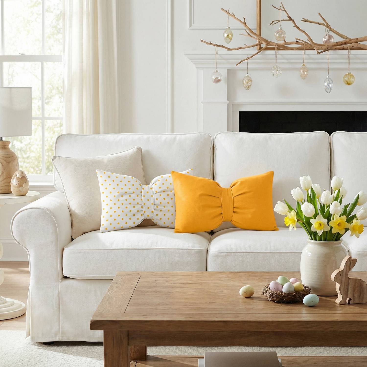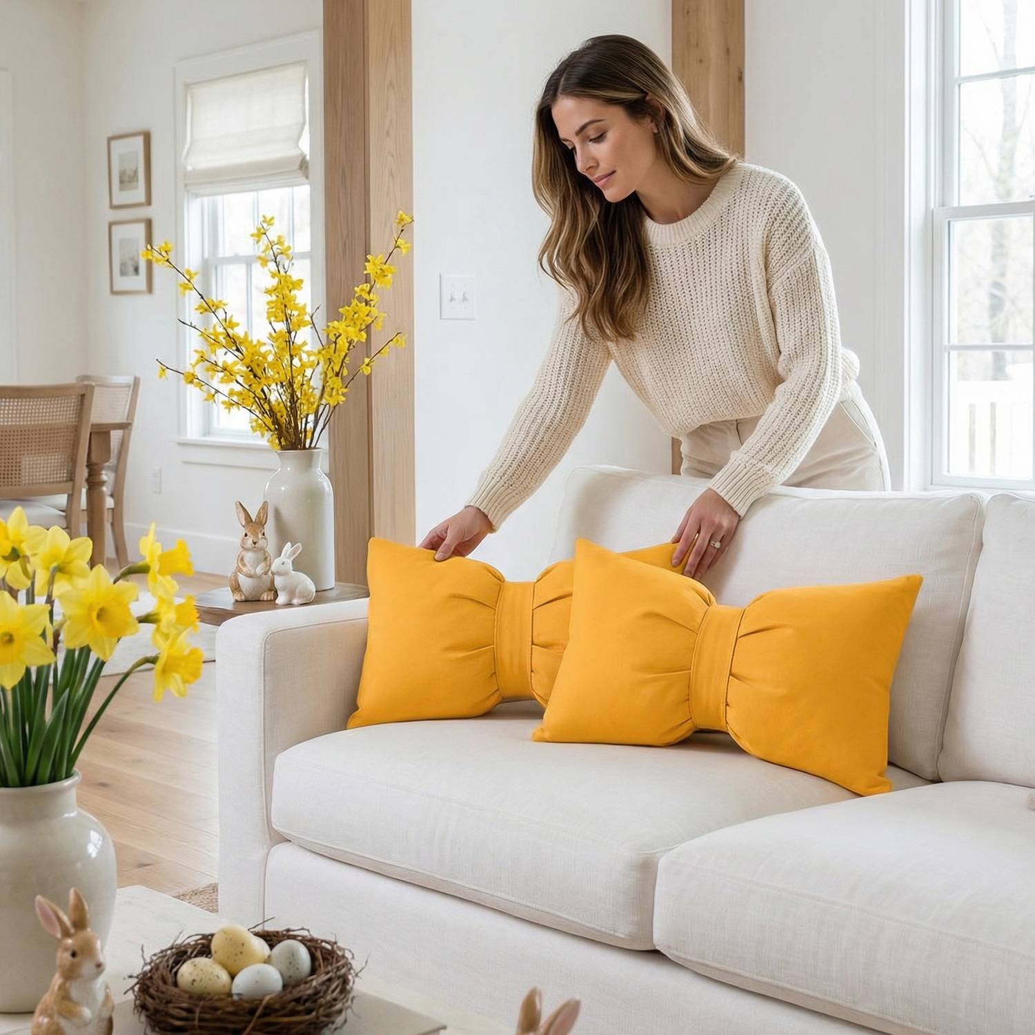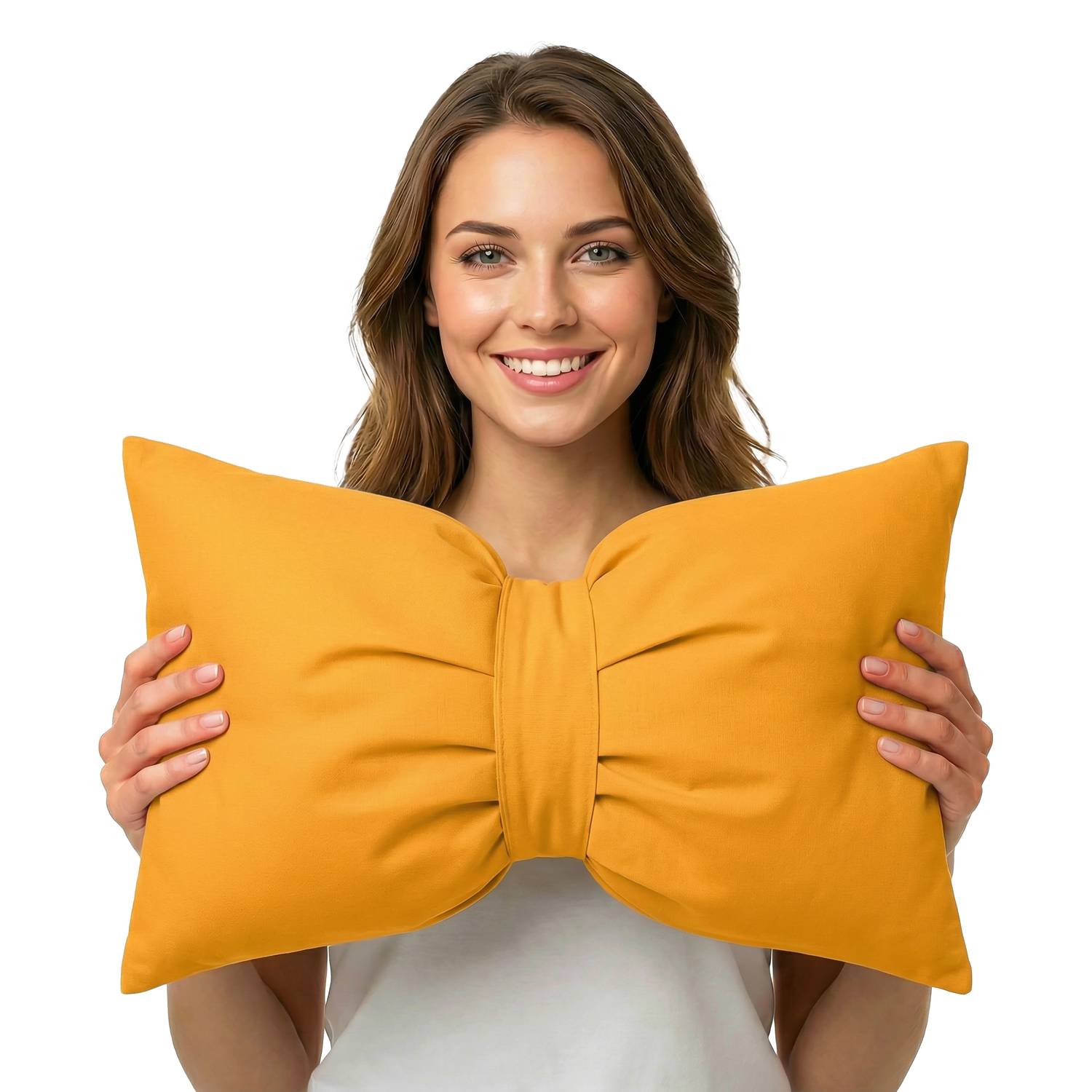 Dzięki unikatowemu kształtowi kokardy poduszka od razu przyciąga wzrok i wprowadza do wnętrza ciepły, przytulny klimat – bez dużych zmian aranżacyjnych.