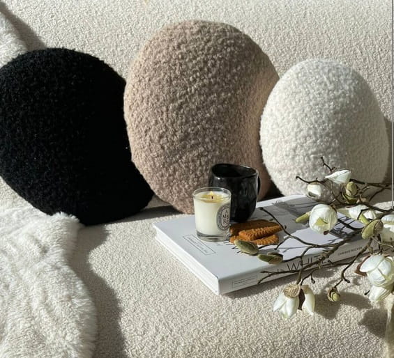 Okrągła poduszka PRESTIGE LINE bukla + velvet 45x45, wykonana z jednej strony z miękkiego i miłego w dotyku materiału boucle o pętelkowym, strukturalnym charakterze; oraz z przyjemnej i aksamitnej tkaniny velvet.