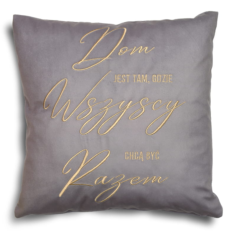 Napis na poszewce: " dom jest tam, gdzie wszyscy chcą być razem"