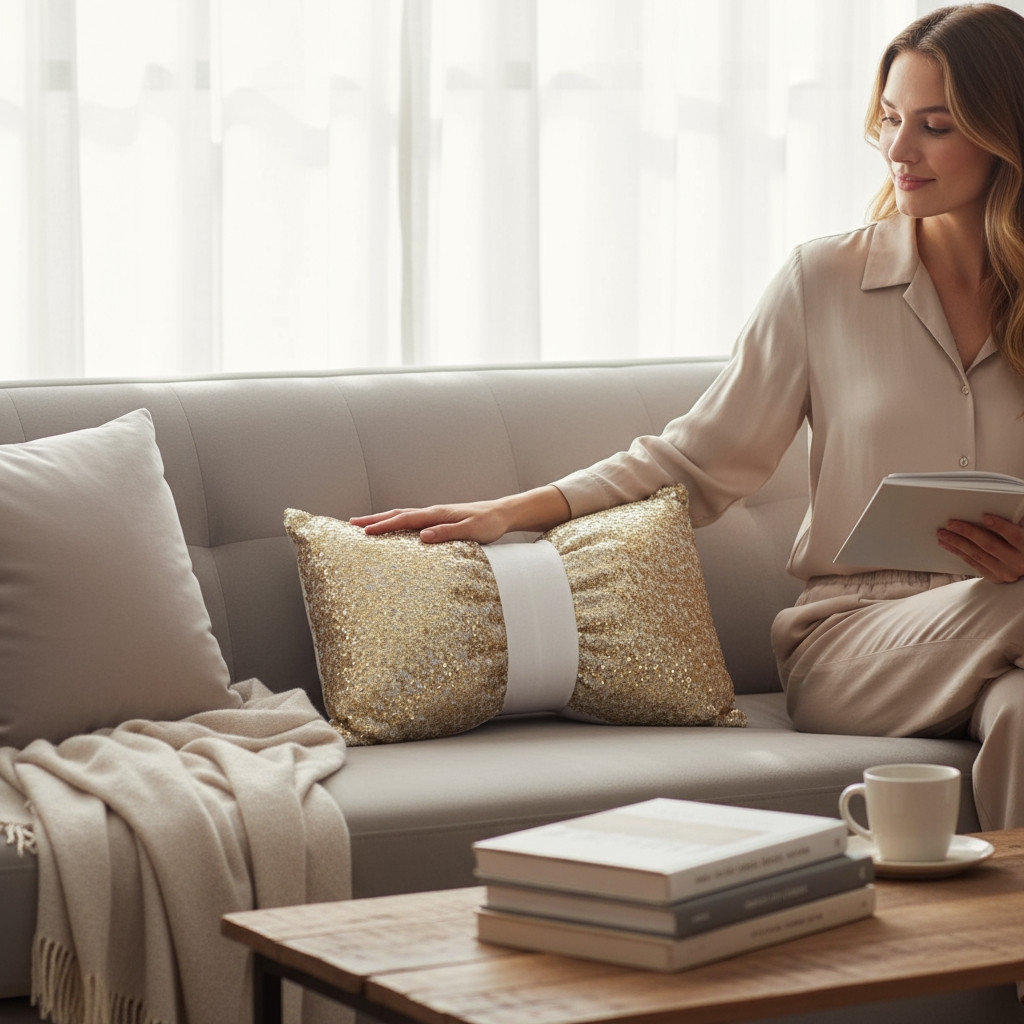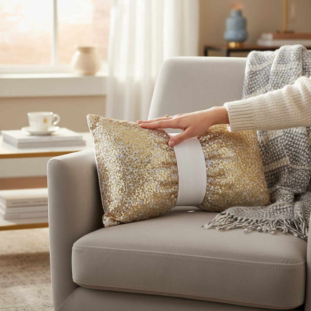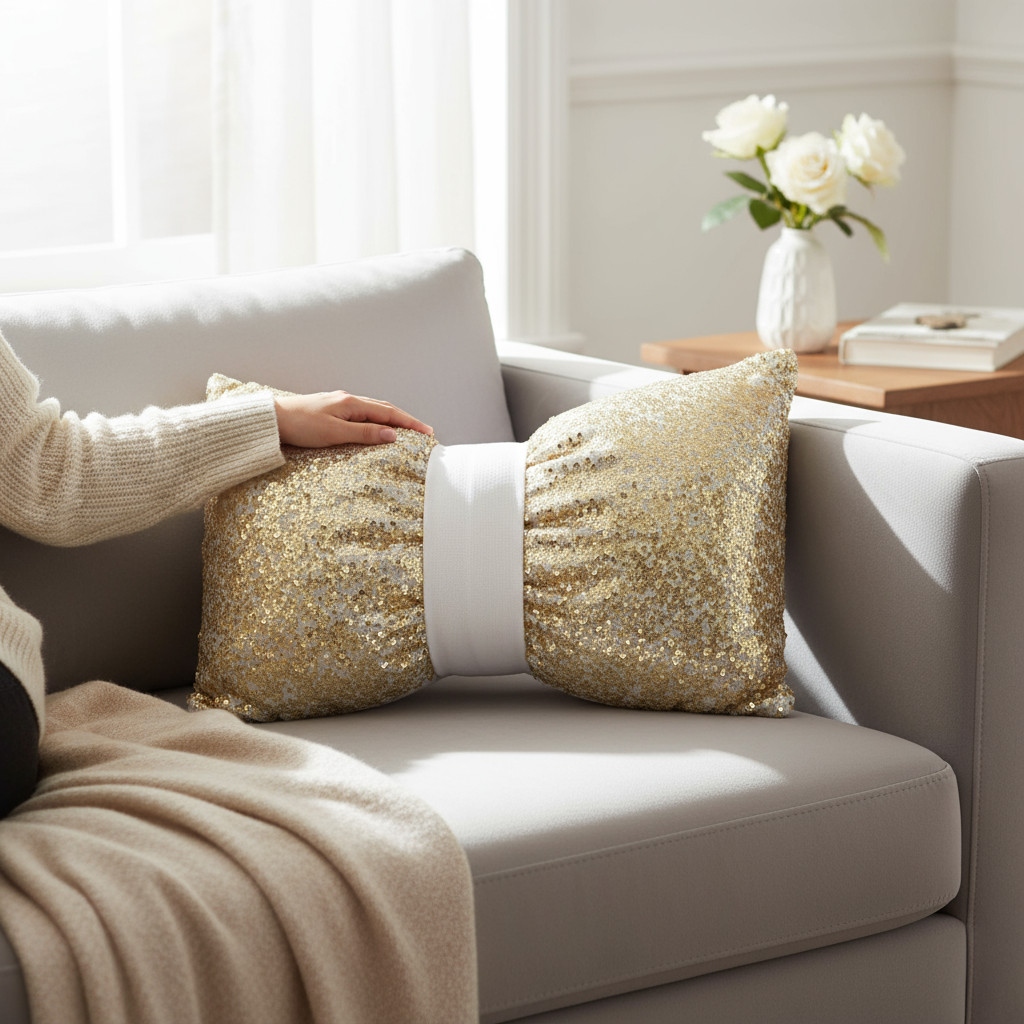 Środkową część poduszki zdobi welwetowa, miękka opaska o szerokości ok. 5 cm, którą można łatwo zdjąć lub założyć ponownie. Dzięki niej możesz w kilka chwil zmienić wygląd – z klasycznej poduszki w uroczą kokardę. Dwustronna opaska z welwetu pozwala dopasować styl do nastroju i wystroju wnętrza.