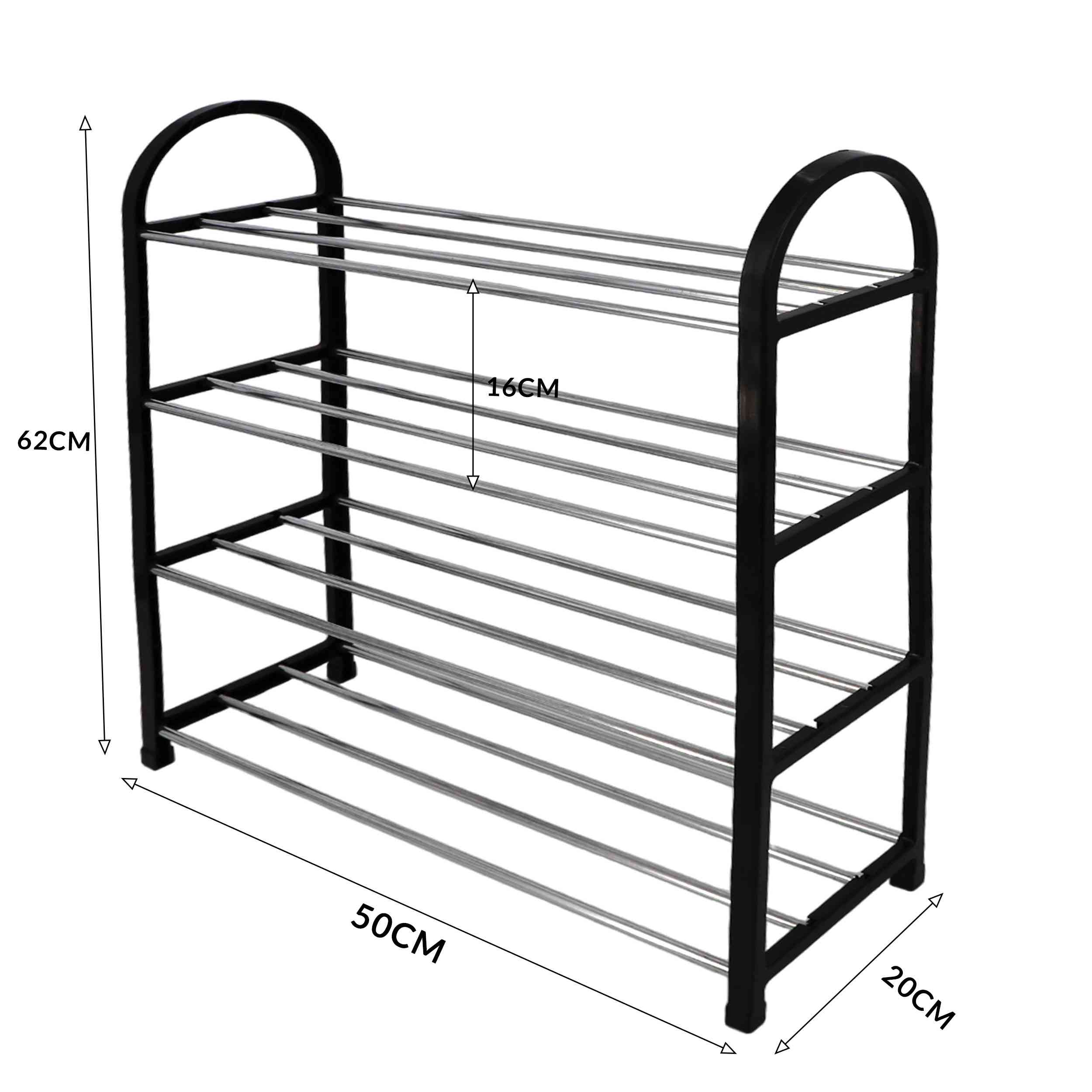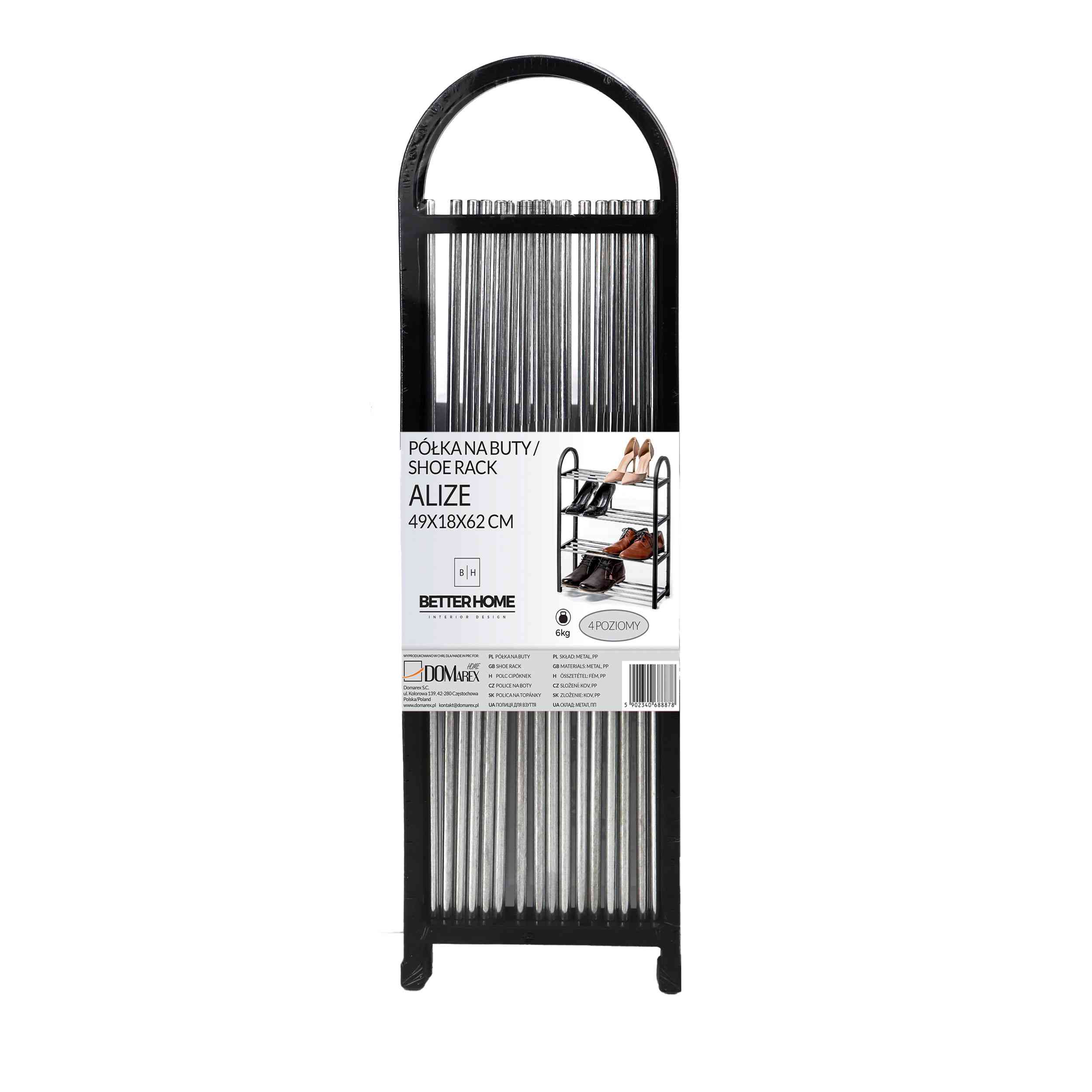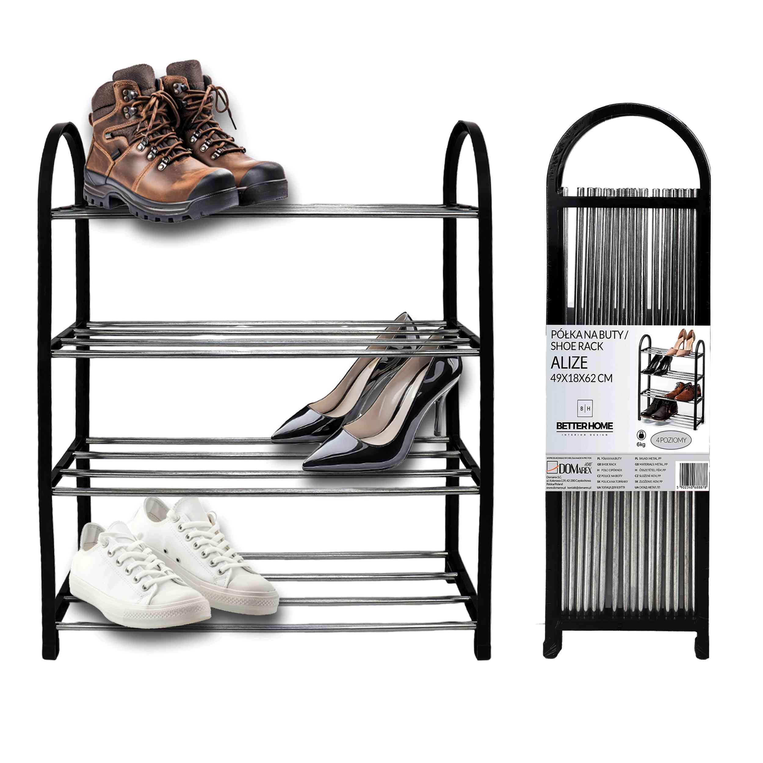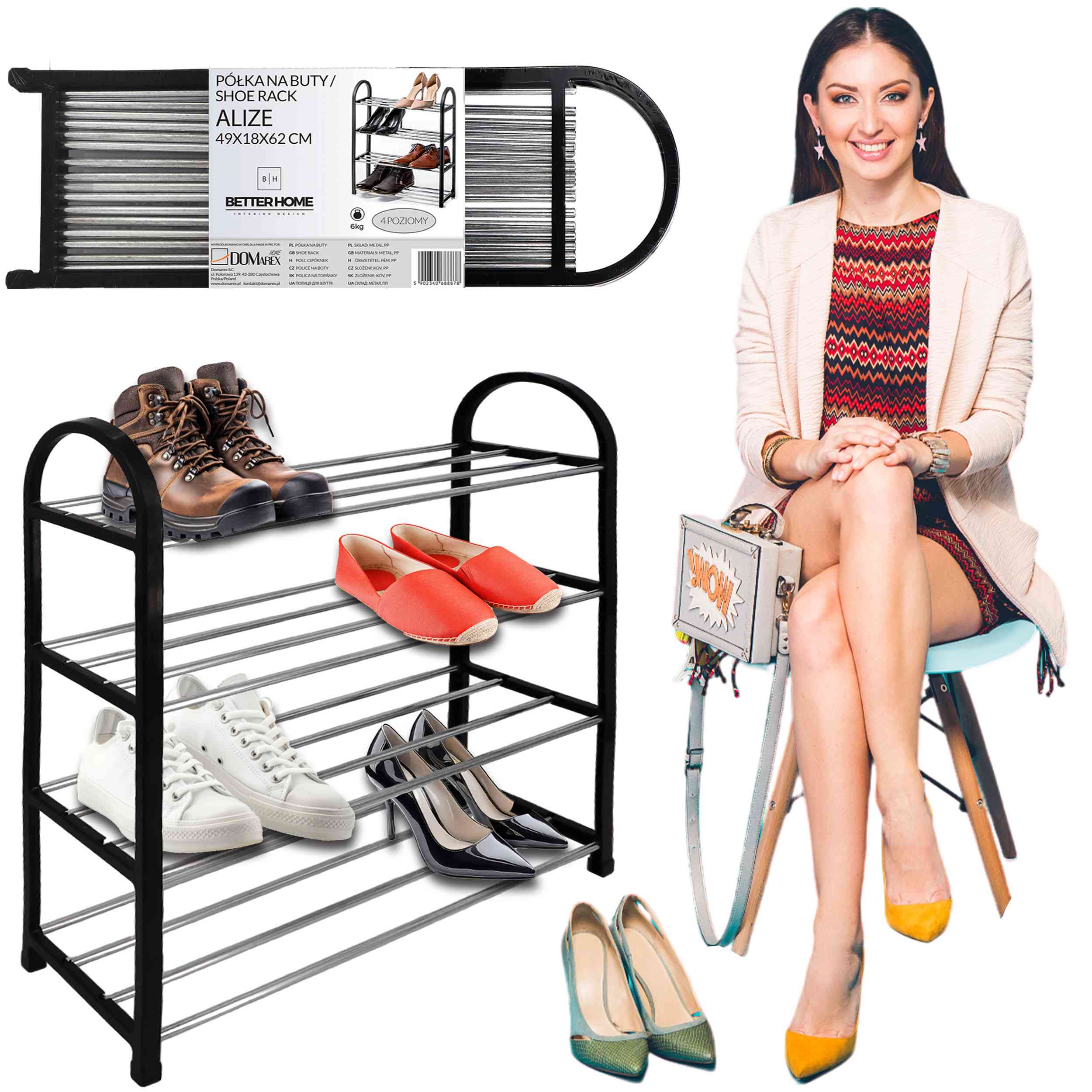 Wprowadź porządek do swojego przedpokoju lub sypialni dzięki naszej eleganckiej i funkcjonalnej półce na buty ALIZE. Przeznaczona do przechowywania obuwia, ta czarna, czteropoziomowa półka o wymiarach 49 cm szerokości, 18 cm głębokości i 62 cm wysokości, to idealne rozwiązanie do każdego wnętrza.