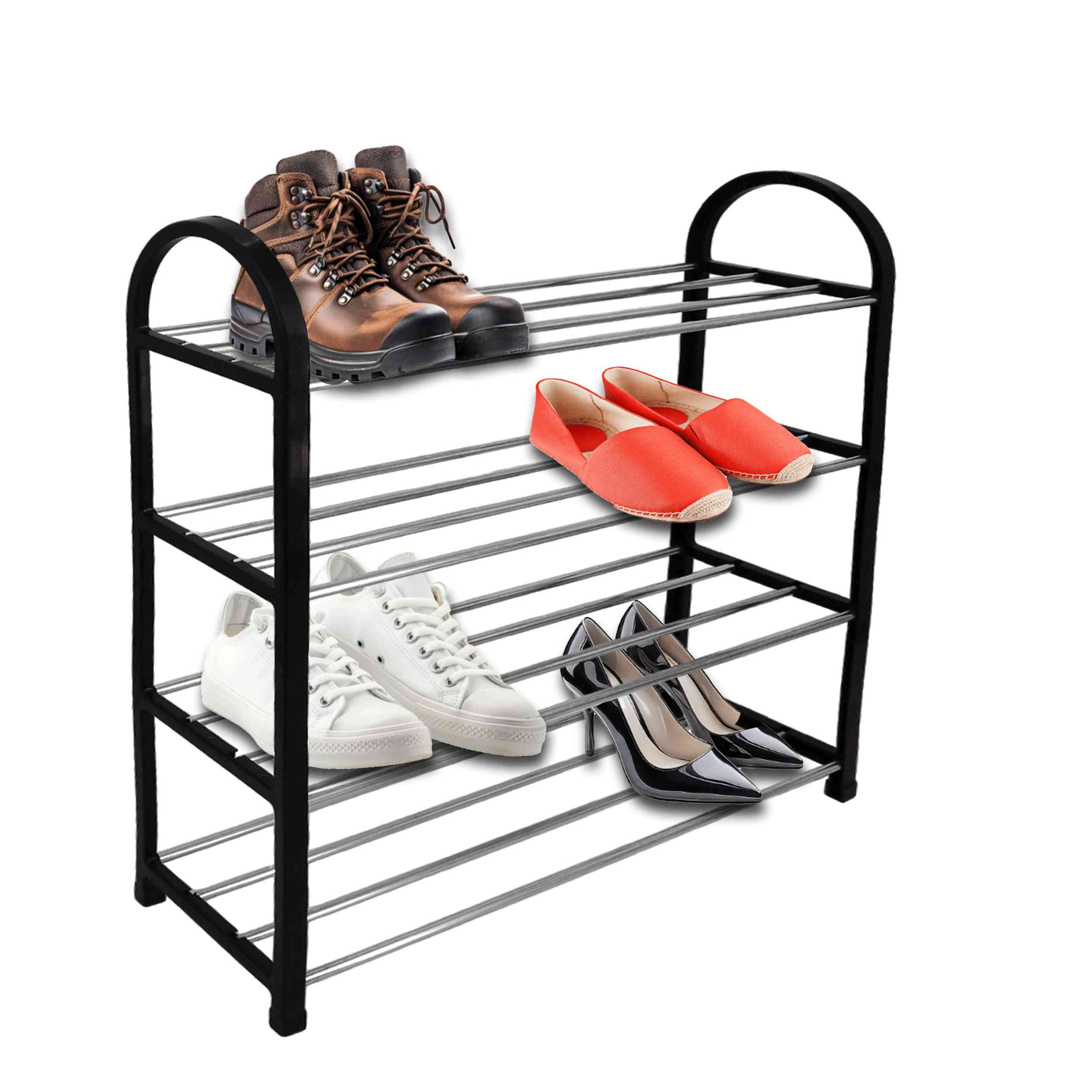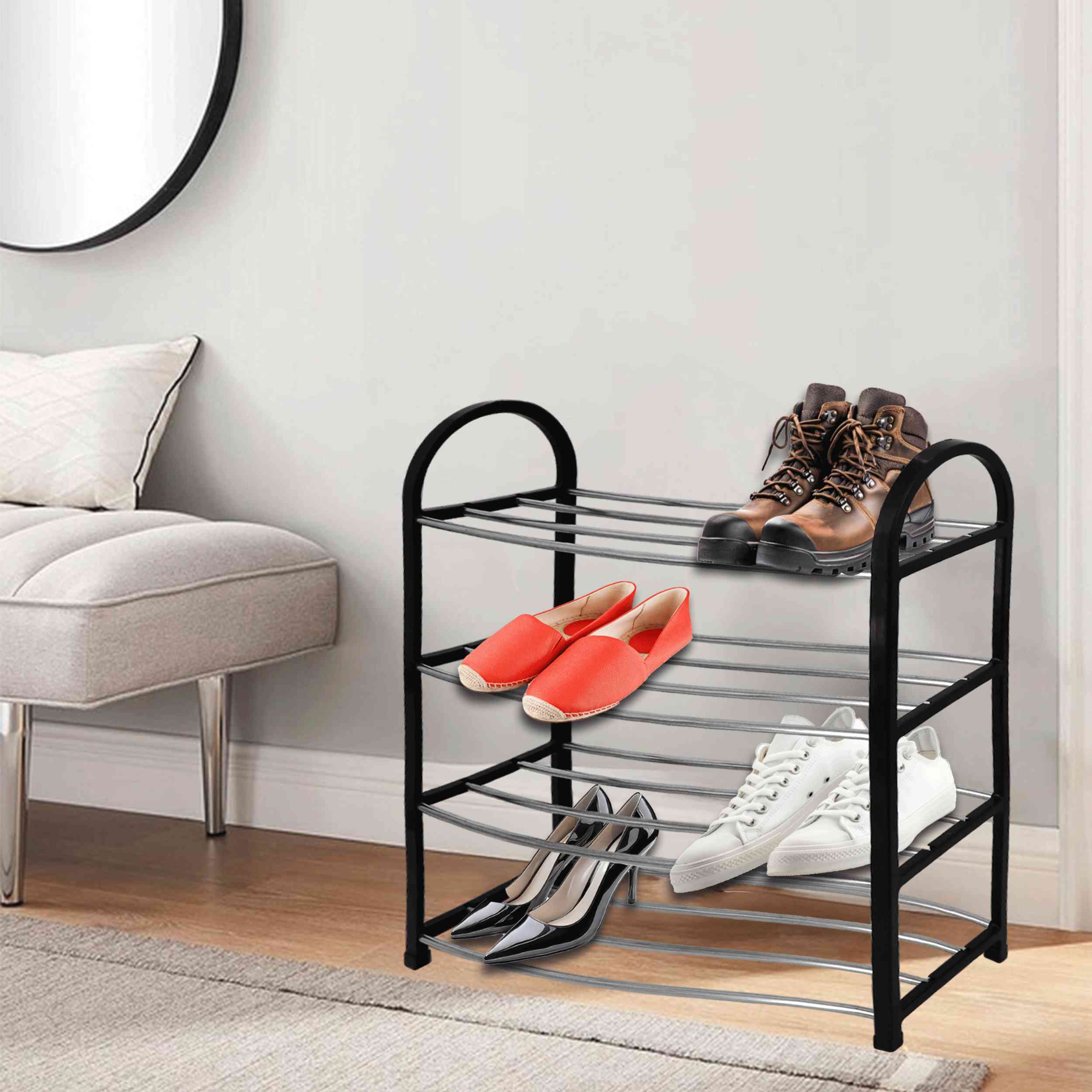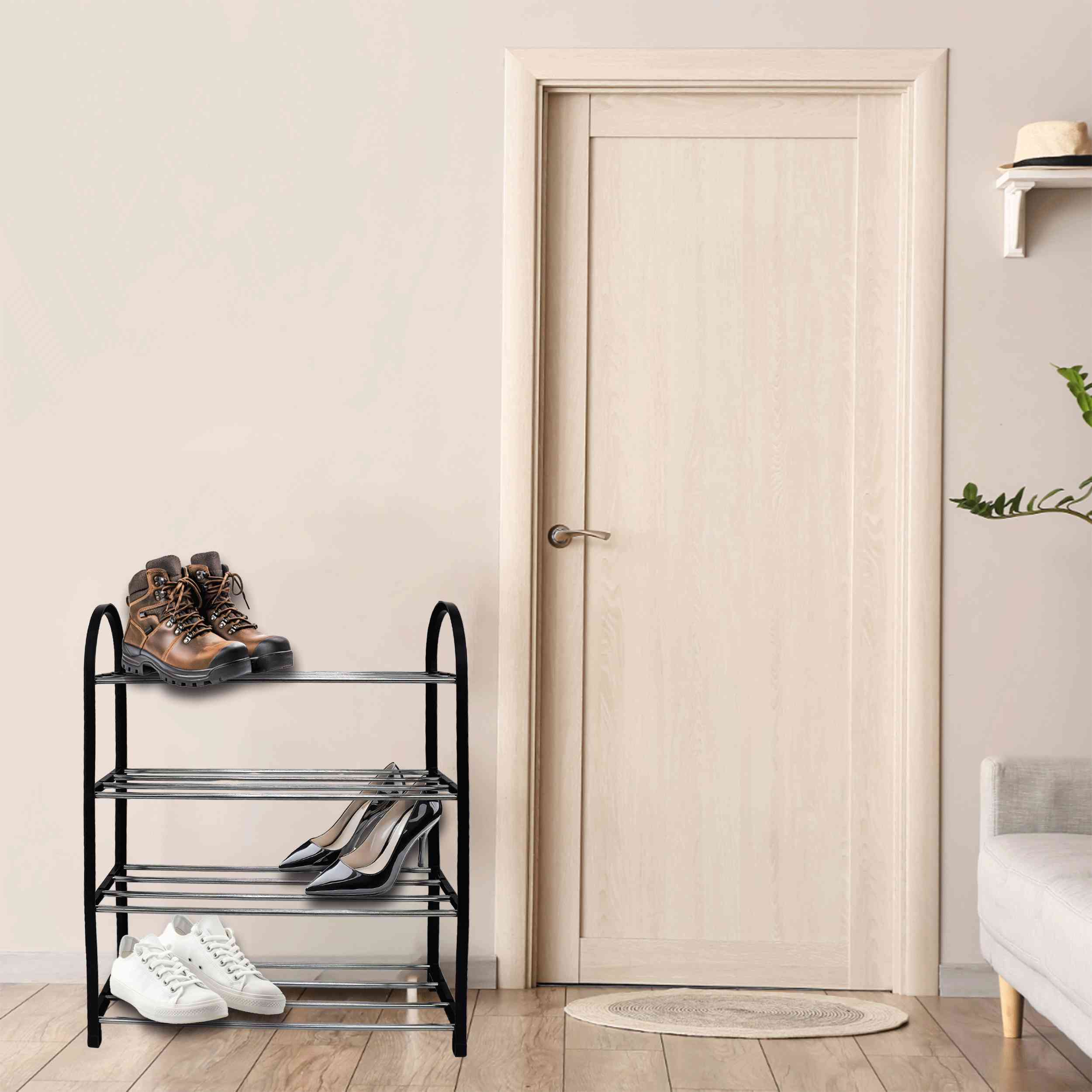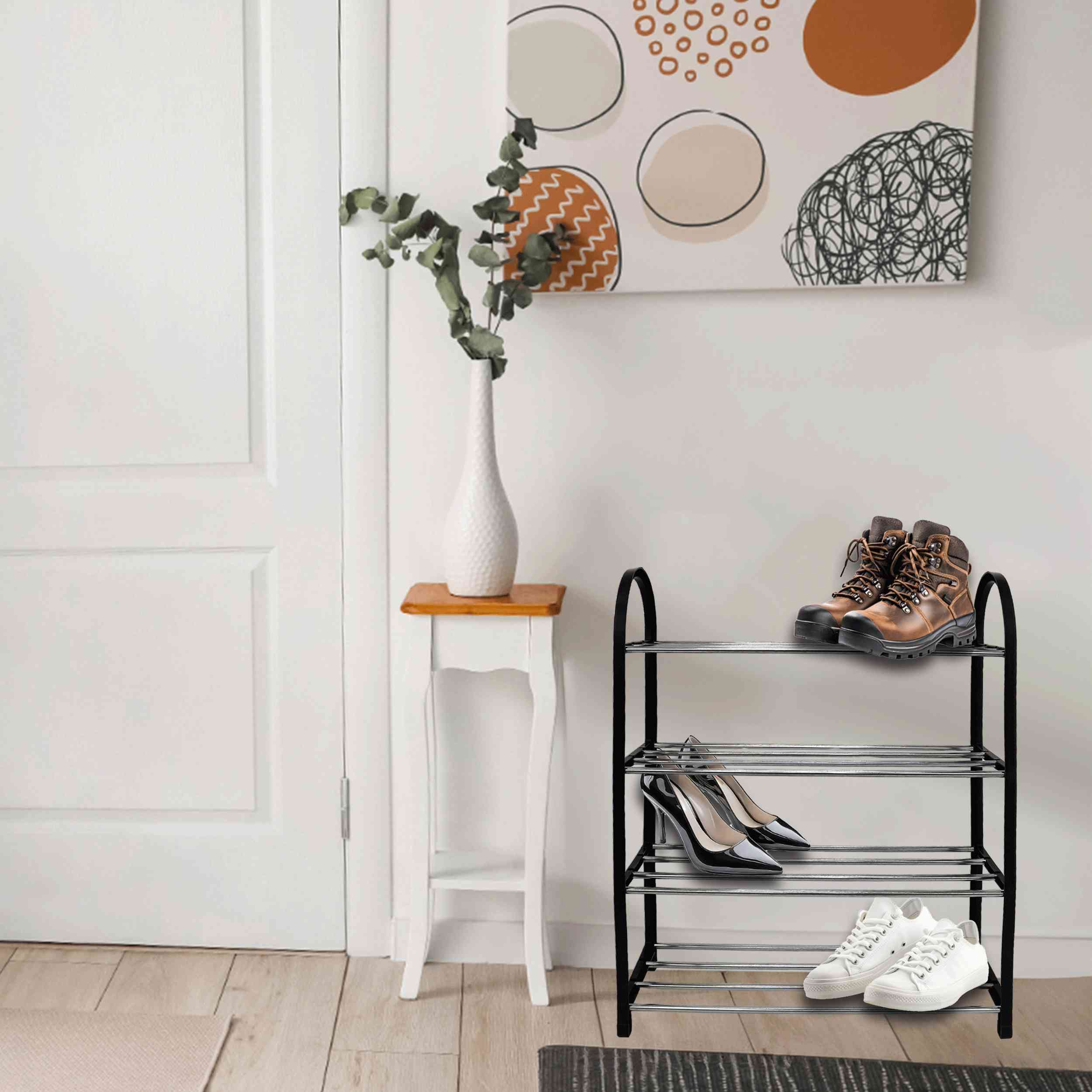 Wprowadź porządek do swojego przedpokoju lub sypialni dzięki naszej eleganckiej i funkcjonalnej półce na buty ALIZE. Przeznaczona do przechowywania obuwia, ta czarna, czteropoziomowa półka o wymiarach 49 cm szerokości, 18 cm głębokości i 62 cm wysokości, to idealne rozwiązanie do każdego wnętrza.