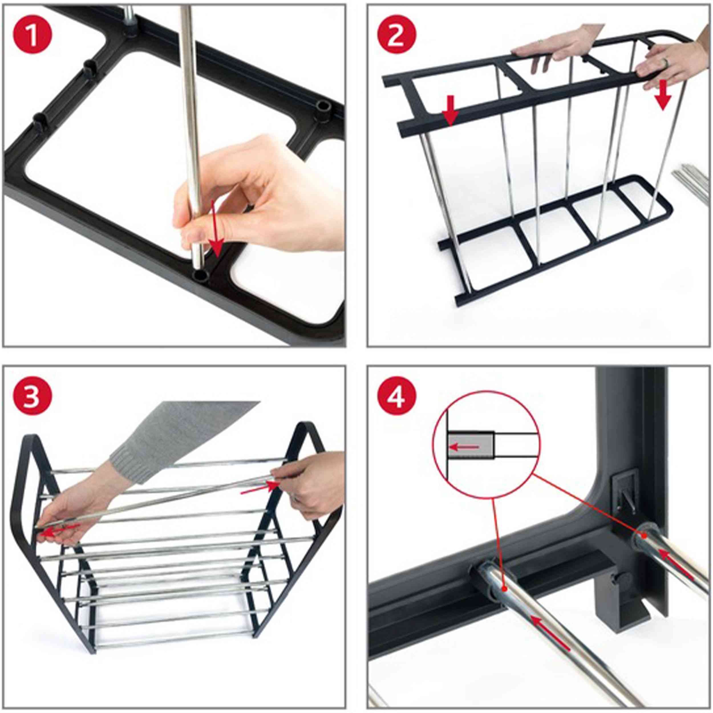 Półka charakteryzuje się intuicyjnym systemem montażu, który nie wymaga specjalistycznych narzędzi ani umiejętności. W zestawie znajdują się wszystkie niezbędne elementy, aby w kilka chwil cieszyć się zorganizowanym miejscem na obuwie.