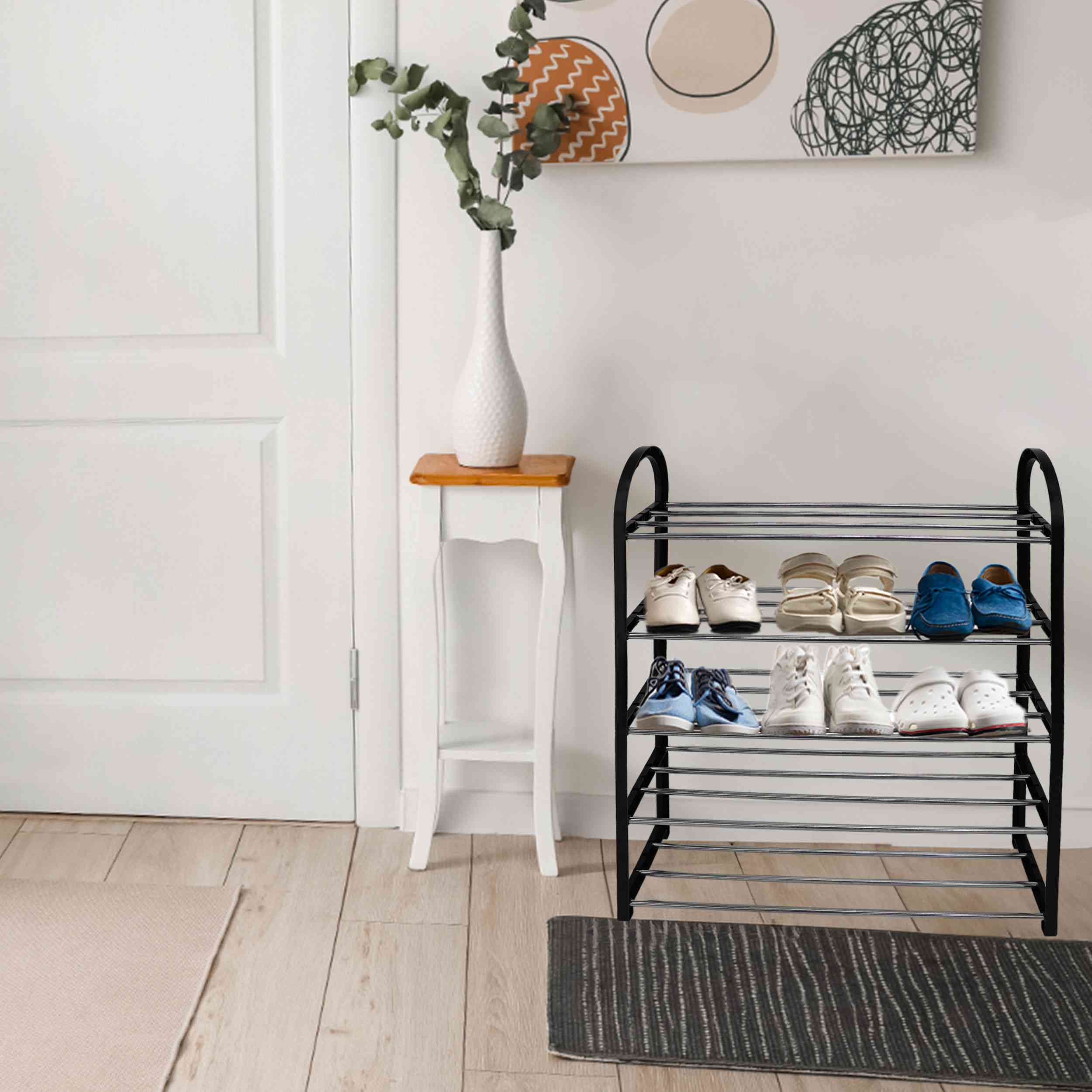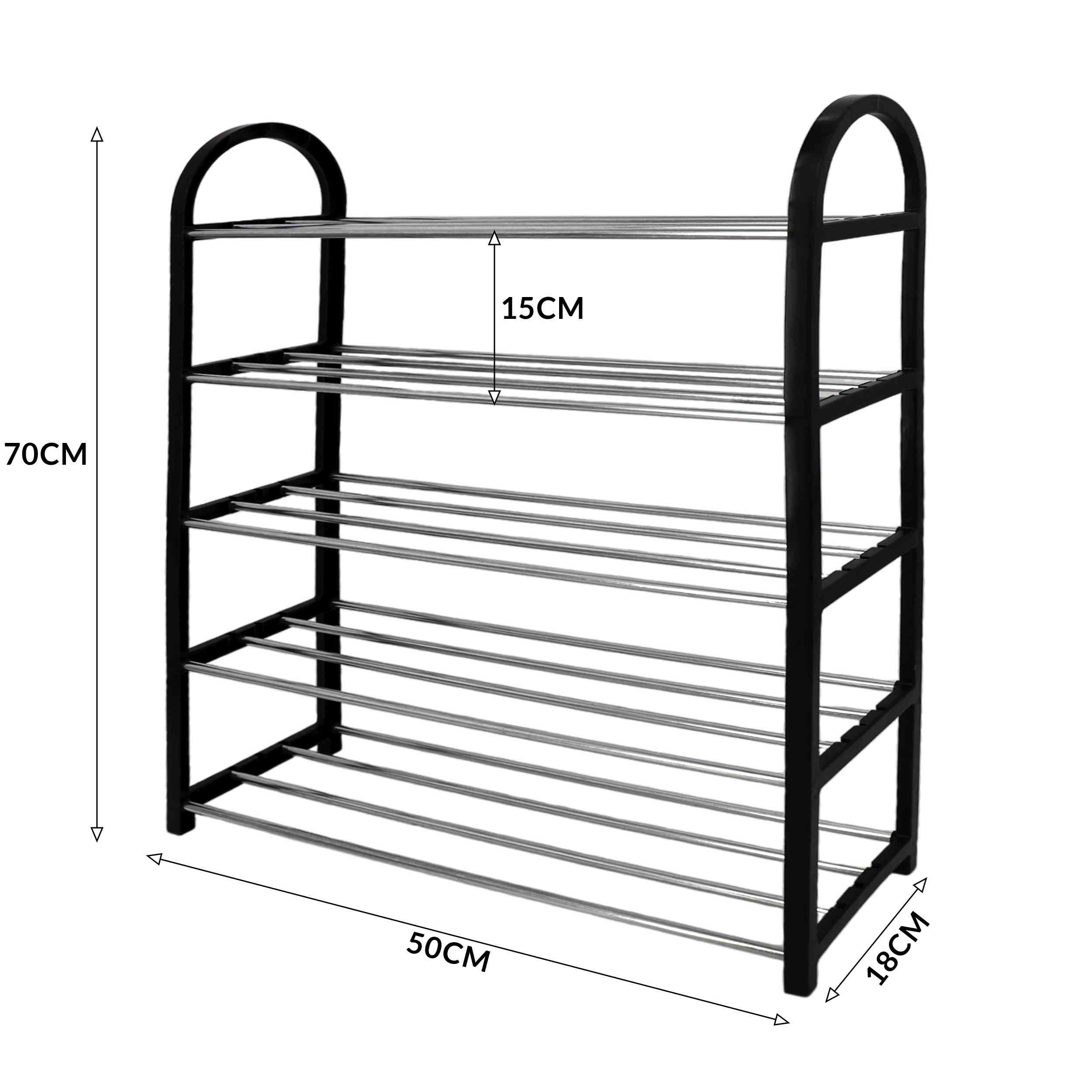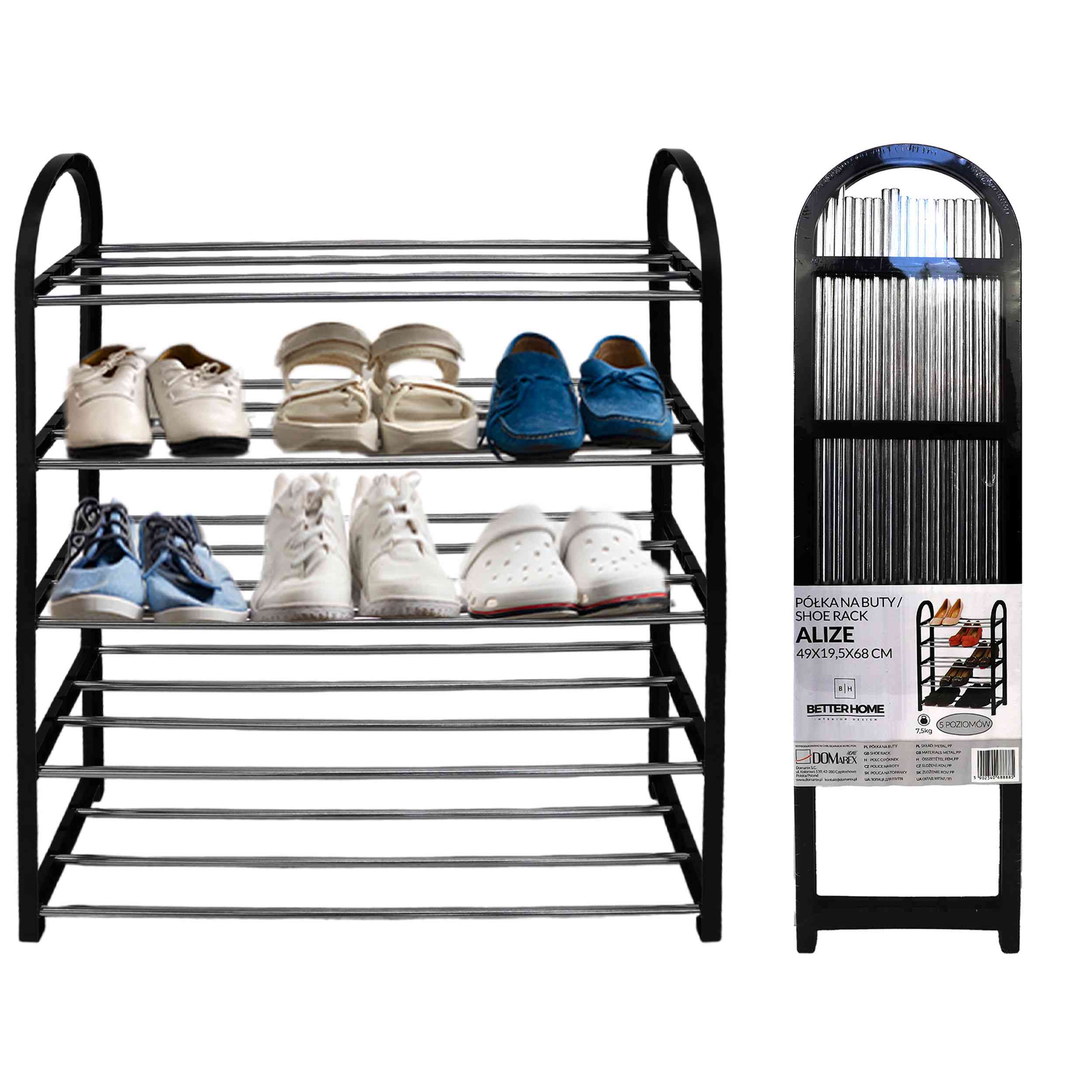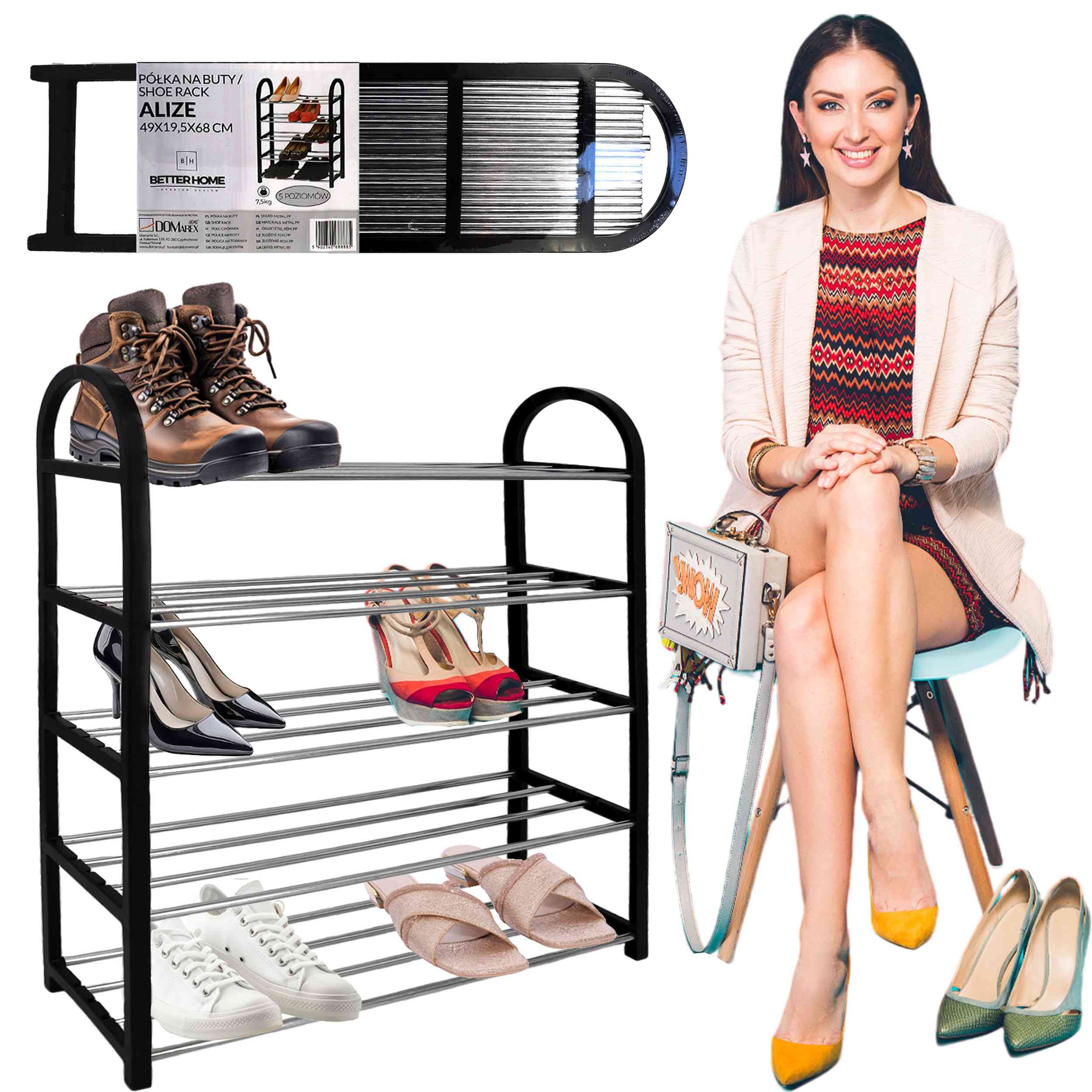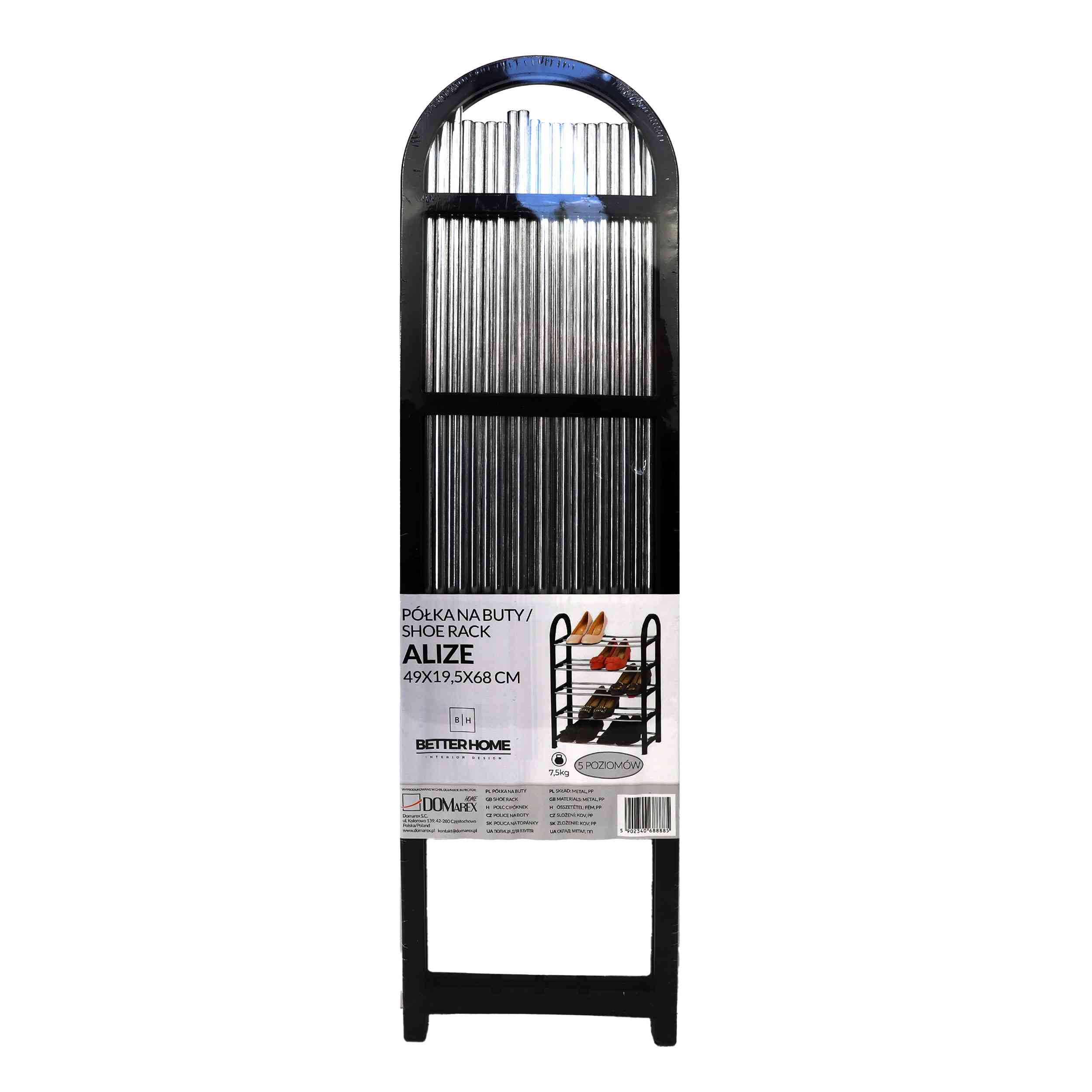 Wprowadź porządek do swojego przedpokoju lub sypialni dzięki naszej eleganckiej i funkcjonalnej półce na buty ALIZE. Przeznaczona do przechowywania obuwia, ta czarna, czteropoziomowa półka o wymiarach 49 cm szerokości, 19,50 cm głębokości i 68 cm wysokości, to idealne rozwiązanie do każdego wnętrza.