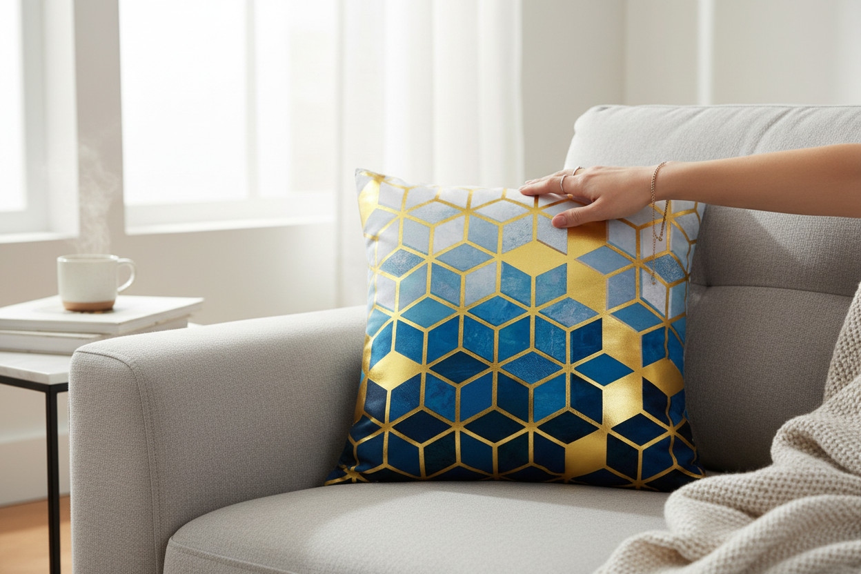 Designerska poszewka dekoracyjna wykonana z wysokiej jakości tkaniny typu VELVET zwaną w języku polskim jako WELUR o wyjątkowym splocie i gramaturze. Wyjątkowe geometryczne wzory bardzo czesto wystepujace na dodatkach aranżacji w tym sezonie.