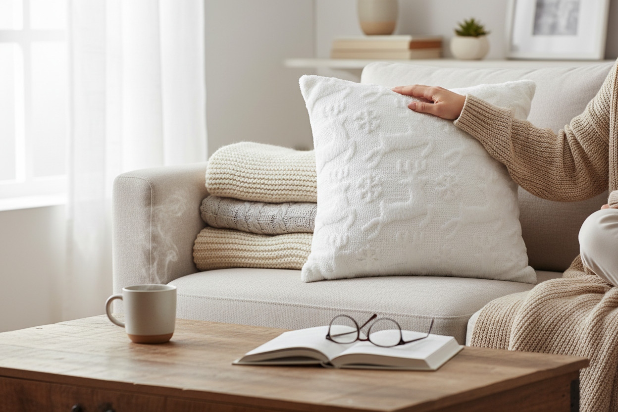 Z miękkimi kocami (np. mikroflanela, sherpa), lampkami, drewnem i szkłem — tworzy hygge-klimat w salonie i sypialni. Idealna na kanapę, fotel, łóżko oraz do sezonowych stylizacji (zima/święta).