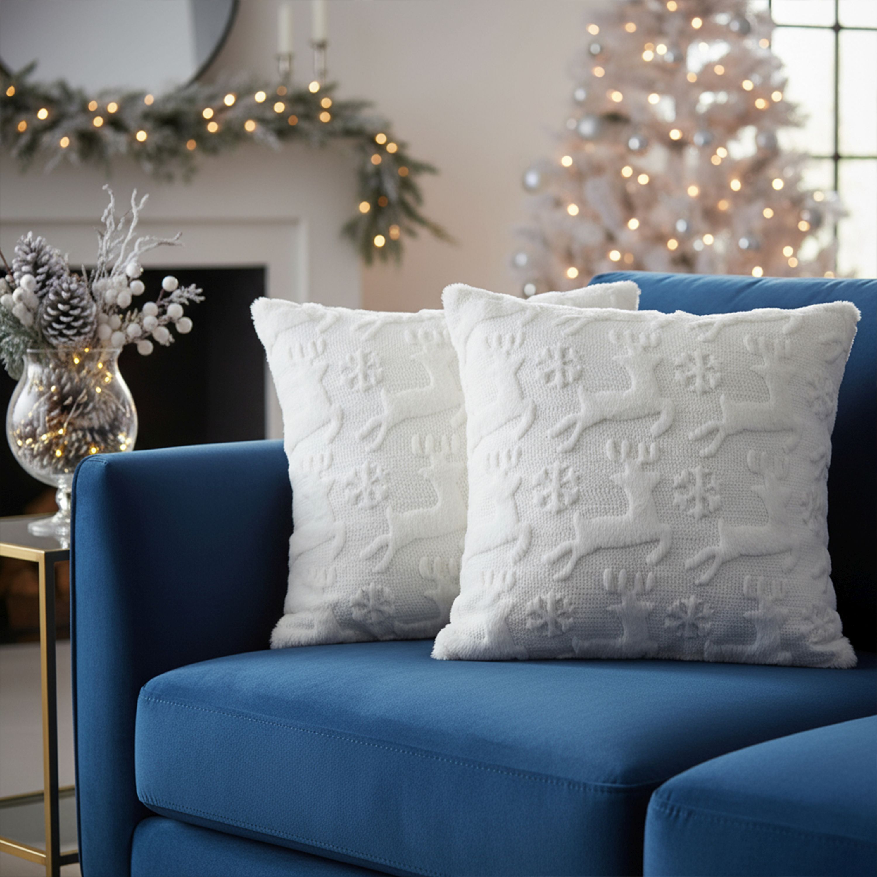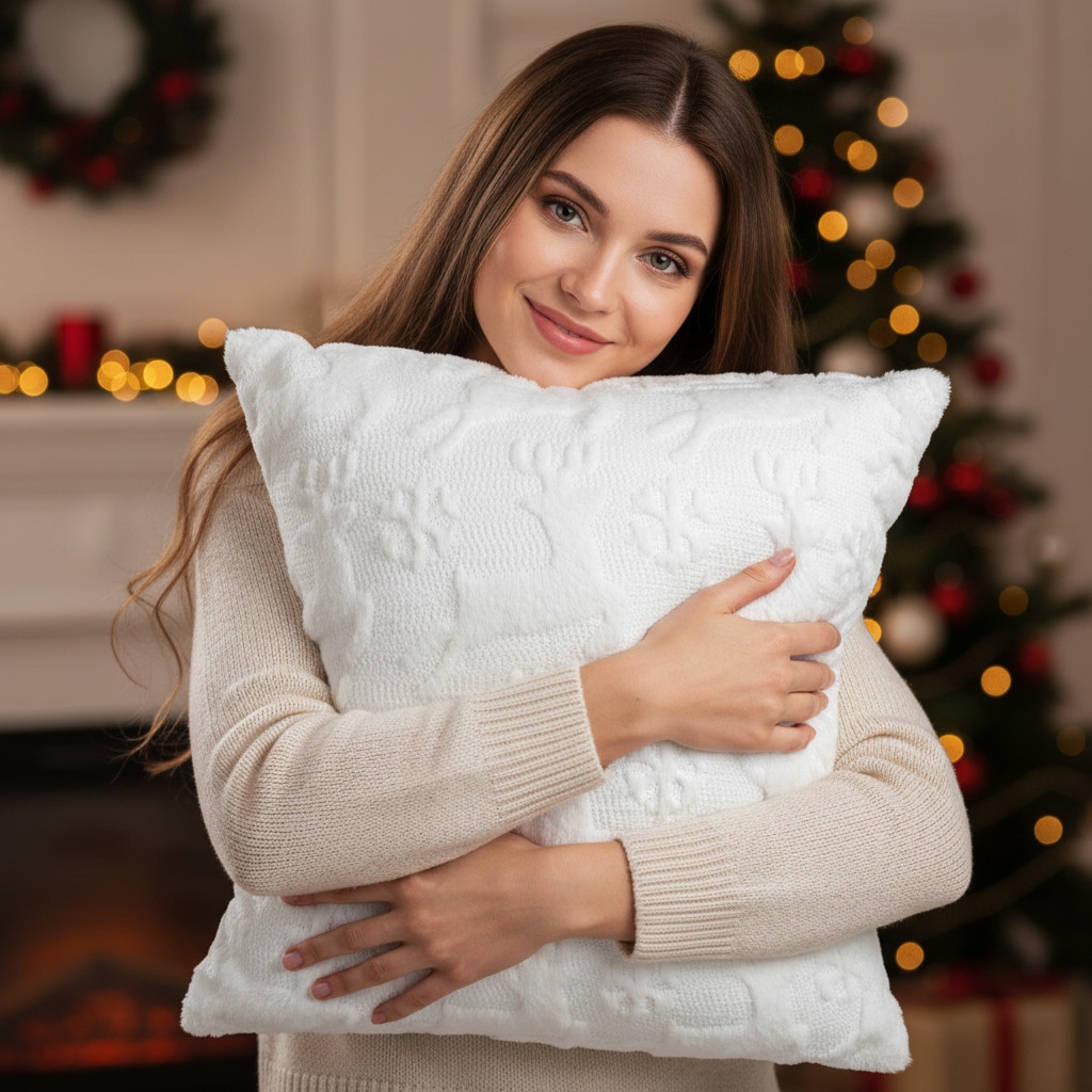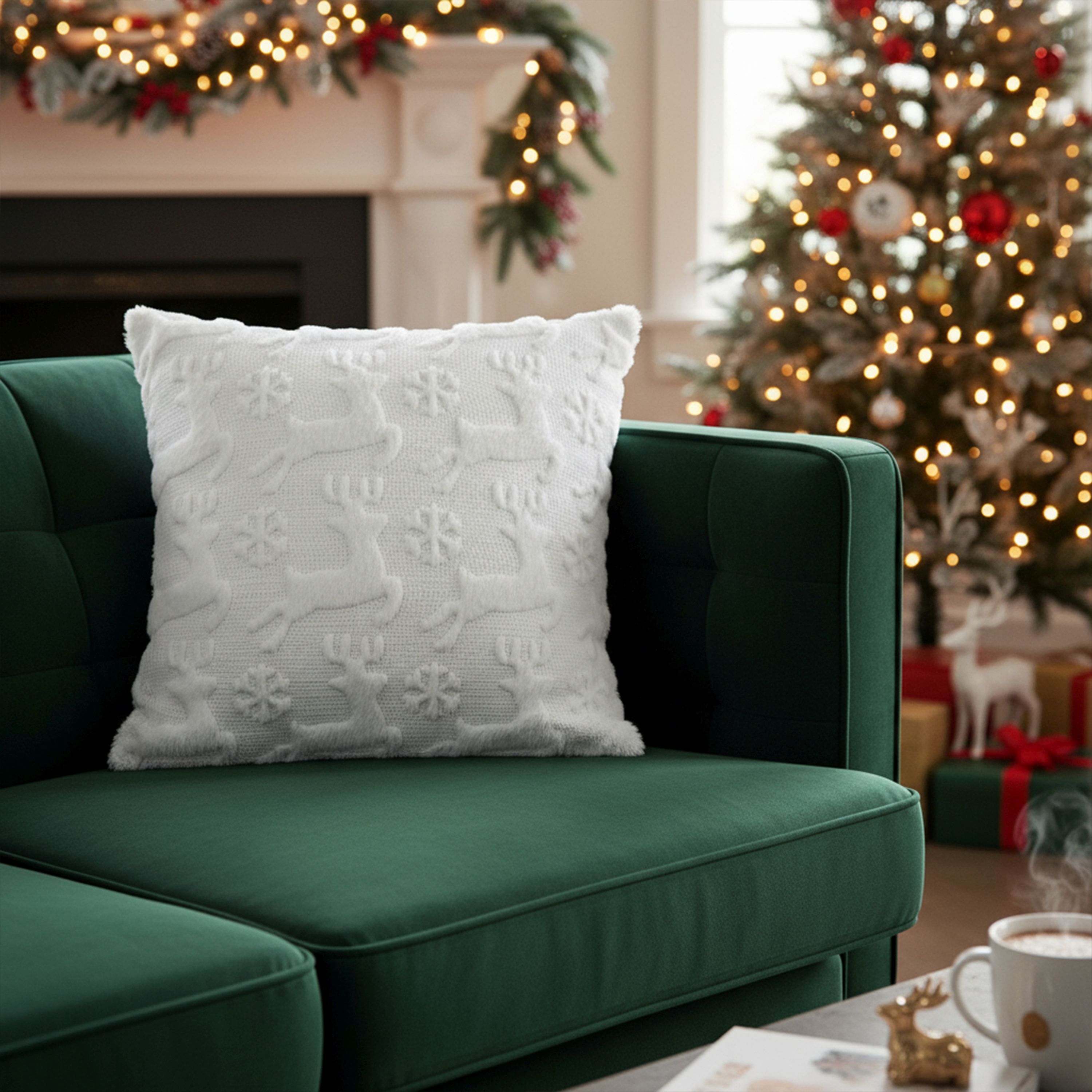 Wprowadź do wnętrza śnieżną miękkość i zimową magię. WINTER DREAM to puszysta poszewka z eko futra w kolorze czystej bieli, z wypukłym, wycinanym motywem jelonków/reniferów, który subtelnie rzeźbi fakturę i pięknie łapie światło. Dwustronne futerko (eko futro po obu stronach) zapewnia luksusowy dotyk z każdej strony, a kryty zamek sprawia, że wymiana wkładu jest szybka i niewidoczna.