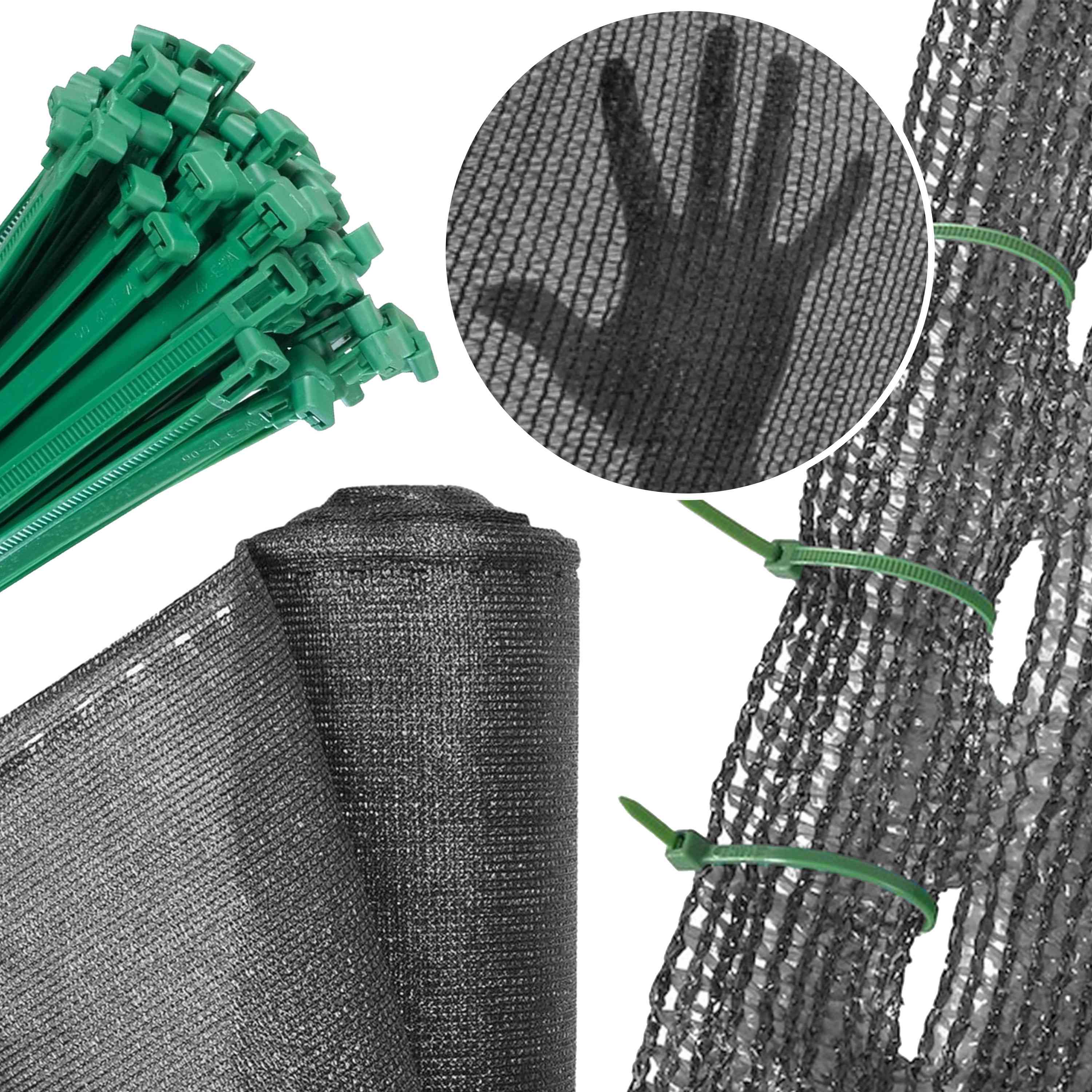 Siatka cieniująca i maskująca wykonana z wysokiej jakości HDPE, dostarczana w rolce o wymiarach 1,5m x 25m, wraz z 100 sztukami opasek zaciskowych.