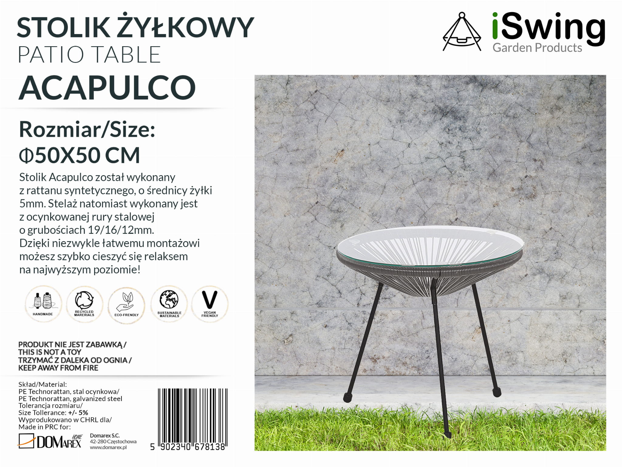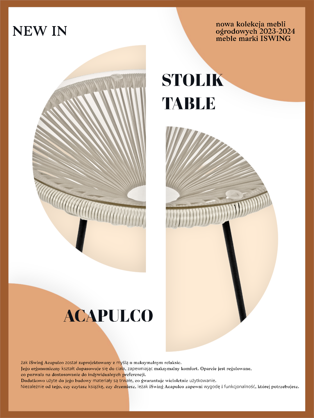 W połączeniu z fotelami i leżakami ACAPULCO, będzie idealnym rozwiązaniem dla miłośników spędzania wolnego czasu w ogrodzie lub na tarasie. Ergonomiczny kształt zapewni komfortowy wypoczynek a niewielkie rozmiary sprawią, że bez problemu zmieści się również na niewielkim balkonie umożliwiając relaks na świeżym powietrzu.