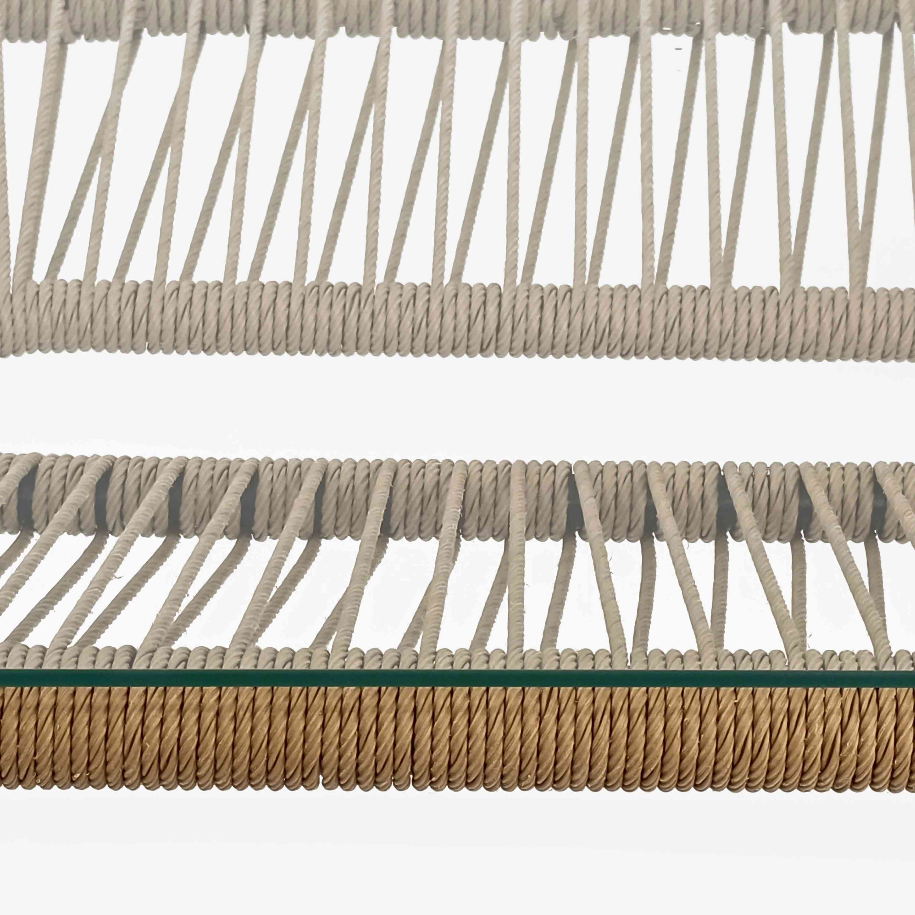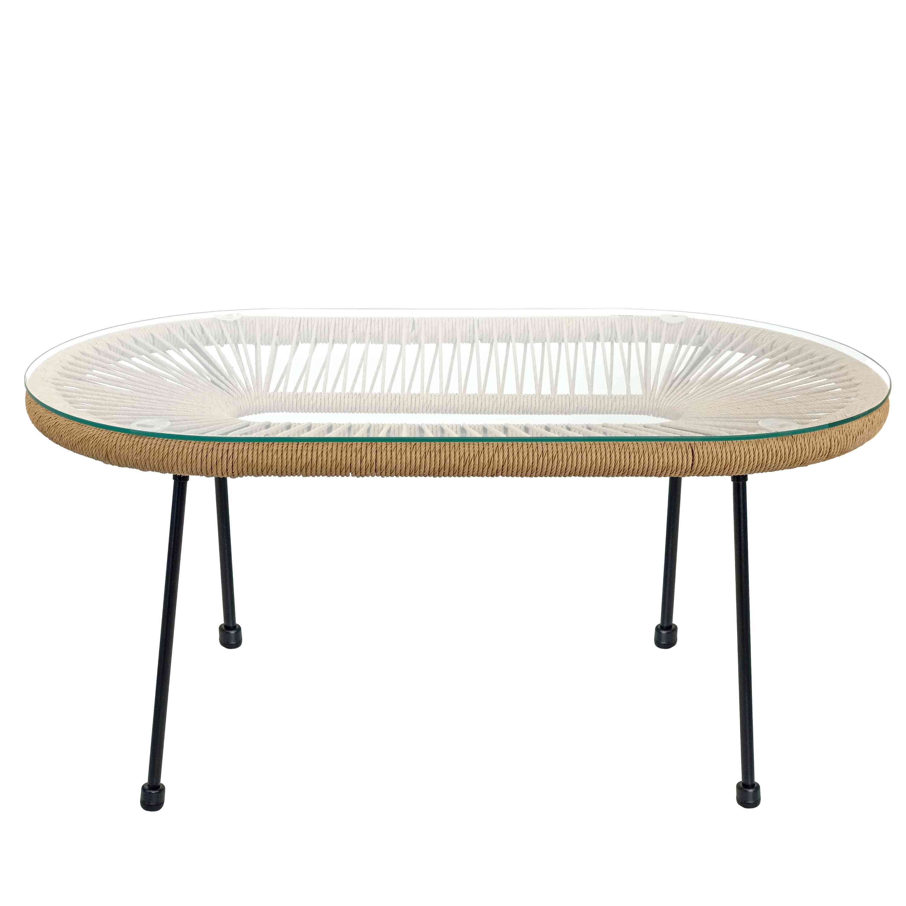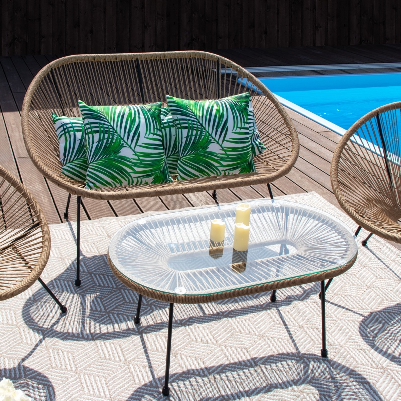 Stolik został wykonany z technorattanu o specjalnym splocie przypominającym sznurek, który nie tylko zapewnia komfort użytkowania, ale również świetnie prezentuje się na tle ogrodu, a nowoczesnym wyglądem ozdobi każdą przestrzeń. Całość wieńczy elegancki szklany blat. Atutem stolika jest również łatwość w pielęgnacji - wystarczy przetrzeć go wilgotną ściereczką.