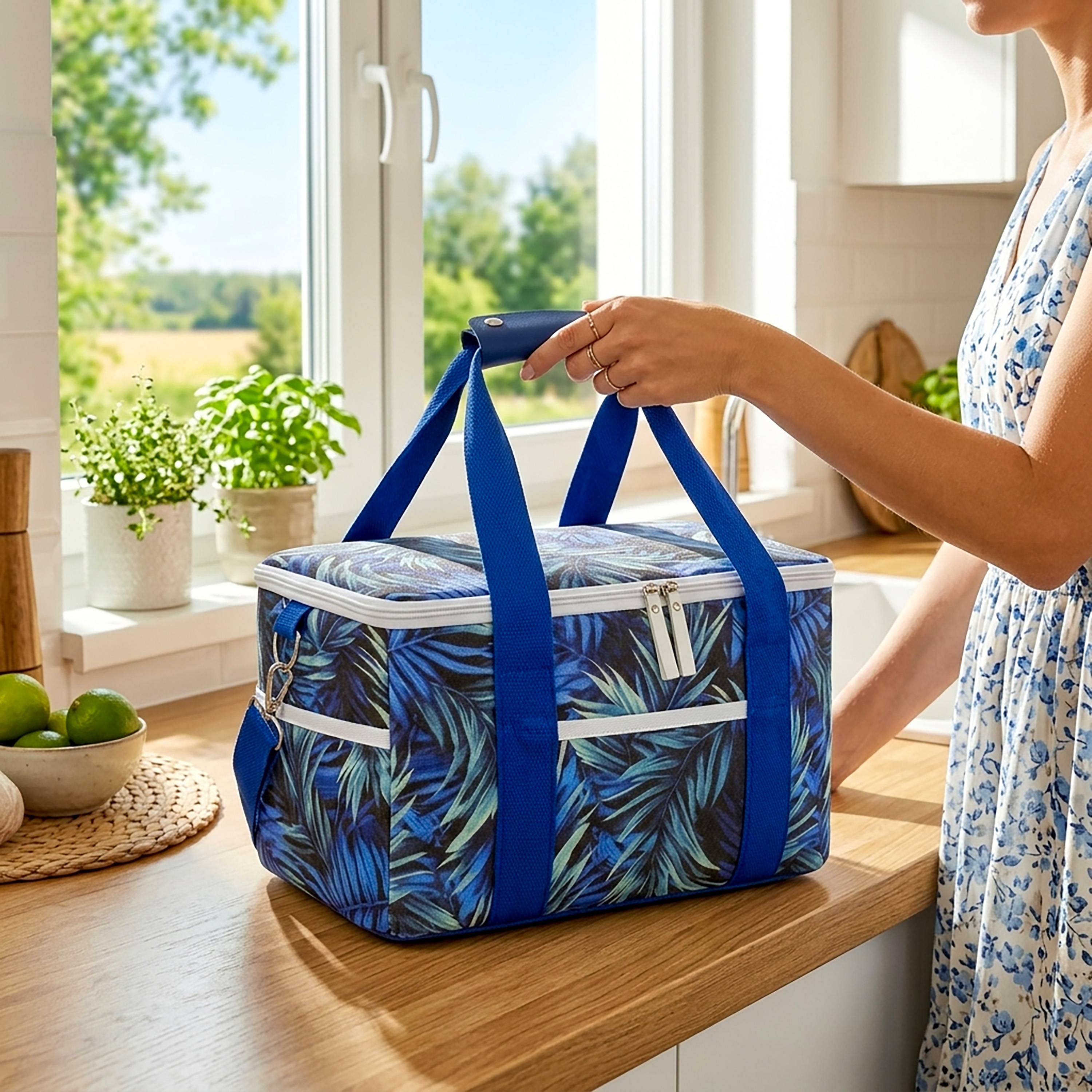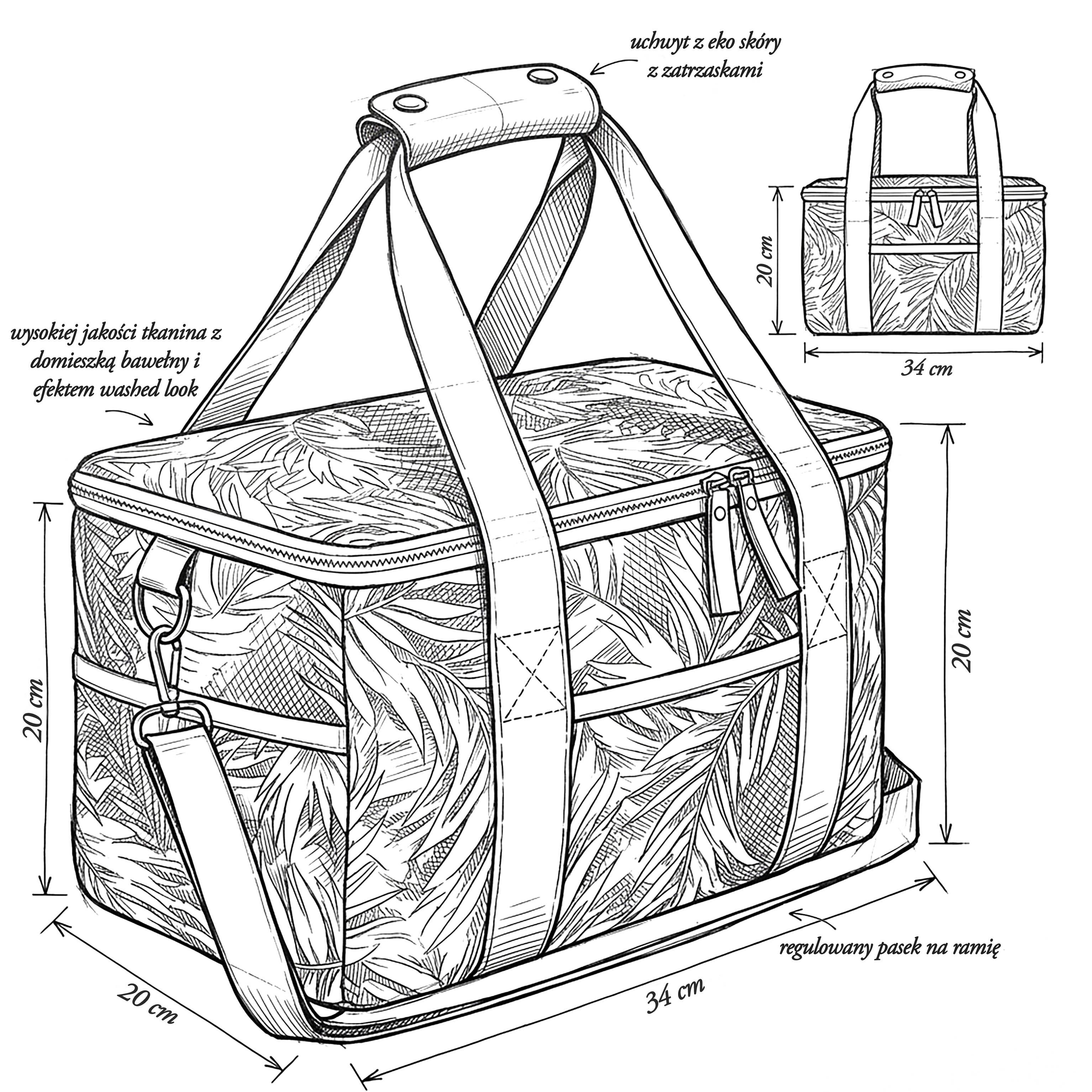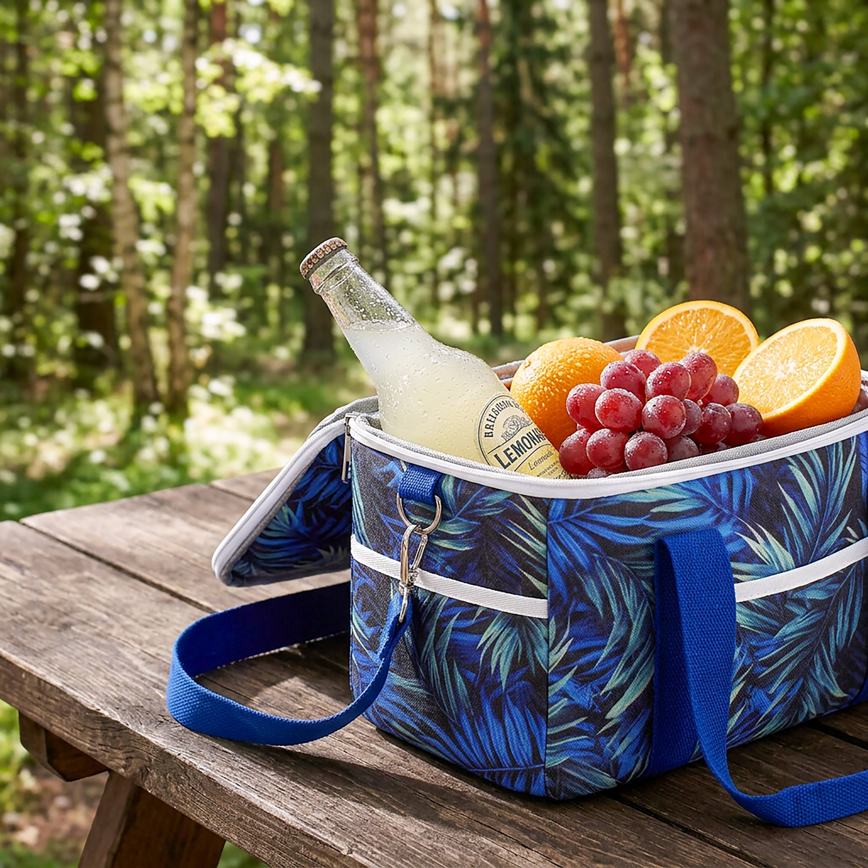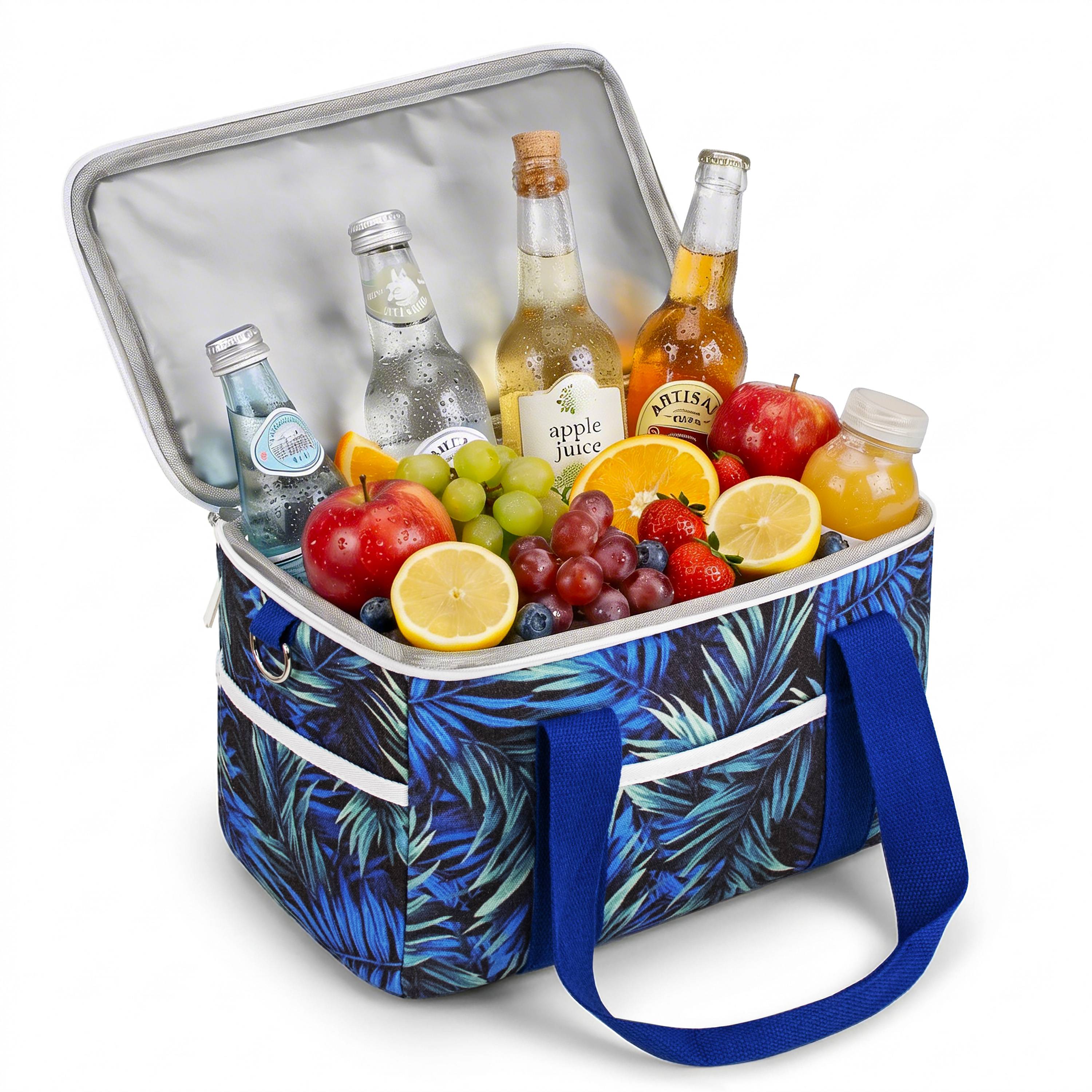 Pojemna torba termiczna o pojemności ok. 15 litrów – idealna na zakupy, piknik lub plażę.