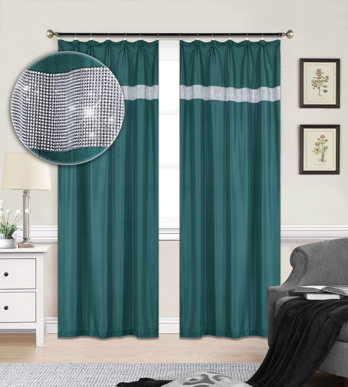 pasem ze srebrnymi cyrkoniami. Zasłona do salonów, sypialni, jadalni. Zasłona o
