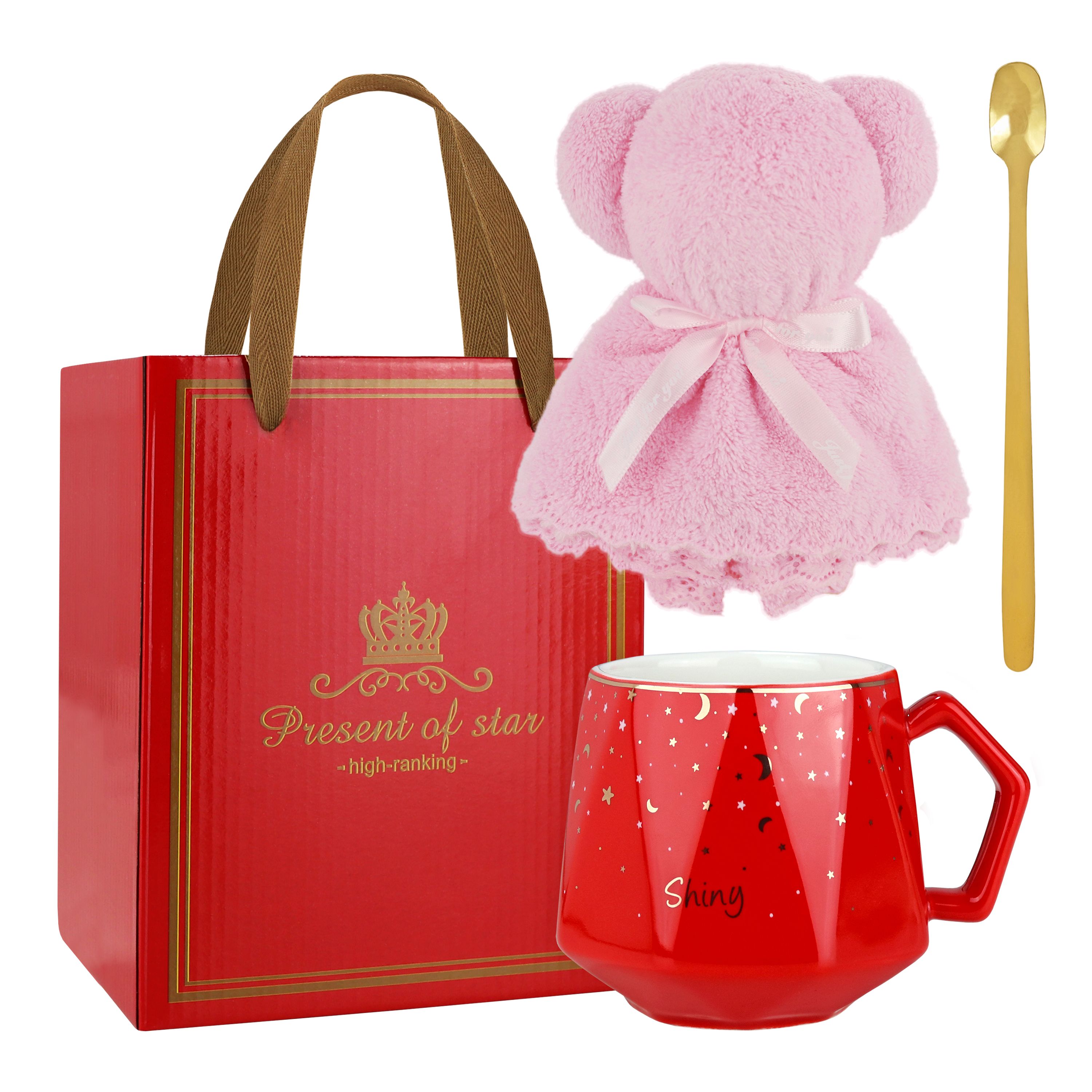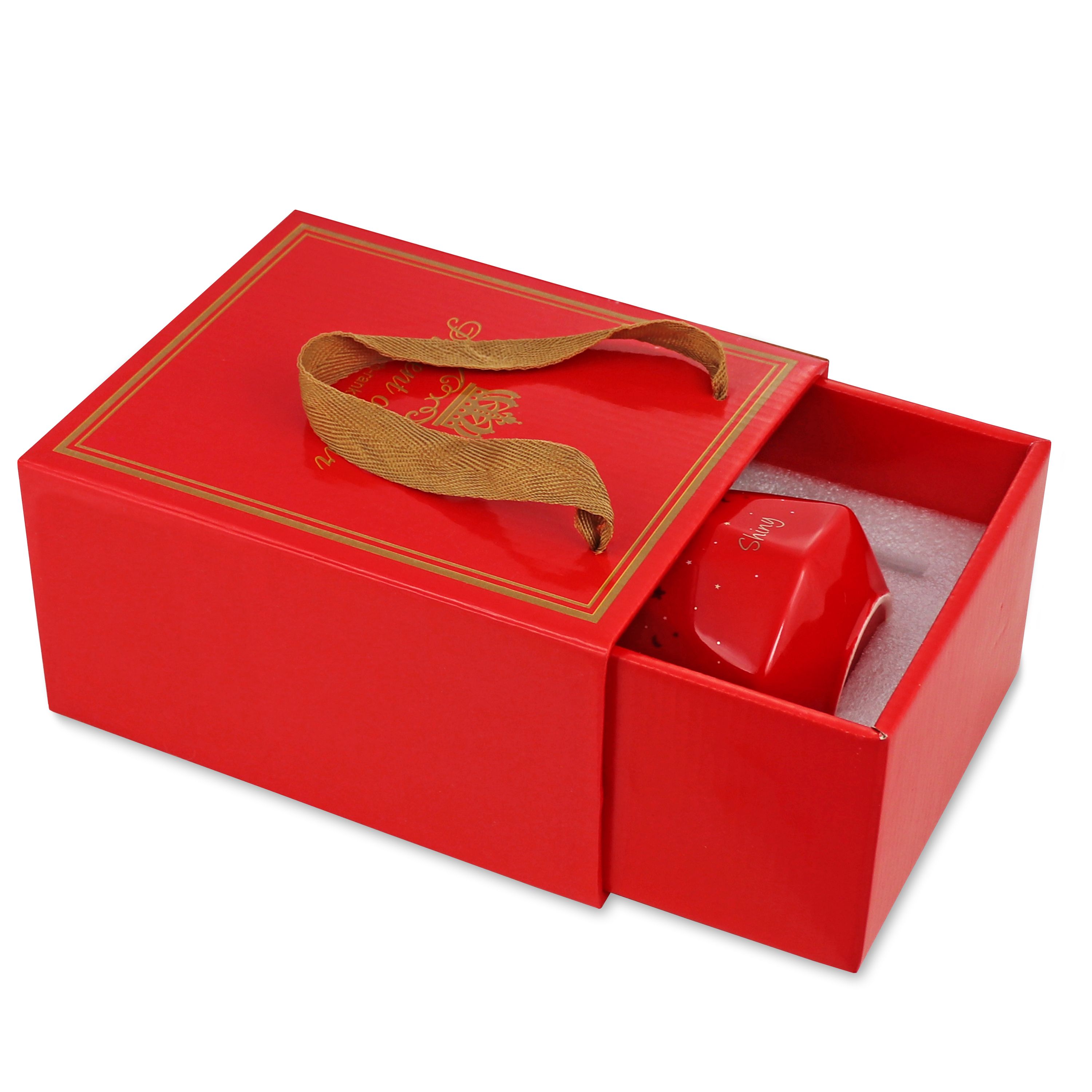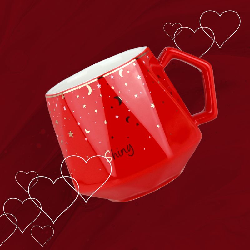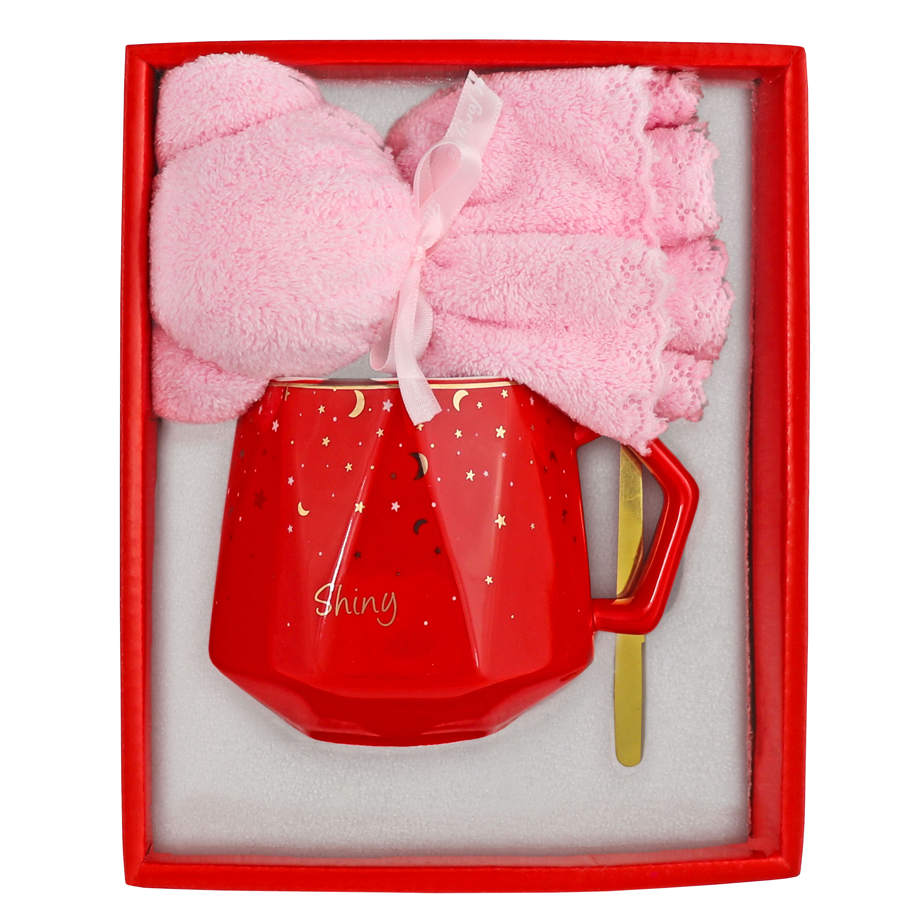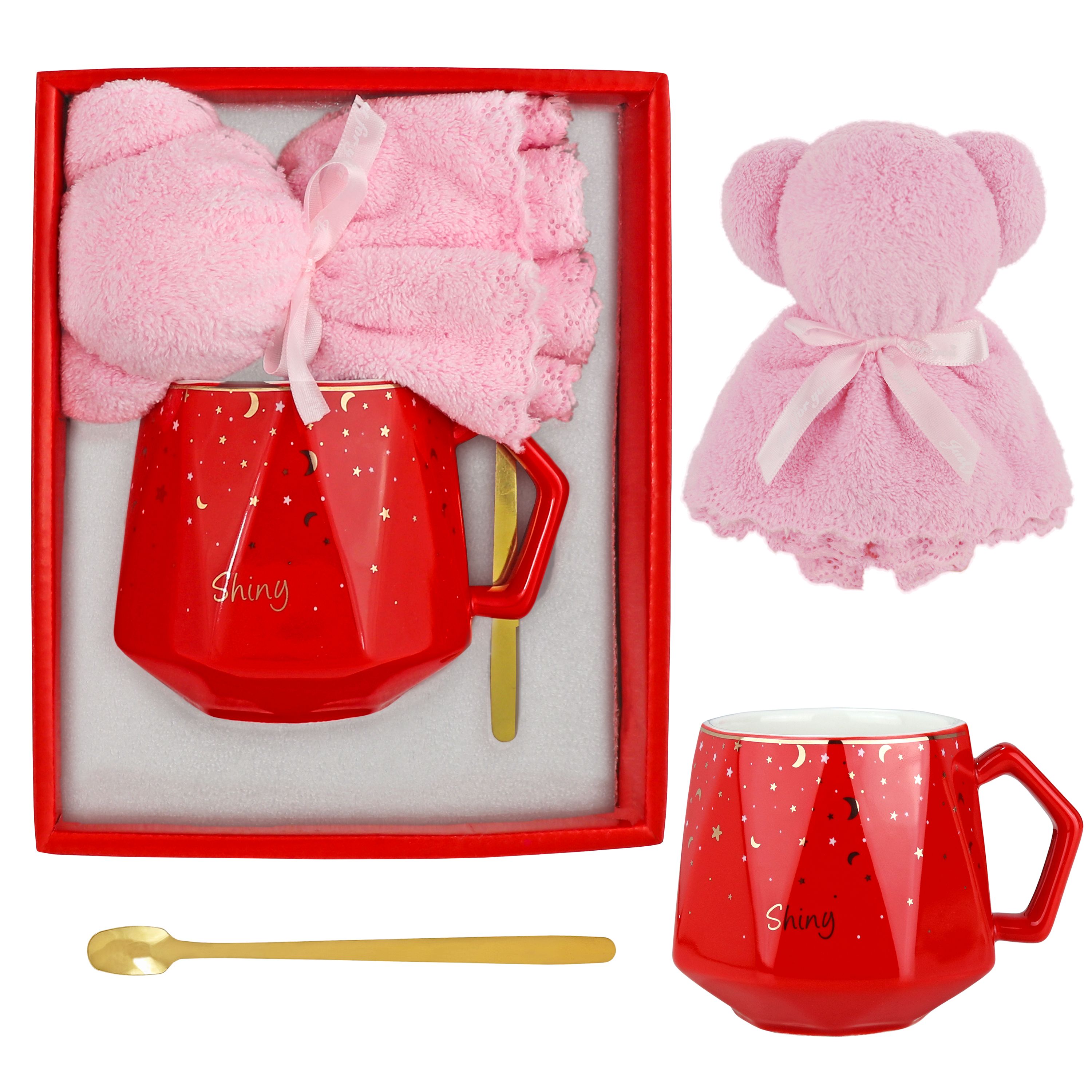 Głównym elementem zestawu jest czerwony kubek ceramiczny o pojemności 380 ml, z uroczym napisem „Shiny”. Kubek ten nie tylko prezentuje się elegancko, ale również jest praktycznym naczyniem do spożywania ulubionych napojów. Jego intensywny czerwony kolor i subtelne zdobienia nadają mu uroku i charakteru.