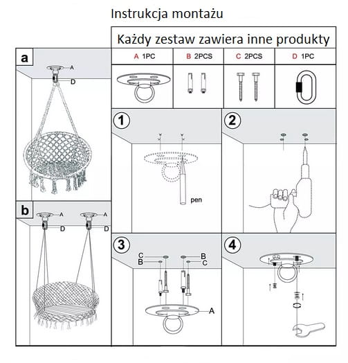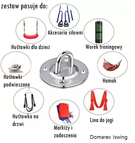 Słowa kluczowe: zestaw montażowy do huśtawki, montaż huśtawki w domu, mocowanie huśtawki, zestaw montażowy huśtawki na zewnątrz, uchwyt sufitowy do huśtawki, montaż hamaka, krzesło brazylijskie, montaż na betonie i drewnie, mocne mocowanie huśtawki.