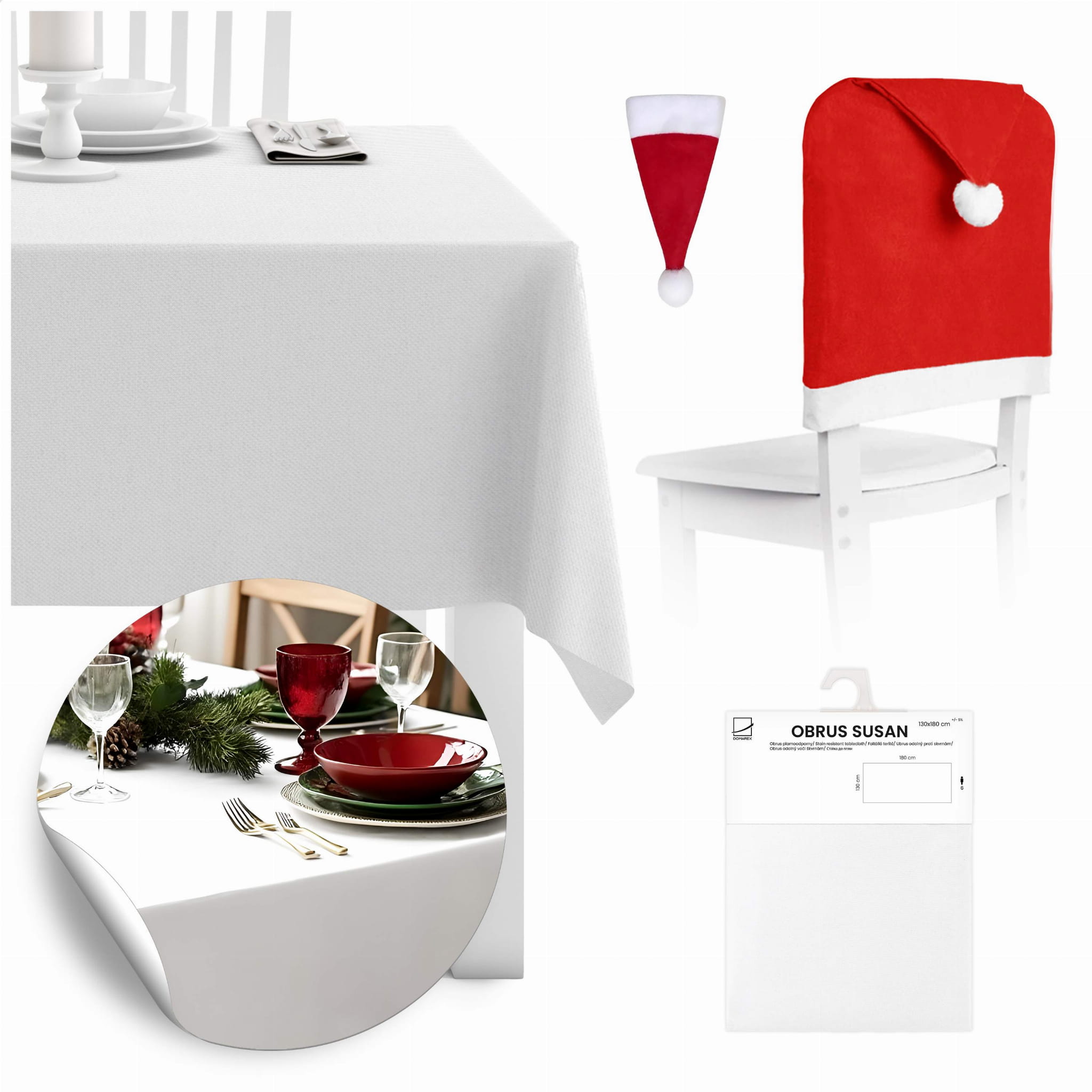 - Biały obrus "Susan" 130x180 cm – Elegancki, biały obrus, który doskonale nadaje się na stół w czasie Świąt, wesel czy innych uroczystości. Jego klasyczny wygląd pasuje do różnych aranżacji stołów i z pewnością wprowadza elegancki, a zarazem przytulny klimat.