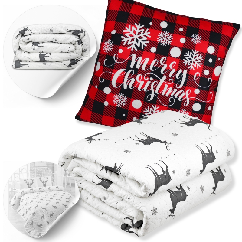 Obustronna narzuta MERRY 200x200 cm – elegancka narzuta w białym kolorze, z subtelnym wzorem grafitowych reniferów, która doskonale wpasowuje się w zimową, świąteczną aurę. Obustronny materiał pozwala na łatwą zmianę wyglądu sypialni w zależności od nastroju – po jednej stronie dominują renifery na białym tle, po drugiej stronie natomiast pojawiają się spokojne, geometryczne wzory. Narzuta ma idealny rozmiar 200x200 cm, co czyni ją perfekcyjnym wyborem na łóżko małżeńskie, zapewniając zarówno estetykę, jak i wygodę.