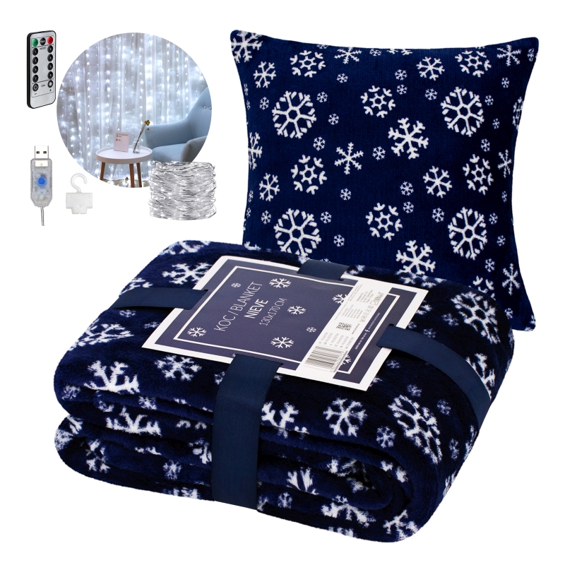Do kompletu dodaliśmy dekoracyjną poszewkę NIEVE 40x40 cm, której granatowy kolor perfekcyjnie współgra z kocem, tworząc harmonijną i stylową kompozycję. Zestaw dopełnia Kurtyna LED 3x3 m – idealna dekoracja okienna, która dzięki subtelnym światełkom doda magicznego blasku i zimowej atmosfery.