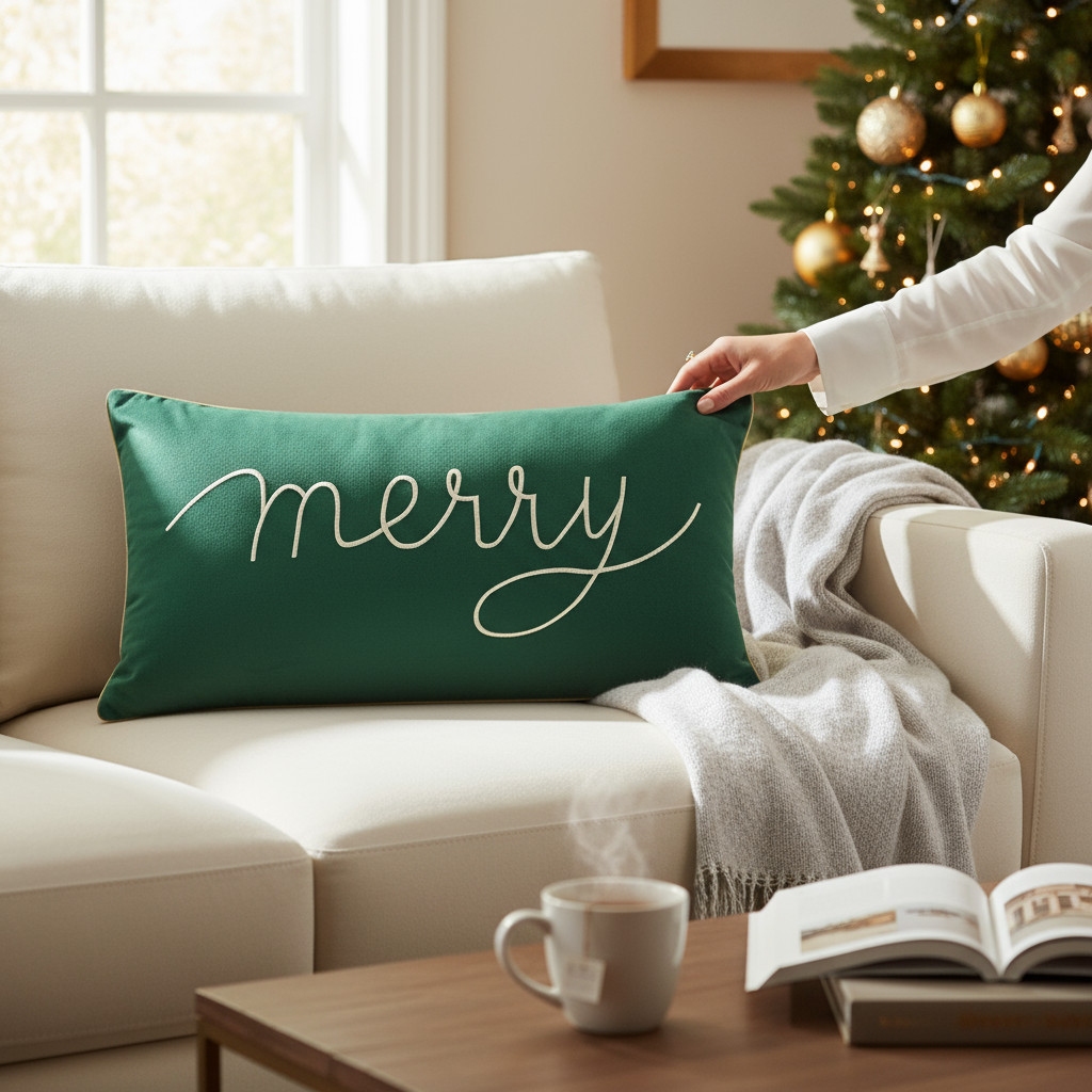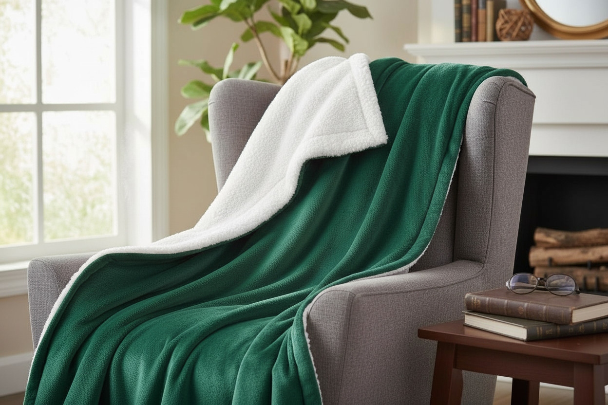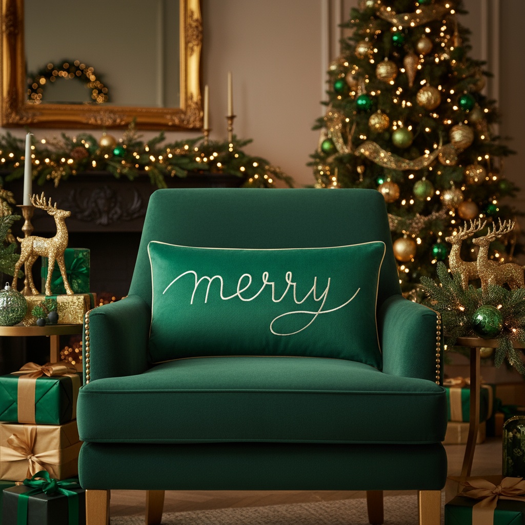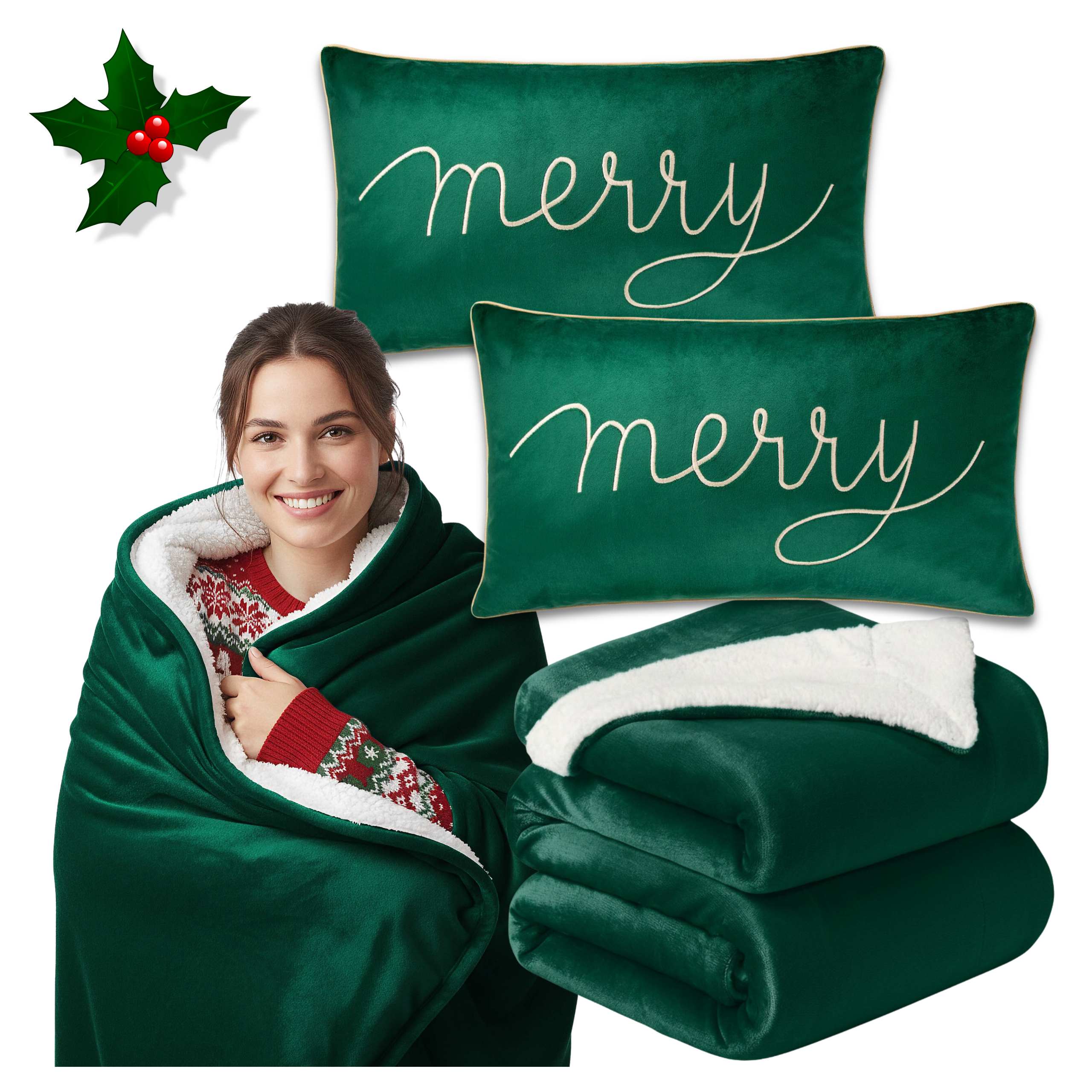 Głęboka zieleń poszewek idealnie komponuje się z kolorem koca, tworząc wyjątkowy, harmonijny zestaw świąteczny.
