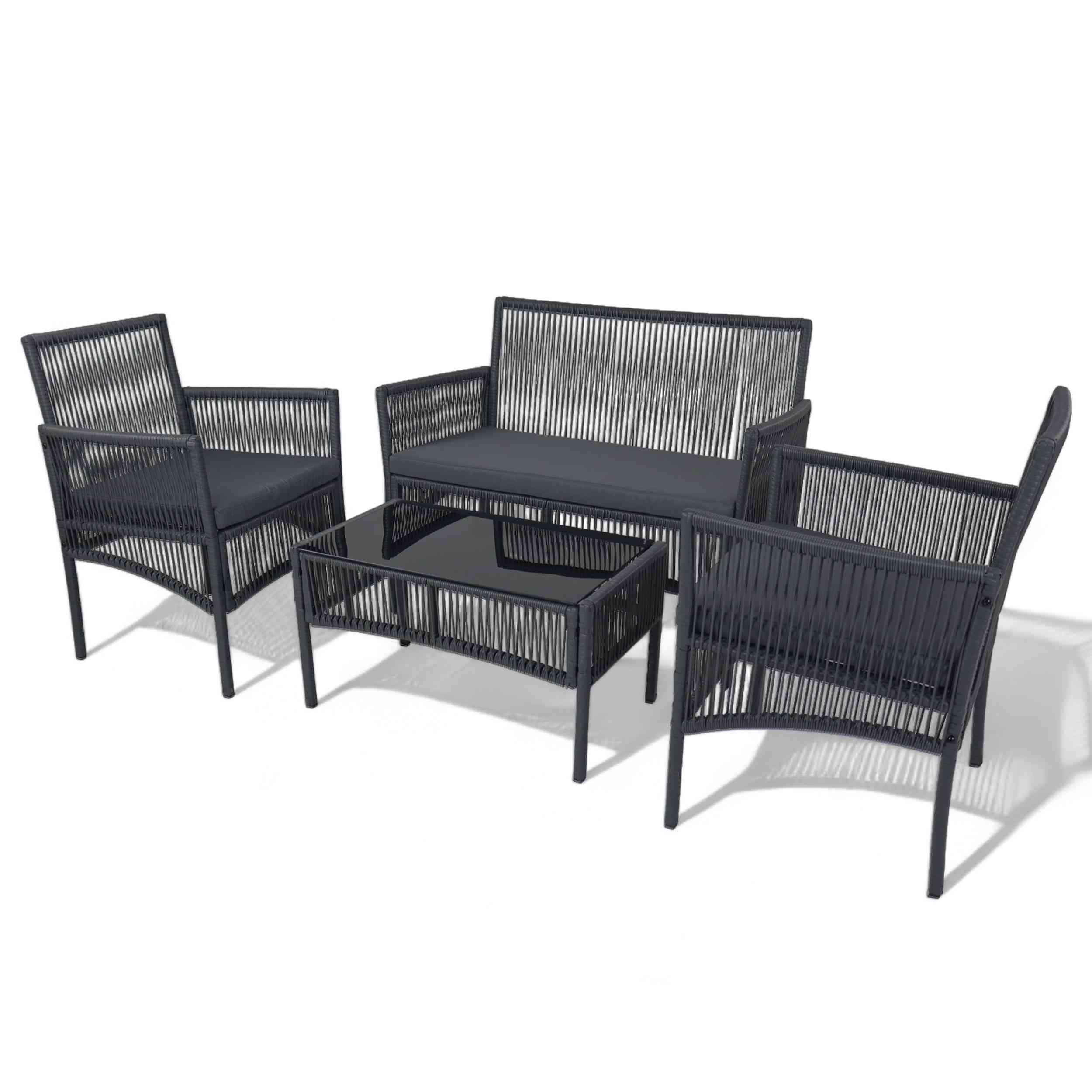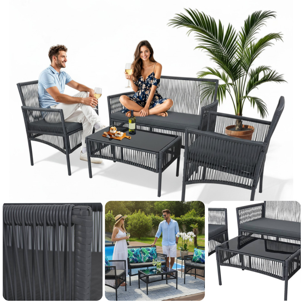 Centralnym elementem zestawu jest elegancki stolik z czarnym szklanym blatem, który dodaje całości nowoczesnego charakteru i świetnie sprawdzi się podczas letnich spotkań przy kawie lub lampce wina.